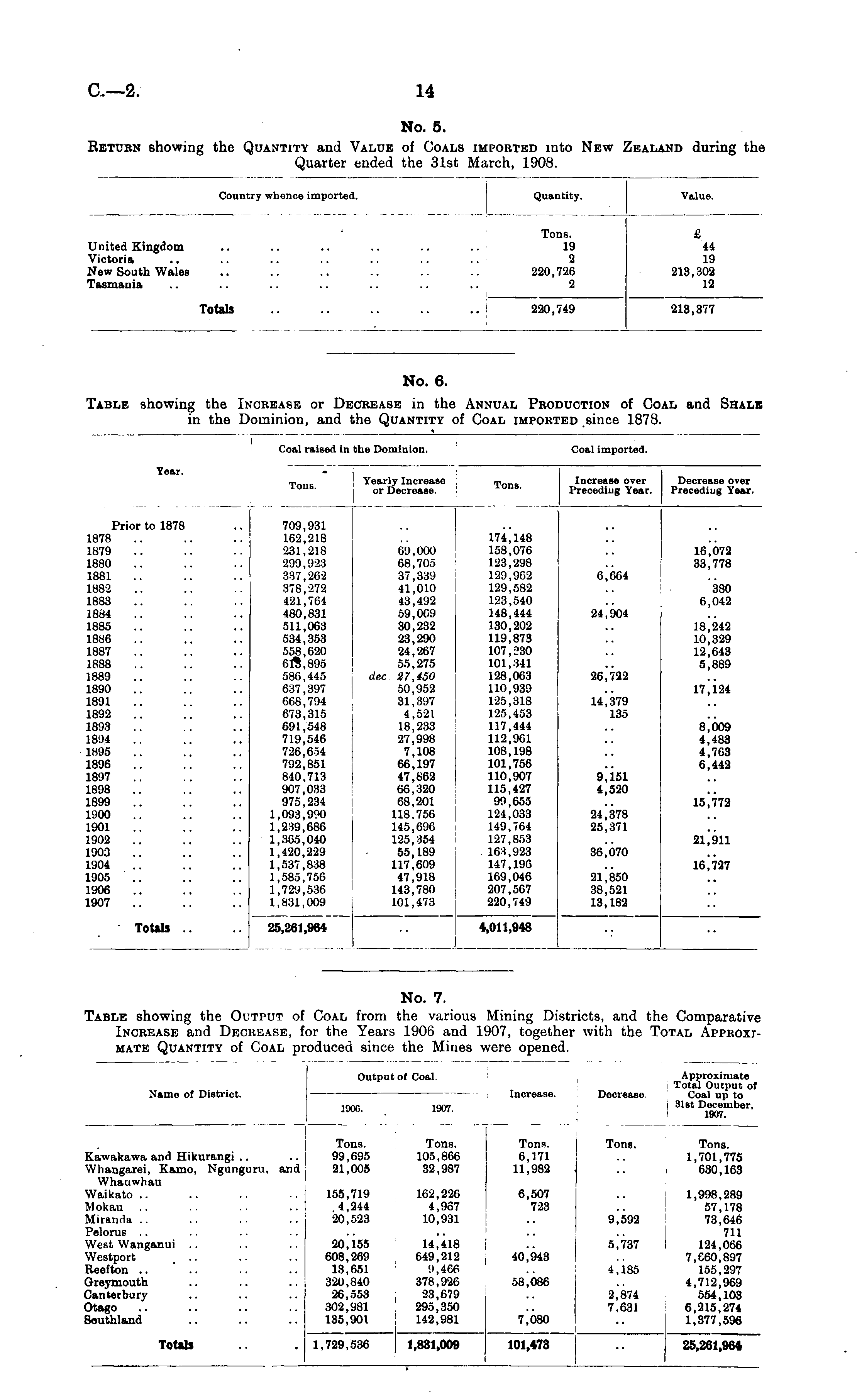 No. 5. Return showing the Quantity and Value of Coals imported into New Zealand during the Quarter ended the 31st March, 1908.