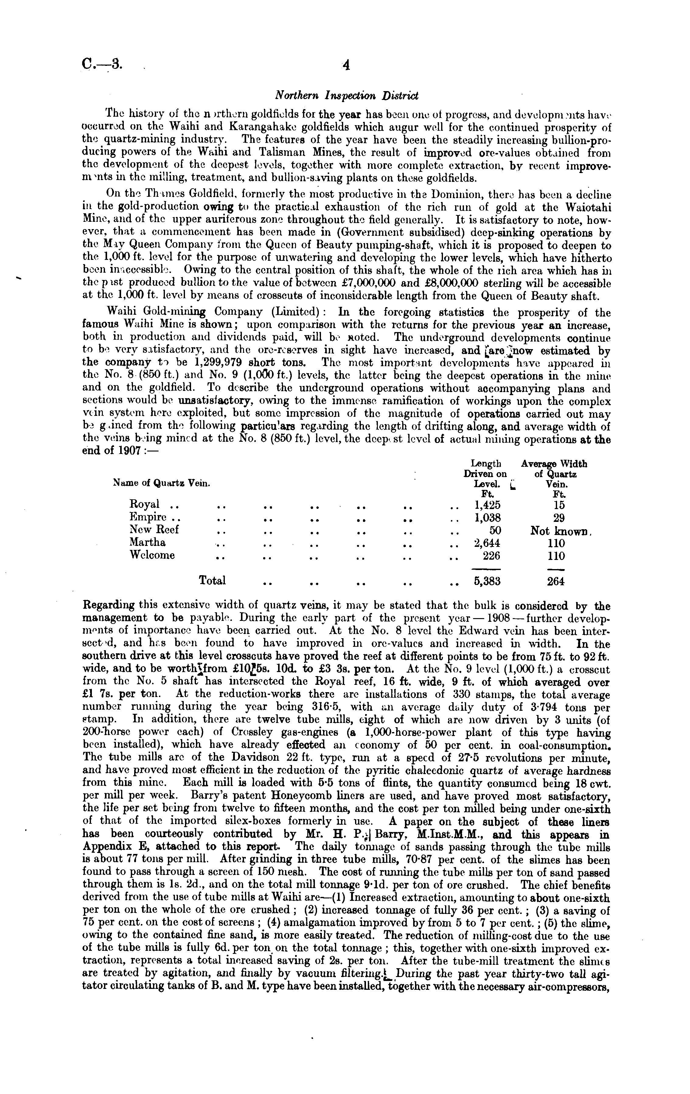 Northern Inspection District I'lie history oi the n irthern goldfields foi the year has been one oi progress, and developm -uts ha v. occurred on the Waihi and Karangahake goldfields which augur well lor the continued prosperity of the quartz-mining industry. The features of the year have been the steadily increasing bullion-pro-ducing powers of the Waihi and Talisman Mines, the result of improved ore-values obtained from the development of the deepest levels, together with more complete extraction, by recent improvein nts in the milling, treatment, and bullion-swing plants on these goldfields. On th ■ Th lines Goldfield. formerly the most productive in the Dominion, there has been a decline ii the gold-production owing to the practical exhaustion of the rich run of gold at the Waiotahi Mine, and of the upper auriferous zon ■ throughout the field generally. It is satisfactory to note, however, that a commencement has been made in (Government subsidised) deep-sinking operations by th' M, v Queen Company from the Queen of Beauty pumping-shaft, which it is proposed to deepen to the 1,000 ft. level for the purpose of unwatering and developing the lower levels, which have hitherto b.en inaccessible. Owing to the central position of this shaft, the whole of the rich area which has in thepist produced bullion to the value of between £7,000,000 and £8,000,000 sterling will be accessible at the 1,000 ft. level by means of crosscuts of inconsiderable length from the Queen of Beauty shaft. Waihi Gold-mining Company (Limited) : In the foregoing statistics the prosperity of the famous Waihi Mine is shown; upon comparison with the retains for the previous year an increase, both in production and dividends paid, will h Noted. The underground developments continue to be very satisfactory, and the ore-r serves in sight have increased, estimated by the company to be 1,299,979 short tons. The most important developments have appeared in the No. 8 (850 ft.) and No. 9 (1,000 ft.) levels, the latter being the deepest operations in the mine and on the goldfield. To describe the underground operations without accompanying plans and sections would be unsatisfactory, owing to the immense ramification of workings upon the complex Vein system hie exploited, but some impression of the magnitude of operations carried out may b ■ g.iued from th- following particu'ars regarding the length of drifting along, and average width of the veins b ing mined at the No. 8 (850 ft.) level, the deep* st level of actual mining operations at the end of 1907 :— Length Average Width Driven on of Quartz Name of Quartz Vein. Level. £, Vein. Ft. Ft. Royal .. .. .. .. .. .. .. 1,425 15 Empire .. .. .. .. .. .. 1,038 29 New Reef .. .. .. .. .. .. 50 Not known, Martha .. .. .. .. .. .. 2,644 110 Welcome .. .. .. .. .. ..226 110 Total .. .. .. .. .. 5,383 264 Regarding this extensive width of quartz veins, it may be stated that the, bulk is considered by the management to be payable. During the early part of the present year —1908 — further developin aits of importance have been carried out. At the No. 8 level the Edward vein has been intersect <!. and has been found to have improved in ore-values and increased in width. In the southern drive at this level crosscuts have proved the reef at different points to be from 75 ft. to 92 ft. wide, and to be worthVfrom £10£5s. lOd. to £3 3s. per ton. At the No. 9 level (1,000 ft.) a crosscut from the No. 5 shaft has intersected the Royal reef, 16 ft. wide, 9 ft. of which averaged over £1 7s. per ton. At the reduction-works there are installations of 330 stamps, the total average number running during the year being 316-5, with an average daily duty of 3-794 tons per stamp. In addition, there are twelve tube mills, eight of which are now driven by 3 units (of 200-Tiorse power each) of Crossley gas-engines (a 1,000-horse-power plant of this type having been installed), which have already effected an economy of 50 per cent, in coal-consumption. The tube mills arc of the Davidson 22 ft. type, run at a speed of 27-5 revolutions per minute, and have proved most efficient in the reduction of the pyritic chalccdonie quartz of average hardness from this mine. Each mill is loaded with 5-5 tons of flints, the quantity consumed being 18 cwt. per mill per week. Barry's patent Honeycomb liners are used, and have proved most satisfactory, the life per set being from twelve to fifteen months, and the cost per ton milled being under one-sixth of that of the imported silex-boxes formerly in use. A paper on the subject of these liners has been courteously contributed by Mr. H. P..| Barry, Mlnst.M.M., and this appears in Appendix E, attached to this report. The daily tonnage of sands passing through the tube mills is about 77 tons per mill. After giinding in three tube mills, 70-87 per cent, of the slimes has been found to pass through a screen of 150 mesh. The cost of running the tube milk per ton of sand passed through them is Is. 2d., and on the total mill tonnage 9-ld. per ton of ore crushed. The chief benefits derived from the use of tube mills at Waihi an —(1) Increased extraction, amounting to about one-sixth per ton on the whole of the ore crushed ; (2) increased tonnage of fully 36 per cent. ; (3) a saving of 75 per cent, on the cost of screens ; (4) amalgamation improved by from sto 7 per cent.; (5) the slime, owing to the contained fine sand, is more easily treated. The reduction of milling-cost due to the use of the tube mills is fully 6d. per ton on the total tonnage ; this, together with one-sixth improved extraction, represents a total increased saving of 2s. per ton. After the tube-mill treatment the shims are treated by agitation, and finally by vacuum filtering.<_ During the past year thirty-two tall agitator circulating tanks of B. and M. type have been installed, together with the necessary air-compressors,