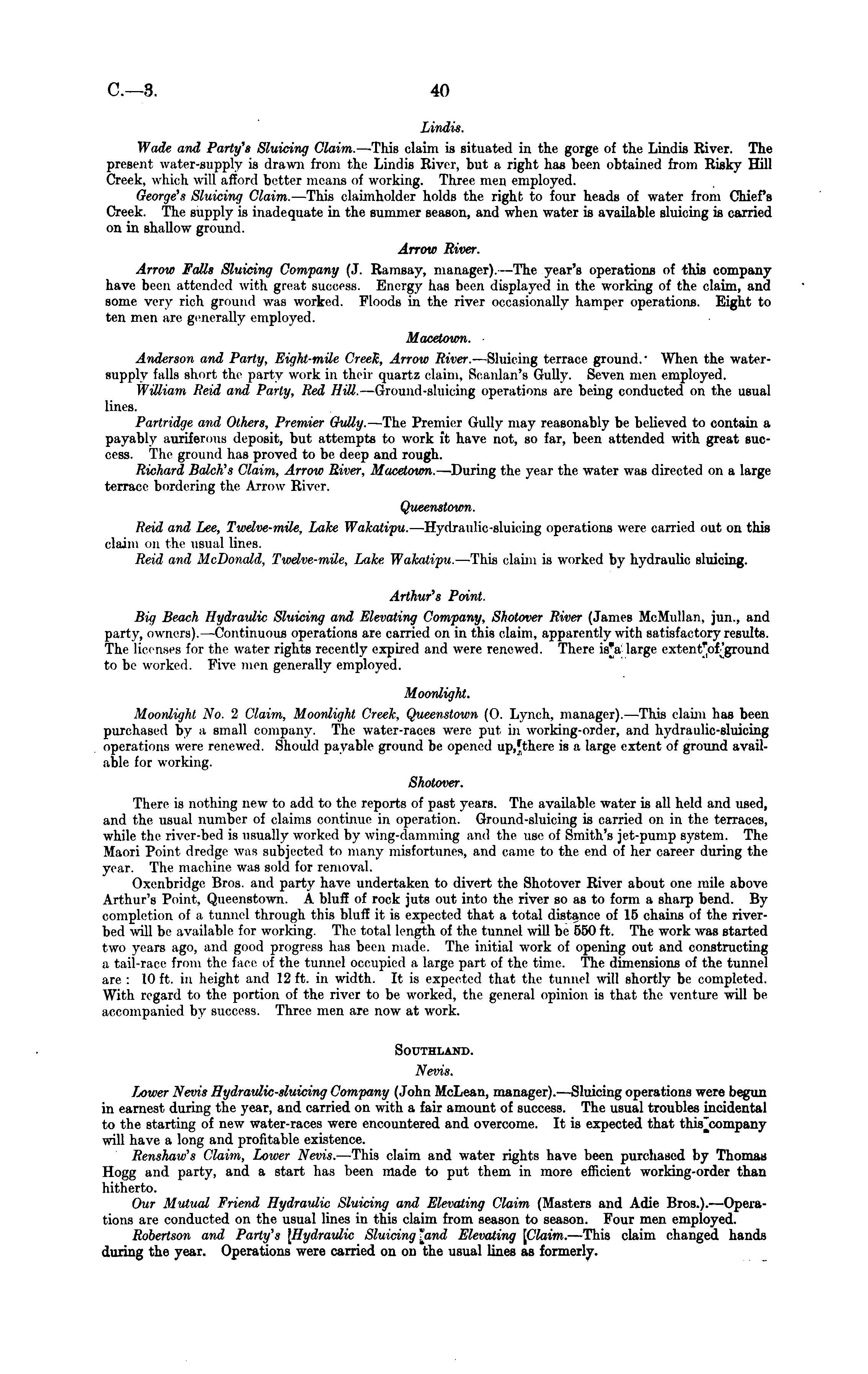 Lindis. Wade and Party's Sluicing Claim. —-This claim is situated in the gorge of the Lindis River. The present water-supply is drawn from the Lindis River, but a right has been obtained from Risky Hill Creek, which will afford better means of working. Three men employed. George's Sluicing Claim. —This claimholder holds the right to four heads of water from Chief's Creek. The supply is inadequate in the summer season, and when water is available sluicing is carried on in shallow ground. Arrow River. Arrow Falls Sluicing Company (J. Ramsay, manager). —The year's operations of this company have been attended with great success. Energy has been displayed in the working of the claim, and some very rich ground was worked. Floods in the river occasionally hamper operations. Eight to ten men are generally employed. Macetown. Anderson and Party, Eight-mile Creek, Arrow River. —Sluicing terrace ground.' When the watersupply falls short the party work in their quartz claim, Scanlan's Gully. Seven men employed. William Reid and Parly, Red Hill. —Ground-sluicing operations are being conducted on the usual lines. Partridge and Others, Premier Gutty. —The Premier Gully may reasonably be believed to contain a payably auriferous deposit, but attempts to work it have not, so far, been attended with great success. The ground has proved to be deep and rough. Richard Balch's Claim, Arrow River, Macetown. —During the year the water was directed on a large terrace bordering the Arrow River. Queenstown. Reid and Lee, Twelve-mile, Lake Wakatipu. —Hydraulic-sluicing operations were carried out on this claim on the usual lines. Reid and McDonald, Twelve-mile, Lake Wakatipu. —This claim is worked by hydraulic sluicing. Arthur's Point. Big Beach Hydraulic Sluicing and Elevating Company, Shotover River (James McMullan. jun., and party, owners). —Continuous operations arc carried on in this claim, apparently with satisfactory results. The licenses for the water rights recently expired and were renewed. There large to be worked. Five men generally employed. Moonlight. Moonlight No. 2 Claim, Moonlight Creek, Queenstown (0. Lynch, manager). —-This claim has been purchased by a small company. The water-races were put in working-order, and hydraulic-sluicing operations were renewed. Should payable ground be opened is a large extent of ground available for working. Shotover. There is nothing new to add to the reports of past years. The available water is all held and used, and the usual number of claims continue in operation. Ground-sluicing is carried on in the terraces, while the river-bed is usually worked by wing-damming and the use of Smith's jet-pump system. The Maori Point dredge was subjected to many misfortunes, and came to the end of her career during the year. The machine was sold for removal. Oxenbridge Bros, and party have undertaken to divert the Shotover River about one mile above Arthur's Point, Queenstown. A bluff of rock juts out into the river so as to form a sharp bend. By completion of a tunnel through this bluff it is expected that a total distance of 15 chains of the riverbed will be available for working. The total length of the tunnel will be 550 ft. The work was started two years ago, and good progress has been made. The initial work of opening out and constructing a tail-race from the face of the tunnel occupied a large part of the time. The dimensions of the tunnel are : 10 ft. in height and 12 ft. in width. It is expected that the tunnel will shortly be completed. With regard to the portion of the river to be worked, the general opinion is that the venture will be accompanied by success. Three men are now at work. Southland. Nevis. Lower Nevis Hydraulic-sluicing Company (John McLean, manager).—Sluicing operations were begun in earnest during the year, and carried on with a fair amount of success. The usual troubles incidental to the starting of new water-races were encountered and overcome. It is expected that will have a long and profitable existence. Renshaw's Claim, Lower Nevis. —This claim and water rights have been purchased by Thomas Hogg and party, and a start has been made to put them in more efficient working-order than hitherto. Our Mutual Friend Hydraulic Sluicing and Elevating Claim (Masters and Adie Bros.). —Operations are conducted on the usual lines in this claim from season to season. Four men employed. Robertson and Party's [Hydraulic Sluicing *and Elevating {Claim. —This claim changed hands during the year. Operations were carried on on the usual lines as formerly.