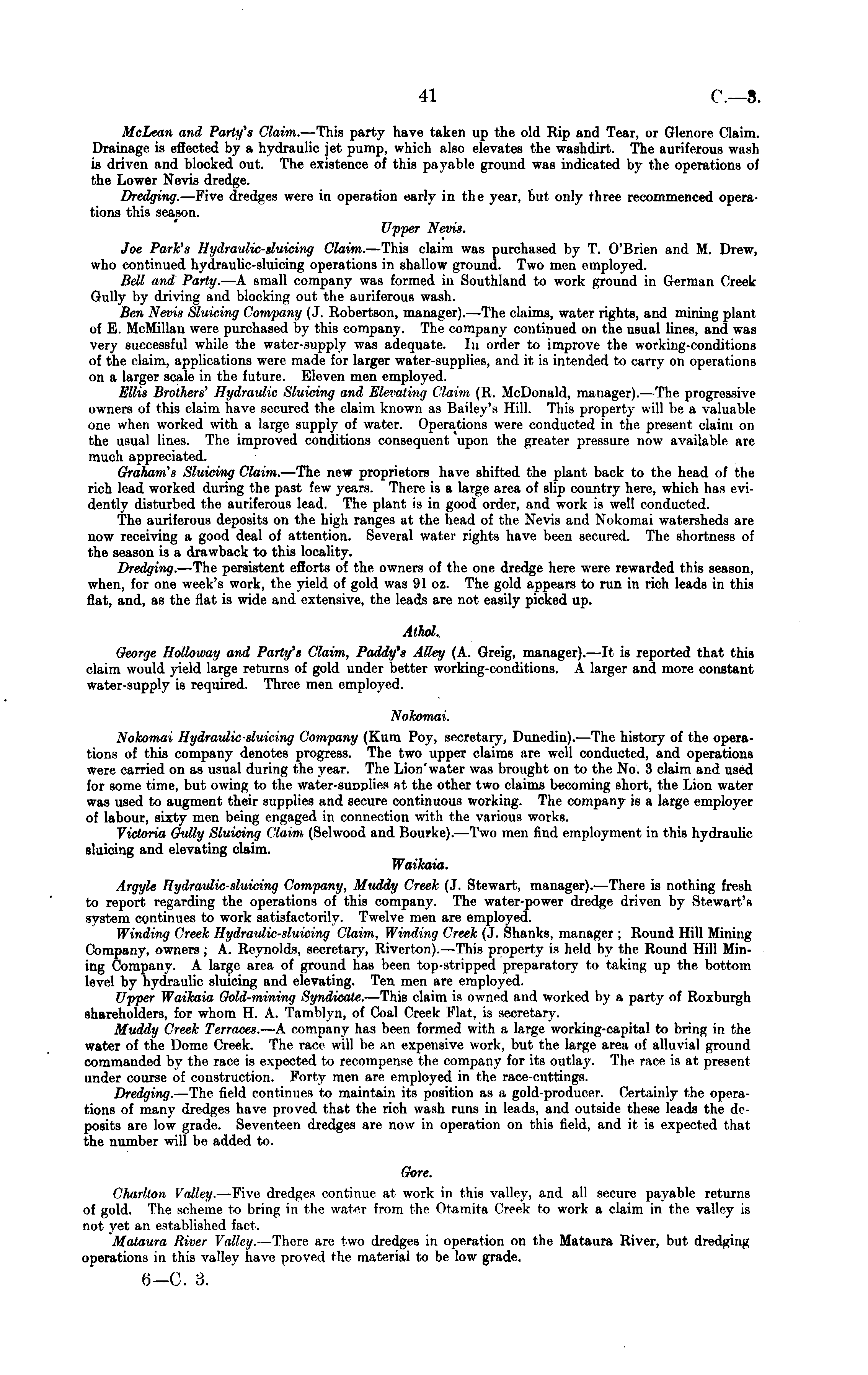 McLean and Party's Claim. —This party have taken up the old Rip and Tear, or Glenore Claim. Drainage is effected by a hydraulic jet pump, which also elevates the washdirt. The auriferous wash is driven and blocked out. The existence of this payable ground was indicated by the operations of the Lower Nevis dredge. Dredging. —Five dredges were in operation early in the year, but only three recommenced operations this season. Upper Nevis. Joe Park's Hydraulic-sluicing Claim. —This claim was purchased by T. O'Brien and M. Drew, who continued hydraulic-sluicing operations in shallow ground. Two men employed. Bell and: Party. —A small company was formed in Southland to work ground in German Creek Gully by driving and blocking out the auriferous wash. Ben Nevis Sluicing Company (J. Robertson, manager).—The claims, water rights, and mining plant of E. McMillan were purchased by this company. The company continued on the usual lines, and was very successful while the water-supply was adequate. In order to improve the working-conditions of the claim, applications were made for larger water-supplies, and it is intended to carry on operations on a larger scale in the future. Eleven men employed. Ellis Brothers' Hydraulic Sluicing and Elevating < 'laim (R. McDonald, manager).—The progressive owners of this claim have secured the claim known as Bailey's Hill. This property will be a valuable one when worked with a large supply of water. Operations were conducted in the present claim on the usual lines. The improved conditions consequent upon the greater pressure now available are much appreciated. Graham's Sluicing Claim. —The new proprietors have shifted the plant back to the head of the rich lead worked during the past few years. There is a large area of slip country here, which has evidently disturbed the auriferous lead. The plant is in good order, and work is well conducted. The auriferous deposits on the high ranges at the head of the Nevis and Nokomai watersheds are now receiving a good deal of attention. Several water rights have been secured. The shortness of the season is a drawback to this locality. Dredging. —The persistent efforts of the, owners of the one dredge here were rewarded this season, when, for one week's work, the yield of gold was 91 oz. The gold appears to run in rich leads in this flat, and, as the flat is wide and extensive, the leads are not easily picked up. Athol.. George Holloway and Party's Claim, Paddy's Alley (A. Greig, manager).—lt is reported that this claim would yield large returns of gold under better working-conditions. A larger and more constant water-supply is required. Three men employed. Nokomai. Nokomai Hydraulic-sluicing Company (Kum Poy, secretary, Dunedin). —The history of the operations of this company denotes progress. The two upper claims are well conducted, and operations were carried on as usual during the year. The Lion'water was brought on to the No. 3 claim and used for some time, but owing to the water-suDplies at the other two claims becoming short, the Lion water was used to augment their supplies and secure continuous working. The company is a large employer of labour, sixty men being engaged in connection with the various works. Victoria Gully Sluicing Claim (Selwood and Bourke). —Two men find employment in this hydraulic sluicing and elevating claim. Waikaia. Argyle Hydraulic-sluicing Company, Muddy Creek (J. Stewart, manager).—There is nothing fresh to report regarding the operations of this company. The water-power dredge driven by Stewart's system continues to work satisfactorily. Twelve men are employed. Winding Creek Hydraidic-sluicing Claim, Winding Creek (.). Shanks, manager ; Round Hill Mining Company, owners ; A. Reynolds, secretary, Riverton). —This property is held by the Round Hill Mining Company. A large area of ground has been top-stripped preparatory to taking up the bottom level by hydraulic sluicing and elevating. Ten men are employed. Upper Waikaia Gold-mining Syndicate. —This claim is owned and worked by a party of Roxburgh shareholders, for whom H. A. Tamblyn, of Coal Creek Flat, is secretary. Muddy Creek Terraces. —A company has been formed with a large working-capital to bring in the water of the Dome Creek. The race will be an expensive work, but the large area of alluvial ground commanded by the race is expected to recompense the company for its outlay. The race is at present under course of construction. Forty men are employed in the race-cuttings. Dredging. —The field continues to maintain its position as a gold-producer. Certainly the operations of many dredges have proved that the rich wash runs in leads, and outside these leads the deposits are low grade. Seventeen dredges are now in operation on this field, and it is expected that the number will be added to. Gore. Charlton Valley. —Five dredges continue at work in this valley, and all secure payable returns of gold. The scheme to bring in the water from the Otamita Creek to work a claim in the valley is not yet an established fact. Mataura River Valley. —There are two dredges in operation on the Mataura River, but dredging operations in this valley have proved the material to be low grade.