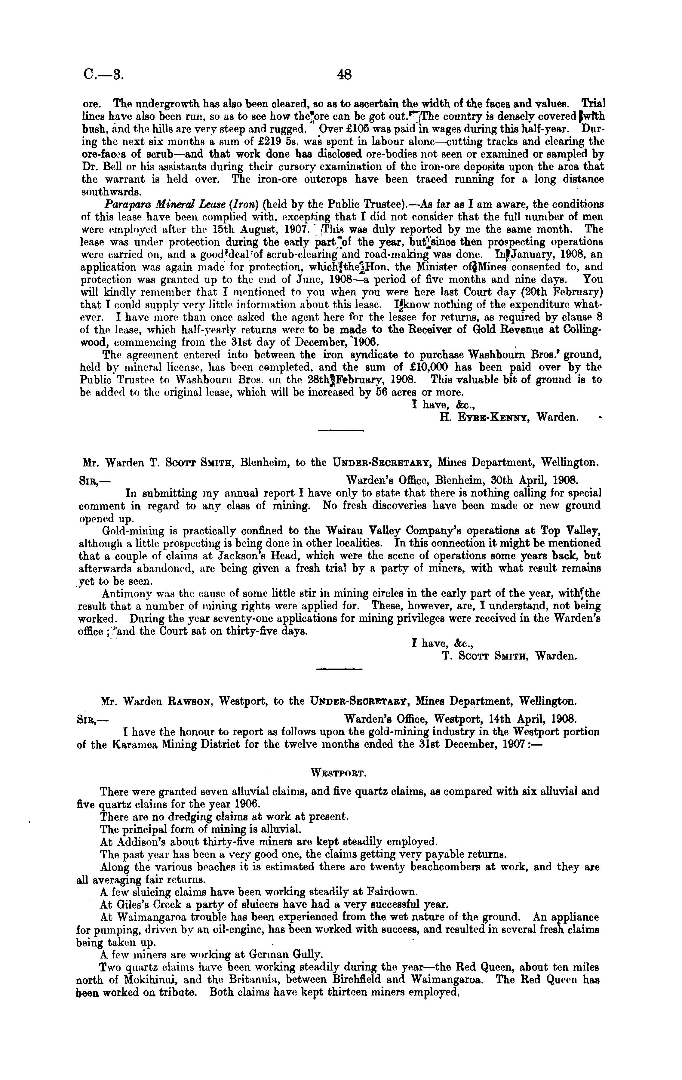 Mr. Warden Rawson. Westport, to the Under-Secretary, Mines Department, Wellington. Sir,— Warden's Office, Westport, 14th April, 1908. I have the honour to report as follows upon the gold-mining industry in the Westport portion of the Karamea Mining District for the twelve months ended the 31st December, 1907: — Westport. There were granted seven alluvial claims, and five quartz claims, as compared with six alluvial and five quartz claims for the year 1906. There are no dredging claims at work at present. The principal form of mining is alluvial. At Addison's about thirty-five miners are kept steadily employed. The past year has been a very good one, the claims getting very payable returns. Along the various beaches it is estimated there are twenty beachcombers at work, and they are all averaging fair returns. A few sluicing claims have been working steadily at Fairdown. At Giles's Creek a party of sluicers have had a very successful year. At Waimangaroa trouble, has been experienced from the wet nature of the ground. An appliance for pumping, driven by an oil-engine, has been worked with success, and resulted in several fresh claims being taken up. A few miners are working at German Gully. Two quartz claims have been working steadily during the year —the Red Queen, about ten miles north of Mokihimii, and the Britannia., between Birchfield and Waimangaroa. The Red Queen has been worked on tribute. Both claims have kept thirteen miners employed.
