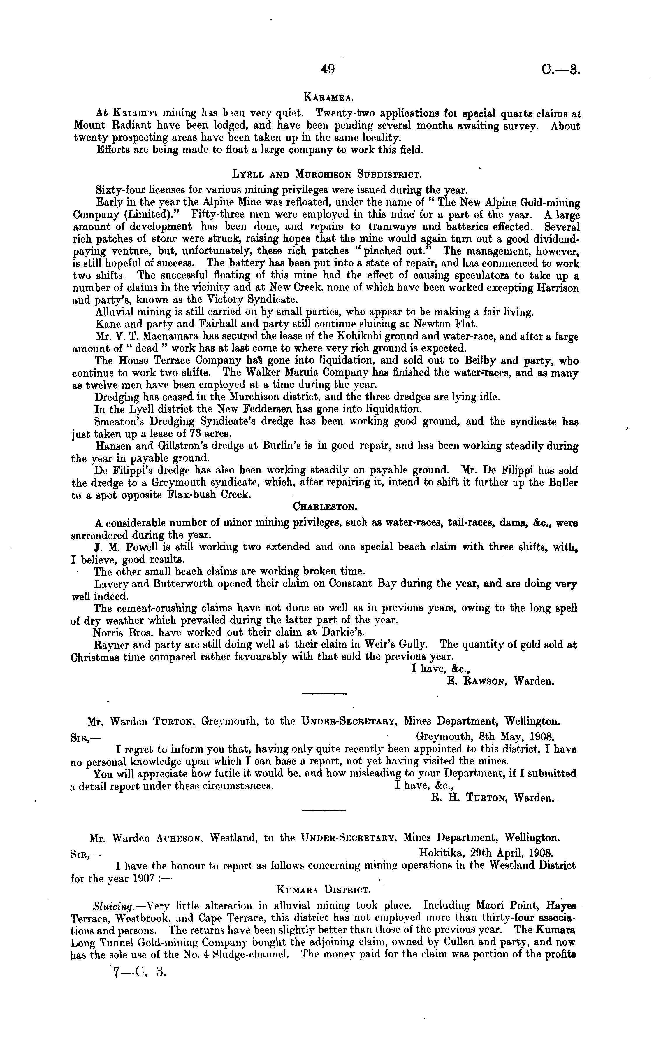 Mr. Warden Acheson, Westland, to the I'nder-Secretahv. Mines Department, Wellington. Sir,— Hokitika, 29th April, 1908. I have the honour to report as follows concerning mining operations in the Westland District for the year 1907 : — Kumar* District. Sluicing. —Very little alteration in alluvial mining took place. Including Maori Point, Hayes Terrace, Westbrook, and Cape Terrace, this district has not employed more than thirty-four associations and persons. The returns have been slightly better than those of the previous year. The Kumara Long Tunnel Gold-mining Company bought the adjoining claim, owned by Cullen and party, and now has the sole use of the No. 1 Sludge-channel, The money paid for the claim was portion of the profita