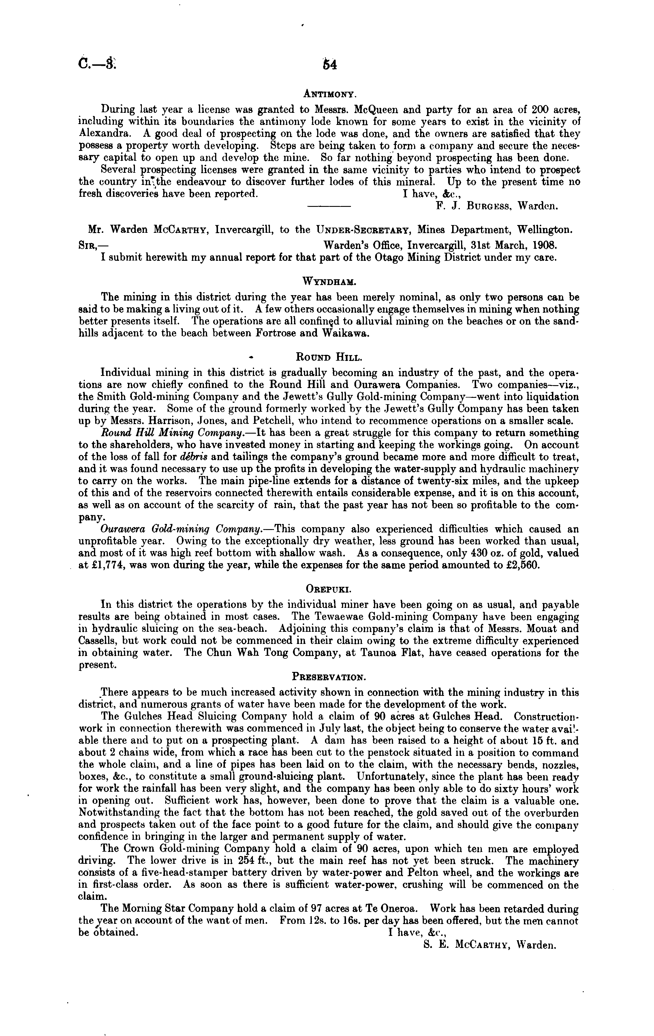 F. J. Burgess. Warden. Mr. Warden McCarthy, Invercargill, to the Under-Secretary, Mines Department, Wellington. Sir, — Warden's Office, Invercargill, 31st March, 1908. I submit herewith my annual report for that part of the Otago Mining District under my care. Wyndham. The mining in this district during the year has been merely nominal, as only two persons can be said to be making a living out of it. A few others occasionally engage themselves in mining when nothing better presents itself. The operations are all confined to alluvial mining on the beaches or on the sandhills adjacent to the beach between Fortrose and Waikawa. Round Hill. Individual mining in this district is gradually becoming an industry of the past, and the operations are now chiefly confined to the Round Hill and Ourawera Companies. Two companies—viz., the Smith Gold-mining Company and the Jewett's Gully Gold-mining Company —went into liquidation during the year. Some of the ground formerly worked by the Jewett's Gully Company has been taken up by Messrs. Harrison, Jones, and Petchell, who intend to recommence operations on a smaller scale. Round Hill Mining Company. —It has been a great struggle for this company to return something to the shareholders, who have invested money in starting and keeping the workings going. On account of the loss of fall for debris and tailings the company's ground became more and more difficult to treat, and it was found necessary to use up the profits in developing the water-supply and hydraulic machinery to carry on the works. The main pipe-line extends for a distance of twenty-six miles, and the upkeep of this and of the reservoirs connected therewith entails considerable expense, and it is on this account, as well as on account of the scarcity of rain, that the past year has not been so profitable to the company. Ourawera Gold-mining Company. —This company also experienced difficulties which caused an unprofitable year. Owing to the exceptionally dry weather, less ground has been worked than usual, and most of it was high reef bottom with shallow wash. As a consequence, only 430 oz. of gold, valued at £1,774, was won during the year, while the expenses for the same period amounted to £2,560. Orepuki. In this district the operations by the individual miner have been going on as usual, and payable results are being obtained in most cases. The Tewaewae Gold-mining Company have been engaging in hydraulic sluicing on the sea-beach. Adjoining this company's claim is that of Messrs. Mouat and Cassells, but work could not be commenced in their claim owing to the extreme difficulty experienced in obtaining water. The Chun Wah Tong Company, at Taunoa Flat, have ceased operations for the present. Preservation. There appears to be much increased activity shown in connection with the mining industry in this district, and numerous grants of water have been made for the development of the work. The Gulches Head Sluicing Company hold a claim of 90 acres at Gulches Head. Constructionwork in connection therewith was commenced in July last, the object being to conserve the water avai'able there and to put on a prospecting plant. A dam has been raised to a height of about 15 ft. and about 2 chains wide, from which a race has been cut to the penstock situated in a position to command the whole claim, and a line of pipes has been laid on to the claim, with the necessary bends, nozzles, boxes, &c, to constitute a small ground-sluicing plant. Unfortunately, since the plant has been ready for work the rainfall has been very slight, and the company has been only able to do sixty hours' work in opening out. Sufficient work has, however, been done to prove that the claim is a valuable one. Notwithstanding the fact that the bottom has not been reached, the gold saved out of the overburden and prospects taken out of the face point to a good future for the claim, and should give the company confidence in bringing in the larger and permanent supply of water. The Crown Gold-mining Company hold a claim of 90 acres, upon which ten men are employed driving. The lower drive is in 254 ft., but the main reef has not yet been struck. The machinery consists of a five-head-stamper battery driven by water-power and Pelton wheel, and the workings are in first-class order. As soon as there is sufficient water-power, crushing will be commenced on the claim. The Morning Star Company hold a claim of 97 acres at Te Oneroa. Work has been retarded during the year on account of the want of men. From 12s. to 16s. per day has been offered, but the men cannot be obtained. I have, &c, S. E. McCarthy, Warden.