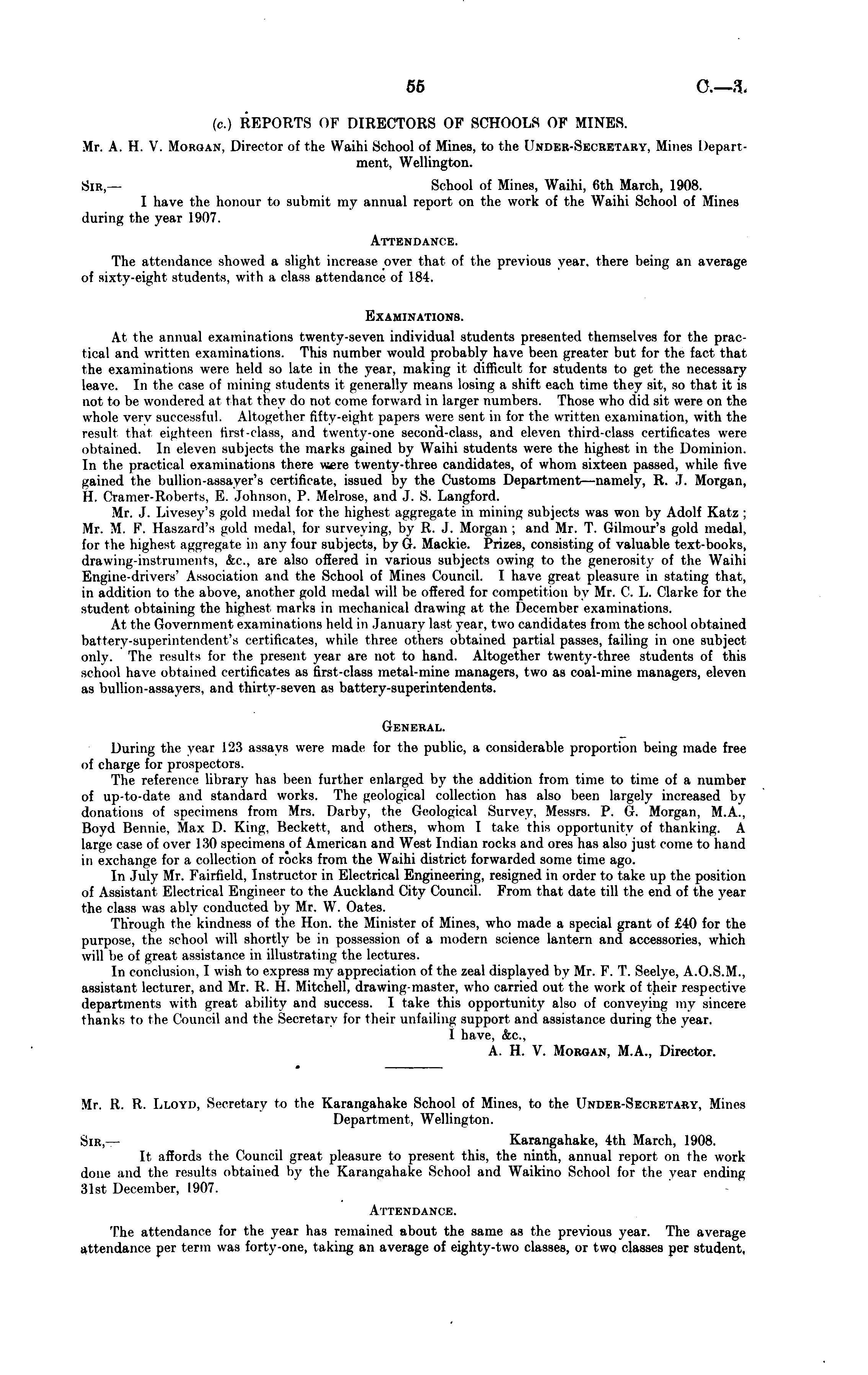 (c.) REPORTS OF DIRECTORS OF SCHOOLS OF MINES. Mr. A. H. V. Morgan. Director of the Waihi School of Mines, to the I'nder-Skchk'i wry. Mines Department. Wellington. Sir. School of Mines, Waihi, 6th March, 1908. I have the honour to submit my annual report on the work of the Waihi School of Mines during the year 1907. Attendants. The attendance showed a slight increase over that of the previous year, there being an average of sixty-eight students, with a class attendance of 184. Examinations. At the annual examinations twenty-seven individual students presented themselves for the practical and written examinations. This number would probably have been greater but for the fact that the examinations were held so late in the year, making it difficult for students to get the necessary leave. In the case of mining students it generally means losing a shift each time they sit, so that it is not to be wondered at that t hey do not come forward in larger numbers. Those who did sit were on the whole very successful. Altogether fifty-eight papers were sent in for the written examination, with the result that eighteen first-class, and twenty-one second-class, and eleven third-class certificates were obtained. In eleven subjects the marks gained by Waihi students were the highest m the Dominion. In the practical examinations there mere twenty-three candidates, of whom sixteen passed, while five gained the Imllion-assaver's certificate, issued by the Customs Department —namely, R. J. Morgan. 11. Cramer-Roberts. E. Johnson. P. Melrose, and J. S. Langford. Mr. J. Livesev's gold medal for the highest aggregate in mining subjects was won by Adolf Katz ; Mr. M. F. Haszard's gold medal, for surveying, by R. J. Morgan ; and Mr. T. Gilmour's gold medal, for the highest aggregate in any four subjects, by G. Mackie. Prizes, consisting of valuable text-books, drawing-instruments, &c, are also offered in various subjects owing to the generosity of the Waihi Engine-drivers' Association and the School of Mines Council. I have great pleasure in stating that, in addition to the above, another gold medal will be offered for competition by Mr. C. L. Clarke for the student obtaining the highest marks in mechanical drawing at the December examinations. At the Government examinations held in January last year, two candidates from the school obtained battery-superintendent's certificates, while three others obtained partial passes, failing in one subject only. The results for the present year are not to hand. Altogether twenty-three students of this school have obtained certificates as lirst-class metal-mine managers, two as coal-mine managers, eleven as bullion-assayers, and thirty-seven as battery-superintendents. General. During the year 123 assays were made for the public, a considerable proportion being made free of charge for prospectors. The reference library has been further enlarged by the addition from time to time of a number of up-to-date and standard works. The geological collection has also been largely increased by donations of specimens from Mrs. Darby, the Geological Survey, Messrs. P. G. Morgan, M.A., Bovd Beanie, .Max D. King. Beckett, and others, whom I take this opportunity of thanking. A large case of over 130 specimens of American and West Indian rocks and ores has also just come to hand in exchange for a collection of rocks from the Waihi district forwarded some time ago. In July Mr. Fairfield, Instructor in Electrical Engineering, resigned in order to take up the position of Assistant Electrical Engineer to the Auckland City Council. From that date till the end of the year the class was ably conducted by Mr. W T . Oates. Through the kindness of the Hon. the Minister of Mines, who made a special grant of £40 for the purpose, the school will shortly be in possession of a modern science lantern and accessories, which will be of great assistance in illustrating the lectures. In conclusion. 1 wish to express my appreciation of the zeal displayed by Mr. F. T. Seelye, A.0.5.M., assistant lecturer, and Mr. R. fl. Mitchell, drawing-master, who carried out the work of their respective departments with ereat ability and success. I take this opportunity also of conveying my sincere thanks to the Council and the Secretary for their unfailing support and assistance during the year. I have, &c, A. H. V. Morgan, M.A., Director.