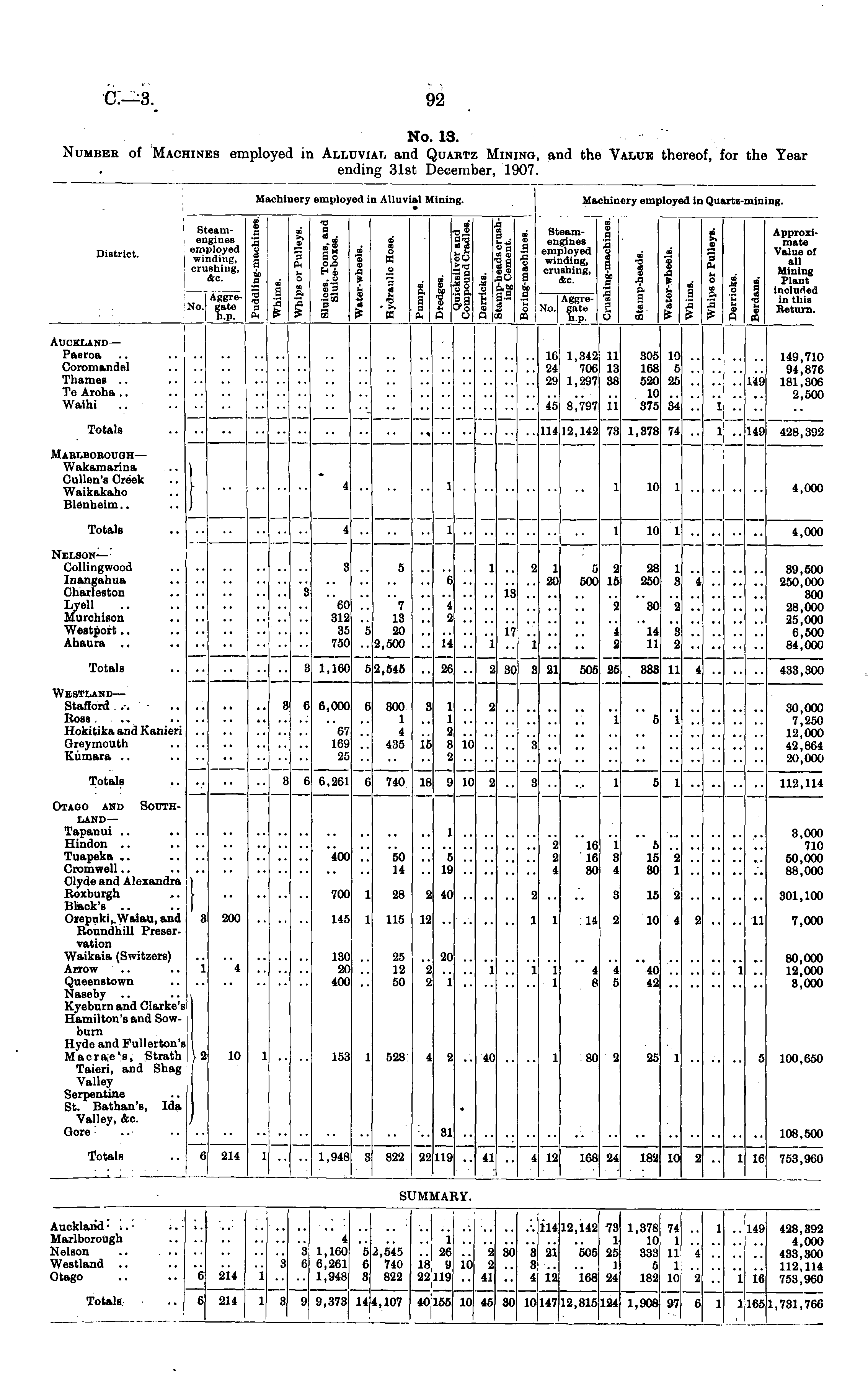 No. 13. Number of Machines employed in Alluvial and Quartz Mining, and the Value thereof, for the Year ending 31st December, 1907.