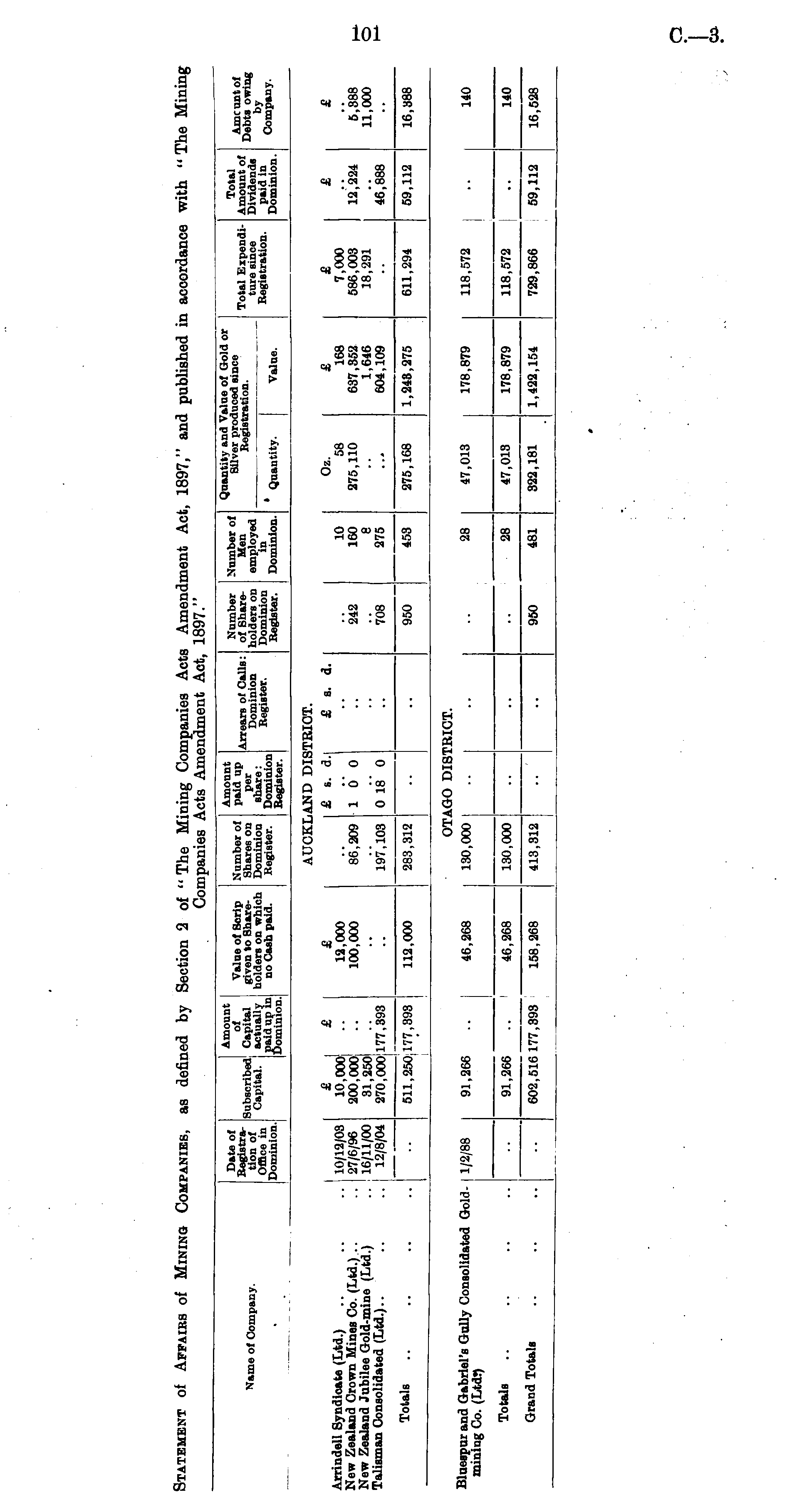Name of Company. „ . . Amount Amount x- ■ — ■ Quantity and Value of Gold or ° f Value of Scrip Number of paid up .„__„„. _,_,_,. S a JS?£ ° f Silver produced since *?£*"? Subscribed Capital given to Share- Shares on per Arre r a " ?'„f* llB - u',,?*"* „™,nl»d Registration. rfffl?„in Capital. actually holders on which Dominion shlu-e: S^l?'?. 11 emp _° yed Opinion. _(_____?£ - Cash paid. Register. Dominion B*»*r. Domnnon , Total Expendi- Amount of n tS™ n ii°' ture since Dividends Debts owing Registration. Con J any Value. Arrindell Syndicate (Ltd.) New Zealand Crown Mines Co. (Ltd.) .. New Zealand Jubilee Gold-mine (Ltd.) Talisman Consolidated (Ltd.) AUCKL i ,AND DIS 'RICT. £ | £ 10,000 200,000 31.250 1 270,000,177,393 £ 12,000 100,000 j £ s. d. £ s. d. Oz. 58 275,110 £ 168 637,352 1,646 604,109 1,243,275 £ 7,000 586,003 18,291 £ £ 10/12/03 27/6/96 16/11/00 12/8/04 86^209 10 0 242 10 160 275 12^224 5,388 11,000 197! 103 0 18 0 708 46^888 Totals I 1 453 275,168 611,294 511,250 177,393 112,000 283,312 950 59,112 16,388 OTAGO DIS' 'RICT. Bluespur and Gabriel's Gully Consolidated Goldmining Co. (Ltd?) 1/2/88 91,266 46,268 130,000 28 47,013 178,879 118,572 140 Totals 130,000 91,266 46,268 23 47,013 178,879 118,572 140 Grand Totals 481 322,181 1,422,154 602,516 177,393 158,268 413,312 950 729,866 59,112 16,528