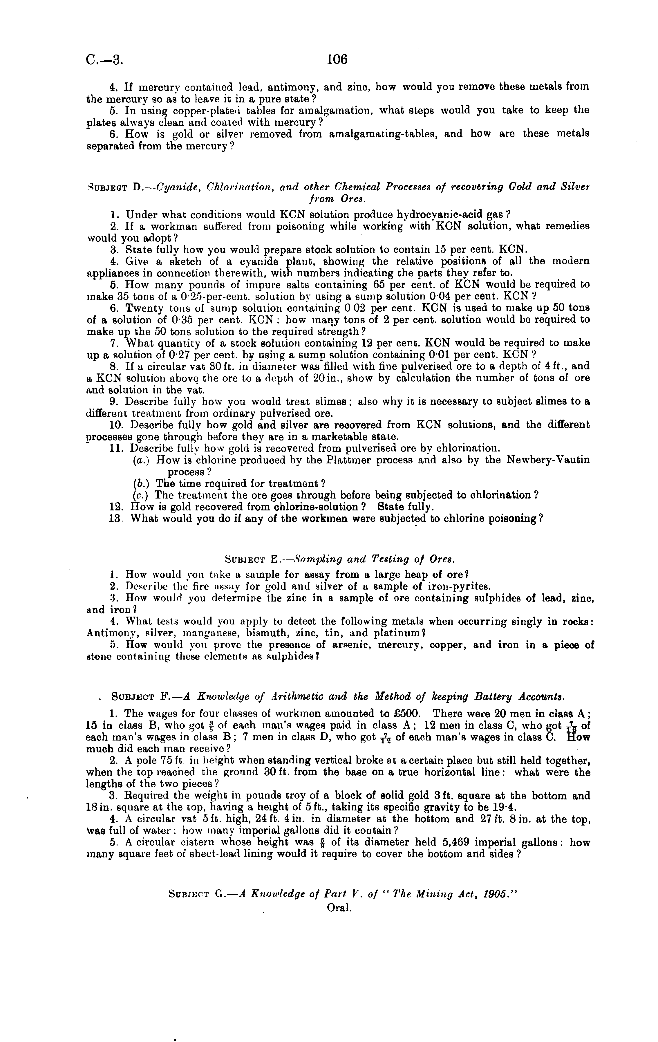 4. If mercury contained lead, antimony, and zinc, how would you remove these metals from the mercury so as to leave it in a pure state ? 5. In using copper-plated tables for amalgamation, what steps would you take to keep the plates always clean and coated with mercury ? 6. How is gold or silver removed from amalgamating-tables, and how are these metals separated from the mercury ? Subject D.— Cyanide, Chlorination , and other Chemical Processes of recovering Gold anil Silve? from Ores. 1. Under what conditions would KCN solution produce hydrocyanic-acid gas? 2. If a workman suffered from poisoning while working with KCN solution, what remedies would you adopt? 3. State fully how you would prepare stock solution to contain 15 per cent. KCN. 4. Give a sketch of a cyanide plant, showing the relative positions of all the modern appliances in connection therewith, with numbers indicating the parts they refer to. 5. How many pounds of impure salts containing 65 per cent, of KCN would be required to make 35 tons of a 0-25-per-cent. solution by using a sump solution 0 04 per cent. KCN ? 6. Twenty tons of sump solution containing 0 02 per cent. KCN is used to make up 50 tons of a solution of 035 per cent. KCN : how many tons of 2 per cent, solution would be required to make up the 50 tons solution to the required strength ? 7. What quantity of a stock solution containing 12 per cent. KCN would be required to make up a solution of 027 per cent, by using a sump solution containing 001 per cent. KCN ? 8. If a circular vat 30 ft. in diameter was filled with fine pulverised ore to a depth of 4 ft., and a KCN solution above the ore to a depth of 20in., show by calculation the number of tons of ore and solution in the vat. 9. Describe fully how you would treat slimes; also why it is necessary to subject slimes to a different treatment from ordinary pulverised ore. 10. Describe fully how gold and silver are recovered from KCN solutions, and the different processes gone through before they are in a marketable state. 11. Describe fully how gold is recovered from pulverised ore by chlorination. (a.) How is chlorine produced by the Plattmer process and also by the Newbery-Vautin process ? (b.) The time required for treatment ? (c.) The treatment the ore goes through before being subjected to chlorination ? 12. How is gold recovered from chlorine-solution ? State fully. 13. What would you do if any of the workmen were subjected to chlorine poisoning? Subject E.— Sampling and Testing of Ores. 1. How would you take a sample for assay from a large heap of ore? 2. Describe the fire assay for gold and silver of a sample of iron-pyrites. 3. How would you determine the zinc in a sample of ore containing sulphides of lead, zinc, and iron? 4. What tests would you apply to detect the following metals when occurring singly in rocks: Antimony, silver, manganese, bismuth, zinc, tin, and platinum? 5. How would you prove the presence of arsenic, mercury, copper, and iron in a piece of stone containing these elements as sulphides? . Subject F.— A Knowledge of Arithmetic and the Method of keeping Battery Accounts. 1. The wages for four classes of workmen amounted to £500. There were 20 men in class A ; 15 in class B, who got ;i of each man's wages paid in class A ; 12 men in class C, who got T 7 a of each man's wages in class B ; 7 men in class D, who got T \ of each man's wages in class C. How much did each man receive ? 2. A pole 75 ft. in height when standing vertical broke at acertain place but still held together, when the top reached the ground 30ft. from the base on a true horizontal line: what were the lengths of the two pieces ? 3. Required the weight in pounds troy of a block of solid gold 3 ft. square at the bottom and 18in. square at the top, having a height of sft., taking its specific gravity to be 194. 4. A circular vat 5 ft. high, 24 ft. 4 in. in diameter at the bottom and 27 ft. 8 in. at the top, Was full of water : how many imperial gallons did it contain ? 5. A circular cistern whose height was £ of its diameter held 5,469 imperial gallons : how many square feet of sheet-lead lining would it require to cover the bottom and sides ? Subject G.— A Knowledge of Part V. of " The Mining Act, 1905." Oral.