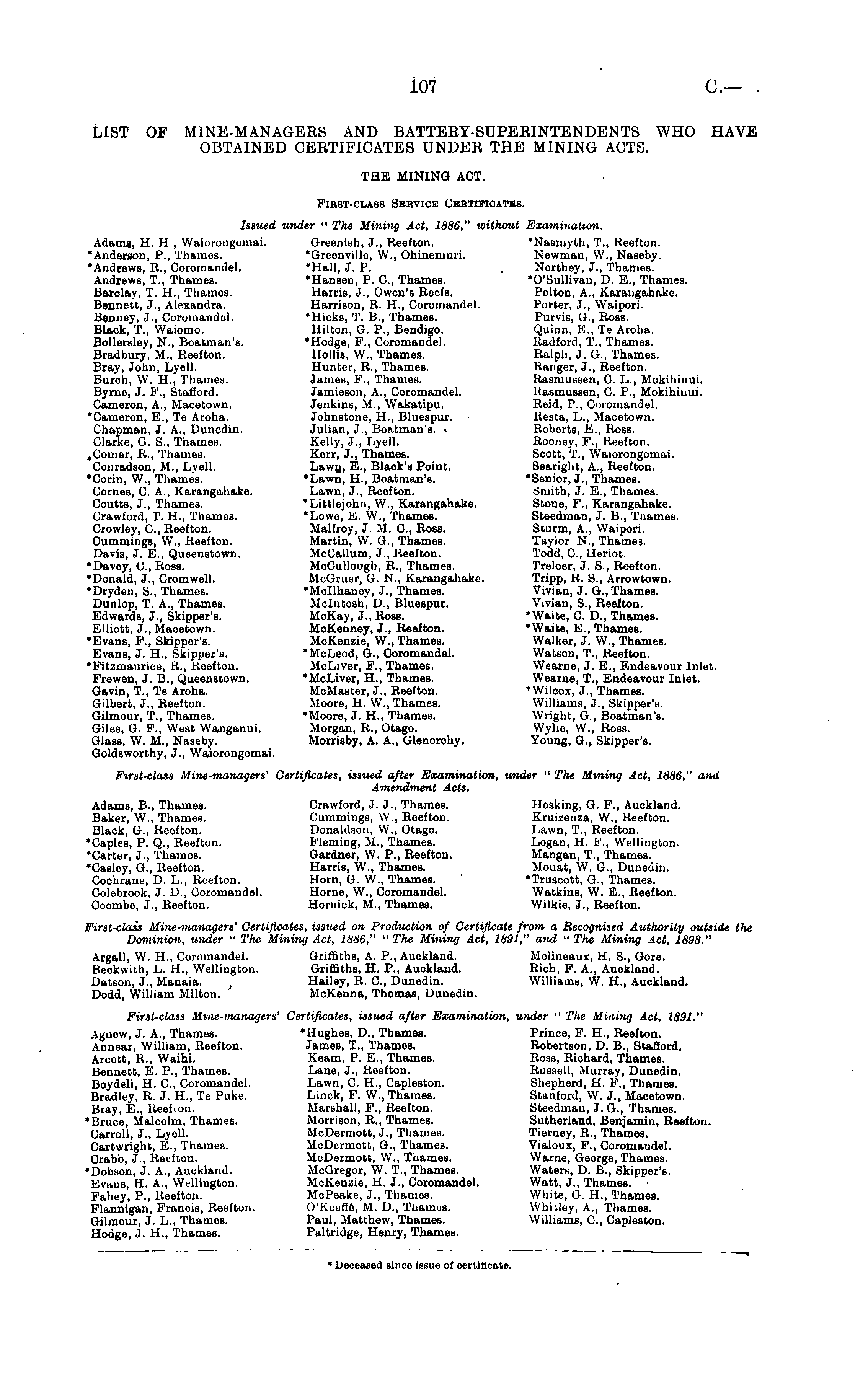 LIST OF MINE-MANAGERS AND BATTERY-SUPERINTENDENTS WHO HAVE OBTAINED CERTIFICATES UNDER THE MINING ACTS. THE MINING ACT. Fibst-class Service Gebtipicates. Issued under " The Mining Act, 1886," without Examination. Adams, H. H., Waioiongomai. Greenish, J., Reefton. 'Nasmyth, T., Reefton. "Anderson, P., Thames. 'Greenville, W., Ohinemuri. Newman, W., Naseby. "Andrews, R., Coromandel. "Hall, J. P. Northey, J., Thames. Andrews, T., Thames. "Hansen, P. C, Thames. "O'Sullivau, D. E., Thames. Barclay, T. H., Thames. Harris, J., Owen's Reefs. Polton, A., Karangahake. Bennett, J., Alexandra. Harrison, R. H., Coromandel. Porter, J., Waipori. Benney, J., Coromandel. "Hicks, T. 8., Thames. Purvis, G., Ross. Black, T., Waiomo. Hilton, G. P., Bendigo. Quinn, E., Te Aroha. Bollersley, N., Boatman's. 'Hodge, F., Coromandel. Radford, T., Thames. Bradbury, M., Reefton. Hollis, W., Thames. Ralph, J. G., Thames. Bray, John, Lyell. Hunter, R., Thames. Ranger, J., Reefton. Burch, W. H., Thames. James, F., Thames. Rasmussen, C. L., Mokihinui. Byrne, J. F., Stafford. Jamieson, A., Coromandel. Hasmussen, C. P., Mokihinui. Cameron, A., Macetown. Jenkins, M., Wakatipu. Reid, P., Coromandel. "Cameron, E., Te Aroha. Johnstone, H., Bluespur. Resta, L., Macetown. Chapman, J. A., Dunedin. Julian, J., Boatman's. • Roberts, E., Ross. Clarke, G. S., Thames. Kelly, J., Lyell. Rooney, F., Reefton. .Comer, R., Thames. Kerr, J., Thames. Scott, T., Waiorongomai. Conradson, M., Lyell. Lawn, E., Black's Point. Seariglit, A., Reefton. "Corin, W., Thames. 'Lawn, H., Boatman's. 'Senior, J., Thames. Comes, C. A., Karangahake. Lawn, J., Reefton. Smith, J. E., Thames. Coutts, J., Thames. 'Littlejohn, W., Karangahake. Stone, F., Karangahake. Crawford, T. H., Thames. "Lowe, E. W., Thames. Steedman, J. 8., Tnames. Crowley, C, Reefton. Malfroy, J. M. C, Ross. Sturm, A., Waipori. Cummings, W., Reefton. Martin, W. G., Tnames. Taylor N., Thames. Davis, J. E., Queenstown. McCallum, J., Reefton. Todd, C, Heriot. "Davey, C, Ross. McCullough, R., Thames. Treloer, J. S., Reefton. •Donald, J., Cromwell. McGruer, G. N., Karangahake. Tripp, R. S., Arrowtown. "Dryden, S., Thames. "Mcllhaney, J., Thames. Vivian, J. G., Thames. Dunlop, T. A., Thames. Mcintosh, D., Bluespur. Vivian, S., Reefton. Edwards, J., Skipper's. McKay, J., Ross. 'Waite, C. D., Thames. Elliott, J., Macetown. McKeuney, J., Reefton. 'Waite, E., Thames. 'Evans, F., Skipper's. McKenzie, W., Thames. Walker, J. W., Thames. Evans, J. H., Skipper's. 'McLeod, G., Coromandel. Watson, T., Reefton. •Fitzmaurice, R., Reefton. McLiver, F., Thames. Wearne, J. E., Endeavour Inlet. Frewen, J. 8., Queenstown. "McLiver, H., Thames. Wearne, T., Endeavour Inlet. Gavin, T., Te Aroha. McMaster, J., Reefton. "Wilcox, J., Thames. Gilbert, J., Reefton. Moore, H. W., Thames. Williams, J., Skipper's. Gilmour, T., Thames. 'Moore, J. H., Thames. Wright, G., Boatman's. Giles, G. F., West Wanganui. Morgan, R., Otago. Wylie, W., Ross. Glass, W. M., Naseby. Morrisby, A. A., Glenorchy. Young, G., Skipper's. Goldsworthy, J., Waiorongomai. First-class Mine-managers' Certificates, issued after Examination, under " The Mining Act, 1886," and Amendment Acts. Adams, 8., Thames. Crawford, J. J., Thames. Hosking, G. F., Auckland. Baker, W., Thames. Cummings, W., Reefton. Kruizenza, W., Reefton. Black, G., Reefton. Donaldson, W., Otago. Lawn, T., Reefton. 'Caples, P. Q., Reefton. Fleming, M., Thames. Logan, H. F., Wellington. 'Carter, J., Thames. Gardner, W, P., Reefton. Mangan, T., Thames. 'Casley, G, Reefton. Harris, W., Thames. Mouat, W. G., Dunedin. Cochrane, D. L., Reefton. Horn, G. \V., Thames. 'Truscott, G., Thames. Colebrook, J. D., Coromandel. Home, W., Coromandel. Watkins, W. E., Reefton. Coombe, J., Reefton. Hornick, It., Thames. Wilkie, J., Reefton. First-class Mine-managers' Certificates, issued on Production of Certificate from a Recognised Autliority outside the Dominion, under " The Mining Act, 1886," " The Mining Act, 1891," and " The Mining Act, 1898." Argall, W. H., Coromandel. Griiliths, A. P., Auckland. Molineaux, H. S., Gore. Beckwith, L. H., Wellington. Griffiths, H. P., Auckland. Rich, F. A., Auckland. Datson, J., Manaia. t Hailey, R. C, Dunedin. Williams, W. H., Auckland. Dodd, William Milton. McKenna, Thomas, Dunedin. First-class Mine-managers' Certificates, issued after Examination, under " The Mining Act, 1891." Agnew, J. A., Thames. 'Hughes, D., Thames. Prince, F. H., Reefton. Annear, William, Reefton. James, T., Thames. Robertson, D. 8., Stafford. Arcott, R., Waihi. Keam, P. E., Thames. Ross, Richard, Thames. Bennett, E. P., Thames. Lane, J., Reefton. Russell, Murray, Dunedin. Boydell, H. C, Coromandel. Lawn, C. H., Capleston. Shepherd, H. P., Thames. Bradley, R. J. H., Te Puke. Linck, F. W., Thames. Stanford, W. J., Macetown. Bray, E., Reefion. Marshall, F., Reefton. Steedman, J. G., Thames. •Bruce, Malcolm, Thames. Morrison, R., Thames. Sutherland, Benjamin, Reefton. Carroll, J., Lyell. MuDermott, J., Thames. Tierney, R., Thames. Cartwright, E., Thames. MrDermott, G., Thames. Vialoux, F., Coromandel. Crabb, J., Reefton. McDermott, W., Thames. Wame, George, Thames. •Dobson, J. A., Auckland. McGregor, W. T., Thames. Waters, D. 8., Skipper's. Evans, H. A., Wellington. McKenzie, H. J., Coromandel. Watt, J., Thames. Fahey, P., Reefton. MoPeake, J., Thameß. White, G. H., Thames. Flannigan, Francis, Reefton. O'Keeffe, M. D., Thames. Whitley, A., Thames. Gilmour, J. L., Thames. Paul, Matthew, Thames. Williams, C, Capleston. Hodge, J. H., Thames. Paltndge, Henry, Thames.