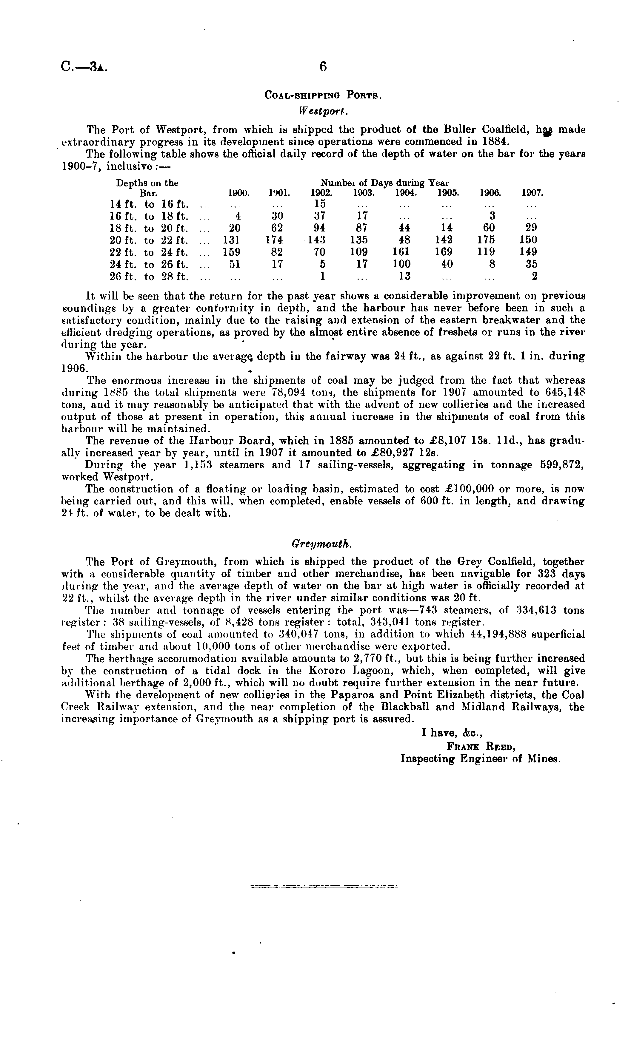 Coal-shippino Ports. Westport. The Port of Westport, from which is shipped the product of the Buller Coalfield, hp made extraordinary progress in its development since operations were commenced in 1884. The following table shows the official daily record of the depth of water on the bar for the years 1900-7, inclusive:— Depths on thu Numbei of J)ays during Year Bar. 1900. l'K)l. 1902. 1903. 1904. 1905. 1906. 1907. 14ft. to 16ft 15 16 ft. to 18ft. ... 4 30 37 17 3 18ft. to 20ft. ... 20 62 94 87 44 14 60 29 20ft. to 22ft. ... 131 174 143 135 48 142 175 150 22ft. to 24ft. ... 159 82 70 109 161 169 119 149 24ft. to 26ft. ... 51 17 5 17 100 40 8 35 26ft. to 28ft 1 ... 13 2 It will be seen that the return for the past year shows a considerable improvement on previous soundings by a greater conformity in depth, and the harbour has never before been in such a satisfactory condition, mainly due to the raising and extension of the eastern breakwater and the efficient dredging operations, as proved by the almost entire absence of freshets or runs in the river 'luring the year. Within the harbour the average, depth in the fairway was 24 ft., as against 22 ft. 1 in. during 1906. The enormous increase in the shipments of coal may be judged from the fact that whereas during 1885 the total shipments were 78,094 tons, the shipments for 1907 amounted to 645,148 tons, and it may reasonably be anticipated that with the advent of new collieries and the increased output of those at present in operation, this annual increase in the shipments of coal from this harbour will be maintained. The revenue of the Harbour Board, which in 1885 amounted to £8,107 13s. lid., has gradually increased year by year, until in 1907 it amounted to £80,927 12s. During the year 1,153 steamers and 17 sailing-vessels, aggregating in tonnage 599,872, worked Westport. The construction of a floating or loading basin, estimated to cost £100,000 or more, is now being carried out, and this will, when completed, enable vessels of 600 ft. in length, and drawing 21 ft. of water, to be dealt with. Greymouth. The Port of Greymouth, from which is shipped the product of the Grey Coalfield, together with a considerable quantity of timber and other merchandise, has been navigable for 323 days during tho year, ami the; average depth of water on the bar at high water is officially recorded at 22 ft., whilst the average depth in the river under similar conditions was 20 ft. The number and tonnage of vessels entering the port was—743 steamers, of 334,613 tons register; 88 sailing-vessels, of 8,428 tons register: total, 343,041 tons register. The shipments of coal amounted to 340,047 tons, in addition to which 44,194,888 superficial feet of timber and about 10,000 tons of other merchandise were exported. The berthage accommodation available amounts to 2,770 ft., but this is being further increased by the construction of a tidal dock in the Kororo Lagoon, which, when completed, will give additional berthage of 2,000 ft., which will no doubt require further extension in the near future. With the development of new collieries in the Paparoa and Point Elizabeth districts, the Coal Creek Railway extension, and the near completion of the Blackball and Midland Railways, the increasing importance of Greymouth as a shipping port is assured. I have, &c, Frank Reed, Inspecting Engineer of Mines.