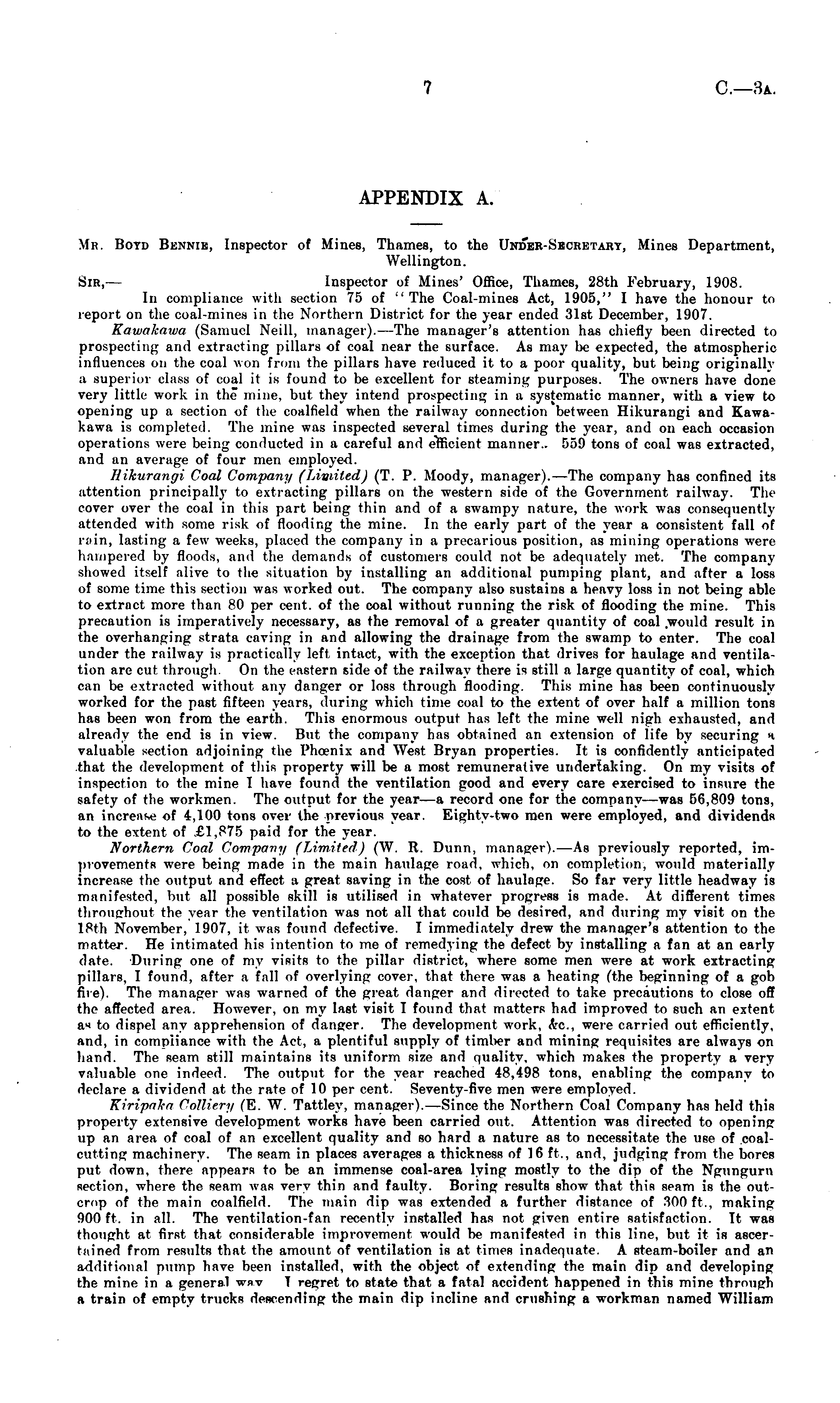 APPENDIX A. Mit. Boyd Bennie, Inspector of Mines, Thames, to the Under-Secretary, Mines Department, Wellington. Sir, — Inspector of Mines' Office, Thames, 28th February, 1908. In compliance with section 75 of "The Coal-mines Act, 1905," I have the honour to report on the coal-mines in the Northern District for the year ended 31st December, 1907. Kawaknwa (Samuel .Will, manager).—The manager's attention has chiefly been directed to prospecting and extracting pillars of coal near the surface. As may l>c expected, the atmospheric influences on the coal won from the pillars have reduced it to a poor quality, but being originally a superior class of coal it is found to he excellent for Bteaming purposes. The owners have done very little work in the mine, but they intend prospecting in a systematic manner, with a view to opening up a section of the coalfield when the railway connection between Hikurangi and Kawakawa is completed. The mine was inspected several times during the year, and on each occasion operations were being conducted in a careful and efficient manner.. 559 tons of coal was extracted, and an average of four men employed. Hikurangi Coal Comprint/ (Limited) (T. P. Moody, manager).—The company has confined its attention principally to extracting pillars on the western side of the Government railway. The cover over the coal in this part being thin and of a swampy nature, the work was consequently attended with some risk of flooding the mine. In the early part of the year a consistent fall of rain, lasting a few weeks, placed the company in a precarious position, as mining operations were hampered by floods, ami the demands of customers could not be adequately met. The company showed itself alive to the situation by installing an additional pumping plant, and after a loss of some time this section was worked out. The company also sustains a heavy loss in not being able to extract more than 80 per cent, of the coal without running the risk of flooding the mine. This precaution is imperatively necessary, as the removal of a greater quantity of coal would result in the overhanging strata caving in and allowing the drainage from the swamp to enter. The coal under the railway is practically left intact, with the exception that drives for haulage and ventilation are cut through. On the eastern side of the railway there is still a large quantity of coal, which can be extracted without any danger or loss through flooding. This mine has been continuously worked for the past fifteen years, during which time coal to the extent of over half a million tons lias been won from the earth. This enormous output has left the mine well nigh exhausted, and already the end is in view. But the company has obtained an extension of life by securing h valuable section adjoining the Phoenix ami West Bryan properties. It is confidently anticipated that the development of this property will be a most remunerative undertaking. On my visits of inspection to the mine I have found the ventilation good and every care exercised to insure the safety of the workmen. The output for the year—a record one for the company—was 56,809 tons, an increase of 4,100 tons over the previous year. Eighty-two men were employed, and dividends to the extent of £1,875 paid for the year. Northern Cool Cnmpmiy (Limited') (W. R. Dunn, manager).—As previously reported, improvements were being made in the main haulage road, which, on completion', would materially increase the output and effect a great saving in the cost of haulage. So far very little headway is manifested, but all possible skill is utilised in whatever progress is made. At different times throughout the year the ventilation was not all that could be desired, anil during my visit on the 18th November, 1907, it was found defective. I immediately drew the manager's attention to the matter. He intimated his intention to me of remedying the defect by installing a fan at an early date. During one of my visits to the pillar district, where some men were at work extracting pillars, I found, after a fall of overlying cover, that there was a heating (the beginning of a gob fire). The manager was warned of the great danger and directed to take precautions to close off the affected area. However, on my last visit T found that matters had improved to such an extent as to dispel any apprehension of danger. The development work. fee, were carried out efficiently, and, in compliance with the Act, a plentiful supply of timber and mining requisites are always on hand. The seam still maintains its uniform size and quality, which makes the property a very valuable one indeed. The output for the year reached 48,498 tons, enabling the company to declare a dividend at the rate of 10 per cent. Seventy-five men were employed. Kiripaka Colliery (E. W. Tattley, manager).—Since the Northern Coal Company has held this property extensive development works have been carried out. Attention w r as directed to opening up an area of coal of an excellent quality and so hard a nature as to necessitate the use of coalcutting machinery. The seam in places averages a thickness of 16 ft., and. judging from the bores put down, there appears to be an immense coal-area lying mostly to the dip of the Ngungurn section, where the seam was very thin and faulty. Boring results show that this seam is the outcrop of the main coalfield. The main dip was extended a further distance of 300 ft., making 900 ft. in all. The ventilation-fan recently installed has not given entire satisfaction. Tt was thought at first that considerable improvement would be manifested in this line, but it is ascertained from results that the amount of ventilation is at times inadequate. A steam-boiler and an additional pump have been installed, with the object of extending the main dip and developing the mine in a general wav T regret to Rtate that a fatal accident happened in this mine throuch a train of empty trucks descending the m