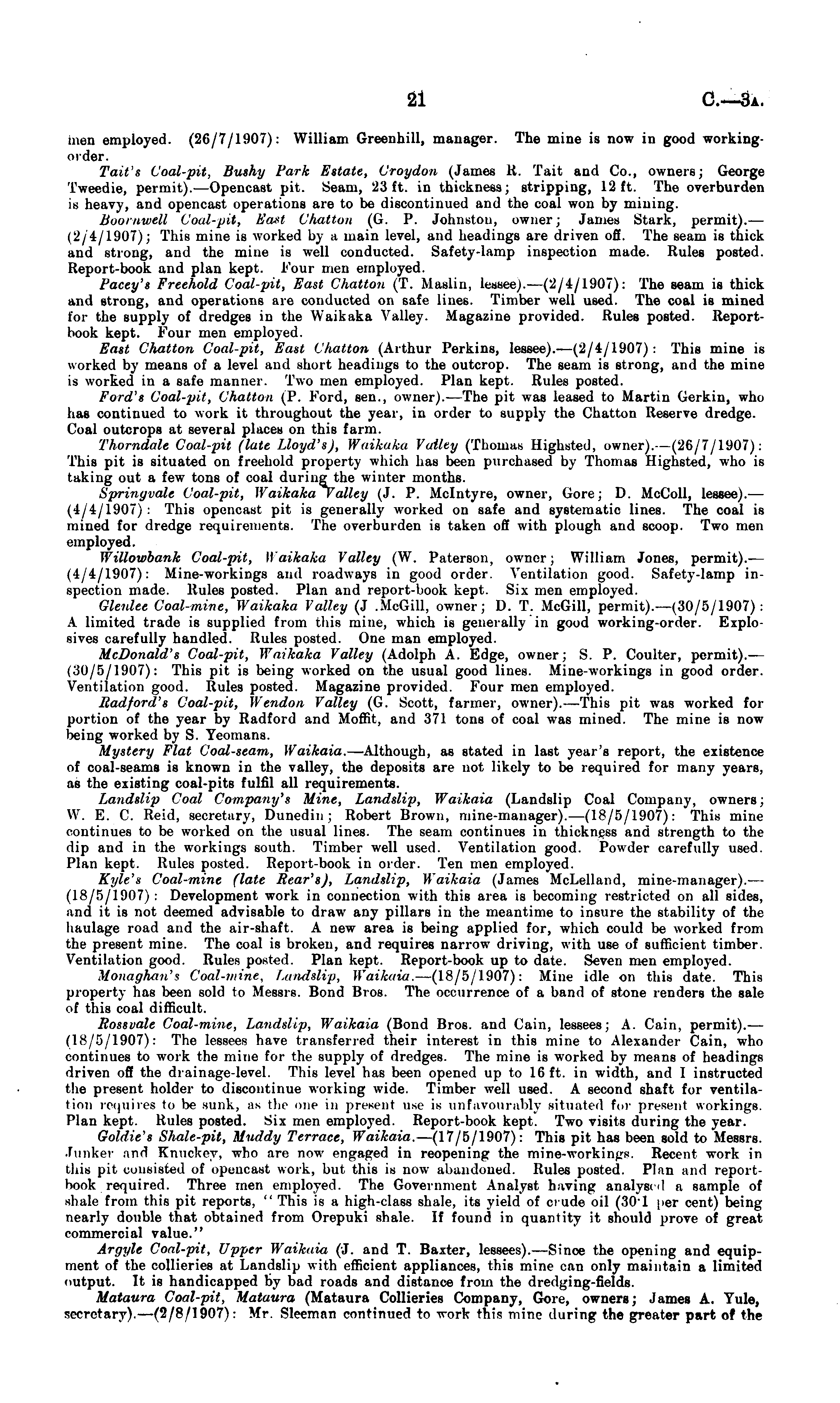 men employed. (26/7/1907): William Greenhill, manager. The mine is now in good workingorder. Tait's Coal-pit, Bushy Park Estate, Croydon (James It. Tait and Co., owners; George Tweedie, permit). —Opencast pit. Seam, 23ft. in thickness; stripping, 12 ft. The overburden is heavy, and opencast operations are to be discontinued and the coal won by mining. Buornwell Coal-pit, Bast Citation (G. P. Johnston, owner; James Stark, permit). — (2/4/1907); This mine is worked by a main level, and headings are driven off. The seam is thick and strong, and the mine is well conducted. Safety-lamp inspection made. Rules posted. Report-book and plan kept. Four men employed. Pacey's Freehold Coal-pit, East Chatton (T. Maslin, lessee). —(2/4/1907): The seam is thick and strong, and operations are conducted on safe lines. Timber well used. The coal is mined for the supply of dredges in the Waikaka Valley. Magazine provided. Rules posted. Reportbook kept. Four men employed. East Chatton Coal-pit, East Chatton (Arthur Perkins, lessee). —(2/4/1907) : This mine is worked by means of a level ami short headings to the outcrop. The seam is strong, and the mine is worked in a safe manner. Two men employed. Plan kept. Rules posted. Ford's Coal-pit, Chatton (P. Ford, sen., owner). —The pit was leased to Martin Gerkin, who has continued to work it throughout the year, in order to supply the Chatton Reserve dredge. Coal outcrops at several places on this farm. Thomdale Coal-pit (late Lloyd's), Waikaka Valley (Thomas Highsted, owner). —(26/7/1907): This pit is situated on freehold property which has been purchased by Thomas Highsted, who is taking out a few tons of coal during the winter months. Sprinyvale Coal-pit, Waikaka Valley (J. P. Mclntyre, owner, Gore; D. McColl, lessee). — (4/4/1907) : This opencast pit is generally worked on safe and systematic lines. The coal is mined for dredge requirements. The overburden is taken off with plough and scoop. Two men employed. Willowbank Coal-pit, Waikaka Valley (W. Paterson, owner; William Jones, permit).- — (4/4/1907): Mine-workings and roadways in good order. Ventilation good. Safety-lamp inspection made. Rules posted. Plan and report-book kept. Six men employed. Glenlee Coal-mine, Waikaka Valley (J .McGill, owner; D. T. McGill, permit). —(30/5/1907): A limited trade is supplied from this mine, which is generally in good working-order. Explosives carefully handled. Rules posted. One man employed. McDonald's Coal-pit, Waikaka Valley (Adolph A. Edge, owner; S. P. Coulter, permit).— (30/5/1907): This pit is being worked on the usual good lines. Mine-workings in good order. Ventilation good. Rules posted. Magazine provided. Four men employed. Radford's Coal-pit, Wendon Valley (G. Scott, farmer, owner). —This pit was worked for portion of the year by Radford and Moffit, and 371 tons of coal was mined. The mine is now being worked by S. Yeomans. Mystery Flat Coal-seam, Waikaia. —Although, as stated in last year's report, the existence of coal-seams is known in the valley, the deposits are not likely to be required for many years, as the existing coal-pits fulfil all requirements. Landslip Coal Company's Mine, Landslip, Waikaia (Landslip Coal Company, owners; W. E. C. Reid, secretary, Dunedin: Robert Brown, mine-manager).—(lß/5/1907): This mine continues to be worked on the usual lines. The seam continues in thickness and strength to the dip and in the workings south. Timber well used. Ventilation good. Powder carefully used. Plan kept. Rules posted. Report-book in order. Ten men employed. Kyle's Coal-mine (late Rear's), Landslip, Waikaia (James McLelland, mine-manager). — (18/5/1907) : Development work in connection with this area is becoming restricted on all sides, and it is not deemed advisable to draw any pillars in the meantime to insure the stability of the haulage road and the air-shaft. A new area is being applied for, which could be worked from the present mine. The coal is broken, and requires narrow driving, with use of sufficient timber. Ventilation good. Rules posted. Plan kept. Report-book up to date. Seven men employed. Monaghan's Coal-mine, Landslip. Waikaia. —(lß/5/1907): Mine idle on this date. This property has been sold to Messrs. Bond Bros. The occurrence of a band of stone renders the sale of this coal difficult. Rossvale Coal-mine, Landslip, Waikaia (Bond Bros, and Cain, lessees; A. Cain, permit). — (18/5/1907): The lessees have transferred their interest in this mine to Alexander Cain, who continues to work the mine for the supply of dredges. The mine is worked by means of headings driven off the drainage-level. This level has been opened up to 16 ft. in width, and I instructed the present holder to discontinue working wide. Timber well used. A second shaft for ventilation requires to be sunk, as the one in present use is unfavourably situated for present workings. Plan kept. Rules posted. Six men employed. Report-book kept. Two visits during the year. Goldie's Shale-pit, Muddy Terrace, Waikaia. —(l7/5/1907): This pit has been sold to Messrs. Junker and Knuckey, who are now engaged in reopening the mine-workings. Recent work in this pit consisted of opencast work, but this is now abandoned. Rules posted. Plan and reporthook required. Three men employed. The Government Analyst having analysed a sample of shale from this pit reports, " This is a high-class shale, its yield of crude oil (301 per cent) being nearly double that obtained from Orepuki shale. If found in quantity it should prove of great commercial value." Argyle Coal-pit, Upper Waikaia (J. and T. Baxter, lessees). —Since the opening and equipment of the collieries at Landslip with efficient appliances, this mine can only maintain a limited output. It is handicapped by bad roads and distance from the dredging-fields. Mataura Coal-pit, Mataura (Mataura Collieries Company, Gore, owners; .lames A. Yule, secretary).—(2/8/1907): Mr. Slecman continued to work this