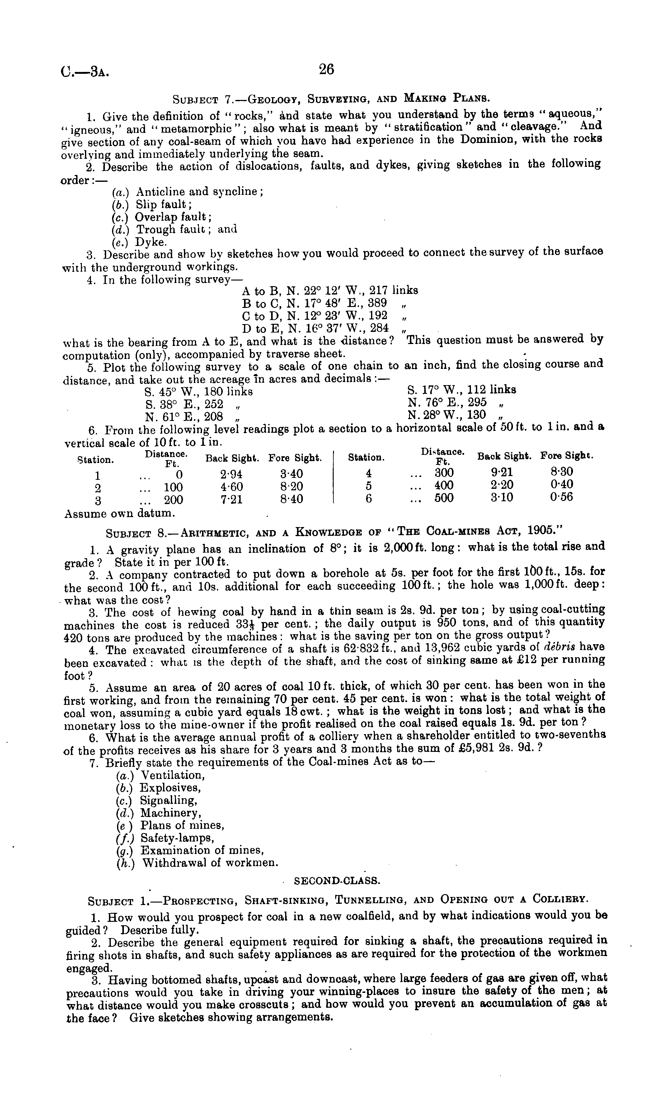Subject 7.—Geology, Surveying, and Making Plans. 1. Give the definition of "rocks," and state what you understand by the terms "aqueous," "igneous," and " metamorphic " ; also what is meant by "stratification" and " cleavage." And give section of any coal-seam of which you have had experience in the Dominion, with the rocks overlying and immediately underlying the seam. 2. Describe the action of dislocations, faults, and dykes, giving sketches in the following order:— (a.) Anticline and syncline ; (b.) Slip fault; (c.) Overlap fault; (d.) Trough fault; and (c.) Dyke. 3. Describe and show by sketches how you would proceed to connect the survey of the surface with the underground workings. 4. In the following survey— A to B, N. 22° 12' W, 217 links BtoC, N. 17° 48' E., 389 „ CtoD, N. 12° 23' W., 192 „ DtoE, N. 16° 37' W., 284 „ what is the bearing from Ato E, and what is the distance? This question must be answered by computation (only), accompanied by traverse sheet. 5. Plot the following survey to a scale of one chain to an inch, find the closing course and distance, and take out the acreage in acres and decimals: — S. 45° W., 180 links S. 17° W., 112 links S. 38° E., 252 ~ N. 76° E., 295 . N. 6PE., 208 , N.2B°W., 130 „ 6. From the following level readings plot a section to a horizontal scale of 50 ft. to 1 in. and a vertical scale of 10ft. to 1 in. Station. stance. Bftck sight Pore sight station . Distance. Bftok gight Pore Sight 1 6 2-94 3-40 4 ... 300 921 8-30 2 100 4-60 8-20 5 ... 400 2-20 0-40 3 ... 200 7-21 8-40 6 ... 500 310 056 Assume own datum. Subject B.—Arithmetic, and a Knowledge of "The Coal-mines Act, 1905." 1. A gravity plane has an inclination of 8°; it is 2,000 ft. long: what is the total rise and grade? State it in per 100 ft. 2. A company contracted to put down a borehole at ss. per foot for the first 100 ft., 15s. for the second 100 ft." and 10s. additional for each succeeding 100 ft.; the hole was I,oooft. deep: what was the cost ? 3. The cost of hewing coal by hand in a thin seam is 2s. 9d. per ton; by using coal-cuttmg machines the cost is reduced 33$ per cent. ; the daily output is 950 tons, and of this quantity 420 tons are produced by the machines: what is the saving per ton on the gross output ? 4. The excavated circumference of a shaft is 62832 ft., and 13,962 cubic yards of debris have been excavated : what is the depth of the shaft, and the cost of sinking same at £12 per running foot? , . , 5. Assume an area of 20 acres of coal 10 ft. thick, of which 30 per cent, has been won in the first working, and from the remaining 70 per cent. 45 per cent, is won : what is the total weight of coal won, assuming a cubic yard equals 18cwt. ; what is the weight in tons lost; and what is the monetary loss to the mine-owner if the profit realised on the coal raised equals Is. 9d. per ton ? 6. What is the average annual profit of a colliery when a shareholder entitled to two-sevenths of the profits receives as his share for 3 years and 3 months the sum of £5,981 2s. 9d. ? 7. Briefly state the requirements of the Coal-mines Act as to — (a.) Ventilation, (b.) Explosives, (c.) Signalling, (d.) Machinery, (c ) Plans of mines, (f.) Safety-lamps, (g.) Examination of mines, (h.) Withdrawal of workmen. SECOND-CLASS. Subject 1. —Prospecting, Shaft-sinking, Tunnelling, and Opening out a Colliery. 1. How would you prospect for coal in a new coalfield, and by what indications would you be guided ? Describe fully. 2. Describe the general equipment required for sinking a shaft, the precautions required in firing shots in shafts, and such safety appliances as are required for the protection of the workmen engaged. 3. Having bottomed shafts, upcast and downcast, where large feeders of gas are given off, what precautions would you take in driving your winning-places to insure the safety of the men; at what distance would you make crosscuts ; and how would you prevent an accumulation of gas at the face ? Give sketches showing arrangements.