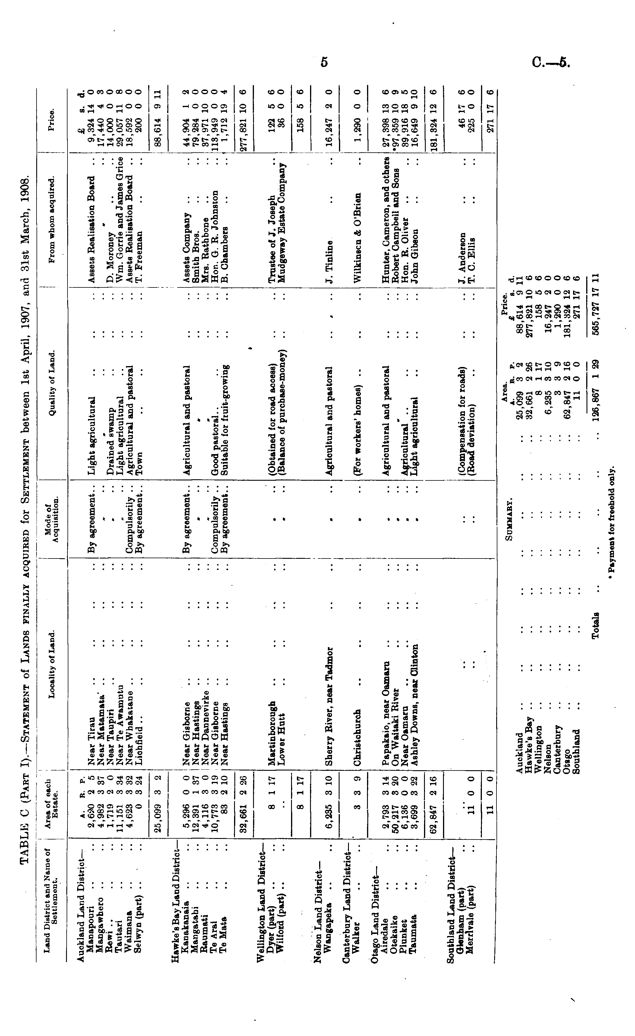o .-.. Area. Price. Summary. a. » p. £ b A Auckland .. .. .. .. .. .. .. .. 25,099 3 2 88,614 9 11 Hawke's Bay .. .. .. .. .. .. .. 32,661 2 26 277,82110 6 Wellington .. .. .. .. .. .. 8 1 17 158 5 6 Nelson .. .. .. .. 6,235 3 10 16,247 2 0 Canterbury .. .. .. .. .. .. .. 339 1,290 0 0 Otago .. .. .. .. .. .. .. 62,847 2 16 181,324 12 6 Southland .. .. .. .. .. .. .. 11 0 0 271 17 6 Totals .. .. .. .. .. 126,867 1 29 565,727 17 11 * Payment for freehold only.