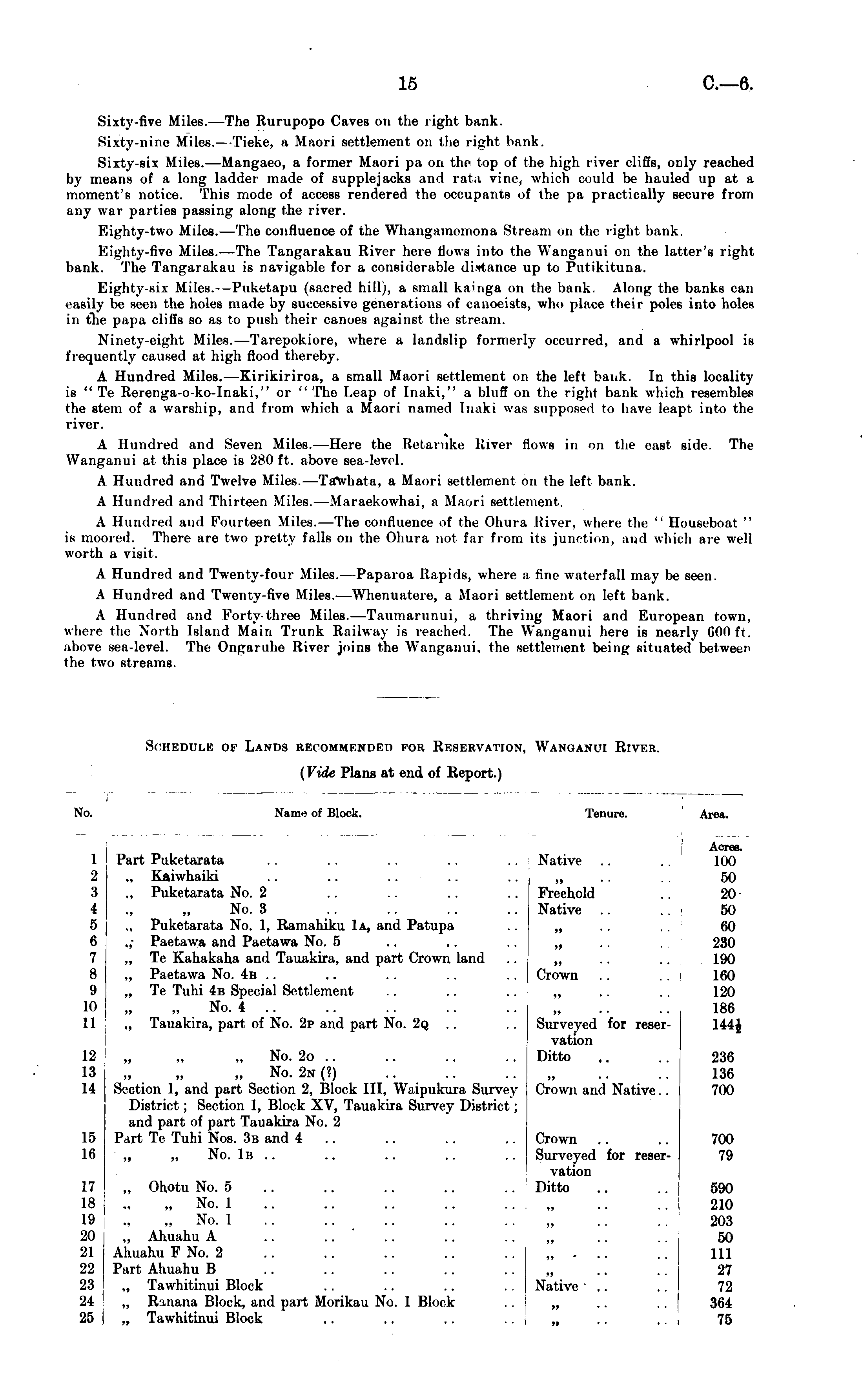 Schedule of Lands recommended for Reservation, Wanganui River. (Vide Plans at end of Report.)