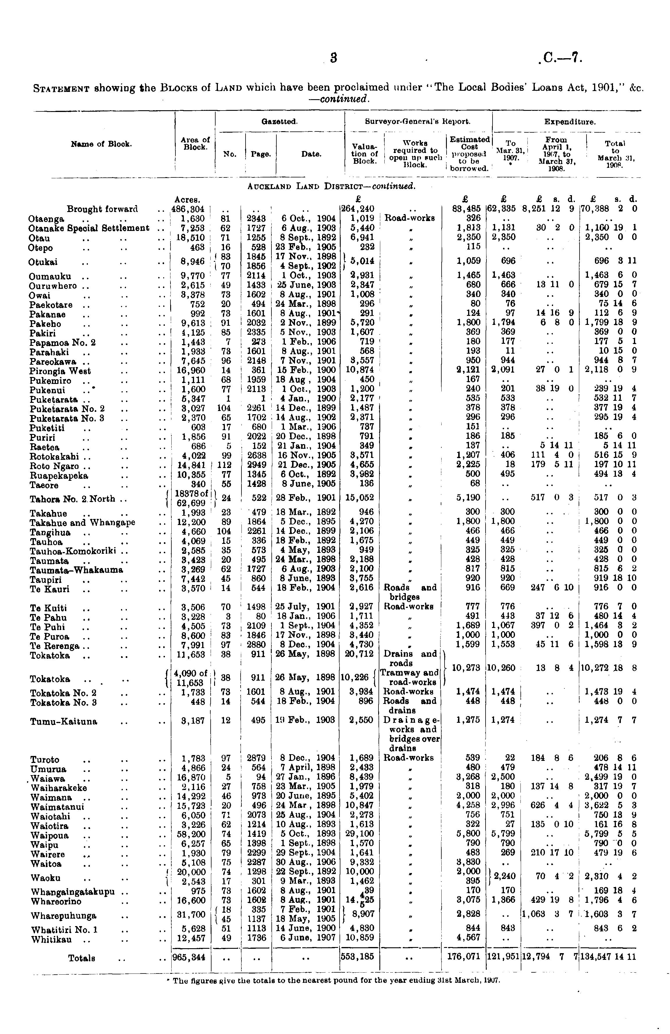 izettt'd. Surveyor-General's Report. Expenditure. Name of Block. Alea Of Block. No. P»ge. Works Estimated - From T . . mock. I borrowed 1806. 19n • AUCI land Land District — continued. Brought forward Otaenga Otanake Special Settlement .. Otau Otepo Otukai Oumauku Ouruwhero .. Owai Paekotare Pakanae Pakeho Pakiri Papamoa No. 2 Paraliaki Pareokawa Pirongia West Pukemiro Pukenui ..* Puketarata Puketarata No. 2 Puketarata No. 3 Puketiti Puriri Raetea Rotokakahi Roto Ngaro Ruapekapeka Taeore TahoraNo. 2 North .. Acres. 486,304 I .. 1,630 81 I 2343 7,253 62 1727 18,510 71 1255 403 1C 528 „ o . fi I 83 1845 8,946 , 70 1856 9,770 77 2114 i 2,615 49 1433 8,37* 73 1602 752 20 494 992 73 1001 9,613 91 2032 4,125 85 2335 I 1,443 7 273 1,933 73 1601 7,645 96 2148 16,960 14 361 1,111 08 1959 I 1,600 77 ' 2118 5,347 1 1 3,027 104 2261 2,370 65 1702 603 17 680 1,856 91 2022 686 5 152 4,022 99 2638 14,841 112 : 2949 10,355 77 1345 340 55 1428 18378 of > , ,„„ 62,699 ) 24 ' 522 1 1,993 23 479 i 12,200 89 1864 4,660 104 2261 4,069 15 336 I 2,585 35 573 ' 3,423 20 495 3,269 62 1727 7,442 45 860 3,570 14 544 £ £ £ £ s. d. £ s. d. 264,240 .. 83,485 62,335 8,251 12 9 70,388 2 0 6 Oct., 1904 1,019 Road-works :!2C. 6 Aug., 1903 5,440 . 1,813 1,131 30 2 0 1,160 19 1 8 Sept., 1892 6,941 „ 2,350 2,350 .. 2,350 0 0 23 Feb., 1905 232 . 115 " Se° V t" 1902 ' 5 ' 0U ' 1,059 696 •• 696 3 U 1 Oct.,' 1903 2,931 . 1,465 1,403 .. 1,463 6 0 25 June, 1903 2,347 „ 680. 666 13 11 0J 679 15 7 8 Aug., 1901 1,008 „ 340 [ 340 .. 340 0 0 24 Mar., 1898 296 . SO 76 .. 75 14 6 8 Aug., 1901' 291 . 124 97 14 16 9 112 6 9 2 Nov., 1899 5,720 . 1,800 1,794 6 8 0 1,799 18 9 5 Nov., 1903 1,607 ,. 369 369 .. 369 0 0 1 Feb., 1906 719 . 180 177 .. 177 5 1 8 Aug., 1901 568 . 193 11 .. 10 15 0 7 Nov., 1901 3,557 . 950, 944 .. 944 8 7 15 Feb., 1900 10,874 „ 2,121 2,091 27 0 1 2,118 0 9 18 Aug , 1904 450 „ 167 1 Oct., 1903 1,200 . 240 201 38 19 0 239 19 4 4 Jan., 1900 2,177 : . 535 I 533 .. 532 11 7 14 Dec, 1899 1,487 ,, 378 378 .. 377 19 4 14 Aug., 1902 2,371 „ 296 296 .. 396 Lβ I 1 Mar., 1906 737 „ 151 20 Dec, 1898 791 . 186 185 .. 185 6 0 21 Jan., 1904 349 „ L87 .. 5 14 11 5 14 11 16 Nov., 1905 3,571 „ 1,207 406 111 4 0 516 15 9 21 Dec, 1905 4,655 „ 2,225 18 179 5 11 197 10 11 6 Oct., 1892 3,982 . 500 495 .. 494 13 4 8 June, 1905 136 , 08 28 Feb., 1901 15,052 „ .5,190 .. 517 0 8 517 n 8 Takahue Takahue and Whangape Tangihun Tauhoa Tauhoa-Komokoriki Taumata Taumata-Whakauma Taupiri Te Kauri Te Kuiti Te Pahu Te Puhi Te Puroa Te Rerenga Tokatoka Tokatoka Tokatoka No. 2 Tokatoka No. 3 Tumu-Kaituna 3,506 70 1498 3,228 3 ; 80 4,505 73 2109 8,600 83 1846 7,991 97 2880 11,653 38 911 4,090 of I 38 91 , 11,653 I d8 911 1,733 73 1601 448 j 14 544 3,187 12 495 18 Mar., 1892 946 . 300 300 .... 300 0 0 5 Dec, 1895 4,270 . 1,800 1,800 .. 1,800 0 0 14 Dec, 1899 2,106 . 466 466 .. 466 0 0 18 Feb., 1892 1,675 „ 149 449 .. 449 0 0 4 May, 1893 949 ■ „ 325 325 .. 325 0 0 24 Mar., 1898 2,188 „ 428 428 .. 428 0 0 6 Aug., 1903 2,100 . 817 815 .. 815 6 2 8 June, 1893 3,755 „ 920 920 .. 919 18 10 18 Feb., 1904 2,616 I Roads and 916 669 247 6 10 916 0 0 bridges 25 July, 1901 2,927 Roadworks 777 776 .. 776 7 0 18 Jan., 1906 1,711 , 491 443 37 12 6 480 14 4 1 Sept., 1904! 4,352 „ 1,689] 1,067 397 0 2 1,464 3 2 17Nov., 1898 i 3,440 . 1,000 1,000 .. 1,000 0 0 8 Dec, 1904 4,730 . 1,599 1,553 45 11 6 1,598 13 9 I 26 May, 1898 20,712 Drains and \ roads , - 10,273 10,260 18 8 4 10,272 18 8 26 May, 1898 10,226 ( *£&£ 8 Aug., 1901 3,934 Road-works 1,474 1,474 .. 1,473 19 4 18 Feb., 1904 896 Roads and 448 448 .. 448 0 0 drains HI Feb., 1903 2,550 Drainage- 1,275 1,274 .. 1,274 7 7 works and bridges over drains 8 Dec, 1904 1,689 Road-works 539 22 184 8 6 206 8 6 7 April, 1898 2,433 . 480 479 .. 478 14 11 27 Jan., 1896 8,439 . 3,268 2,500 .. 2,499 19 0 23 Mar., 1905 1,979 „ 318 180 137 14 8 317 19 7 20 June, 1895 5,402 „ 2,000 2,000 .. 2,000 0 0 24 Mar , 1898 10,847 . 4,258 ' 2,996 626 4 4 3,622 25 Aug., 1904 2,273 „ 756 751 .. 750 13 9 10 Aug., 1893! 1,613 i „ 322 27 135 0 10 161 16 8 5 Oct., 1893 29,100 „ 5,800 5,799 .. 5,799 5 5 1 Sept., 1898 1,570 . 790 790 .. 790 0 0 29 Sept., 1904 1,641 „ 483 269 210 17 10 479 19 6 30 Aug., 1906 9,332 . 3,830 j 22 Sept., 1892 10,000 . 2,000 !„„„ „ , I) Mar., L898 1,462 „ 395 f. '**" W 1 2 J,dlU 4 A 8 Aug., 1901 .39, . 170 170 .. 109 18 4 8 Aug., 1901 14,g25 „ 3,075 1,366 429 19 8 1,796 4 6 18 May,' 1«» } 8 ' 907 2 ' 828 " 568 * 7 *«* 3 7 ! 14 June, 1900 4,830 . 844 843 .. 843 6 2 6 June, 1907 i 10,859 . 4,567 Turoto TJmurua , Waiawa Waiharakeke Waimana Waimatanui Waiotahi Waiotira Waipoua Waipu Wairere Waitoa i 1,783 97 2879 4,860 24 564 16,870 5 94 2,110 27 758 14,292 l<; 973 15,723 20 496 6,050 71 2073 3,226 62 1214 58,200 74 1419 6,257 65 1398 1,930 79 2299 5,108 : 75 i 2287 20,000 74 1298 2,543 17 301 975 73 1602 16,600 73 1602 97 24 5 27 46 20 71 62 74 65 79 75 74 17 73 73 ( 18 (45 51 49 2879 564 94 758 973 496 2073 1214 1419 1398 22!)!) 2287 1298 301 1602 1602 335 1137 1113 1736 Waoku Whangaingatakupu Whareorino Wharepuhunga „ I 18 335 31,700 - 4g U37 Whatitiri No. 1 Whitikau .. 5,628 51 1113 12,457 49 1736 Totals 965,344 553,185 176,071 121,951 12,794 7 7134,547 14 11 ■ Thu fl| [an live the totals to the nearest lund for tl ear eudiu list March, 1907.