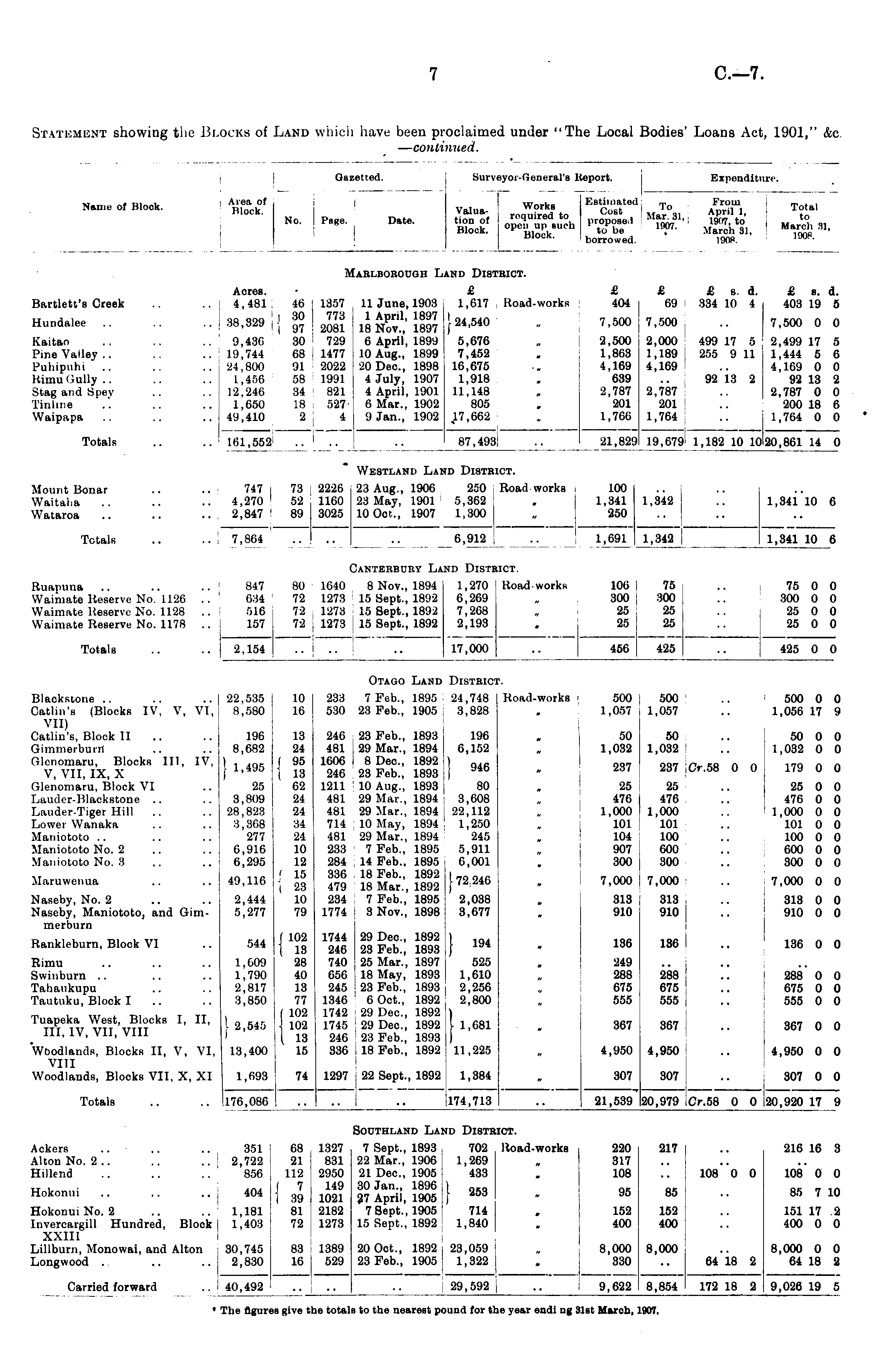 Name of Block. Gazetted. Area of Klock. No. Page. Date. Surveyor-General's Heport. Expenditure. Worka Estimated T From T^toi V o l,, a " OTKH Ciict JO Aiivil 1 lOtal Blook - borrowed. 1900. IiX)8 - Expenditure Marlborodgi Marlborodgh L ii Land District. Bartlett'e Creek Acres. ...I 4,481 ; ITlAKljlJlJtfUUUtt U 46 1357 11 June, 1903 iABLBOBODGH I Hundalee Kaitao Pine Valley .. Puhipuhi Rimu Gully .. Stag and Spey Tinline Waipapa 's Creek !P lley .. ii ally .. i Spey a .. Totals .. 88,829 IJ 9,436 .. lit,744 .. 24,800 L.456 .. 12,246 1,650 .. 49,410 Acres. 4,481; 46 1357 11 June, IS „ q9q i 30 773 1 April, IE .. i |j g7 2081 18NoVii u 9,430 30 729 6 April, If .. lit,744 68 i 1477 10 Aug., If .. 24,800 91 2022 20 Dec, If L.456 58 i 1991 4 July, l< .. 12,246 34 ' 821 4 April, 11 1,650 18 527 6 Mar., 1! .. 49,410 2 4 9 Jan., IS .. ' 161.552 1 Acres. 4,481! 46 1357 48 qoq I 30 773 .38,329 |j g7 2081 9,43(1 80 729 19,744 68 j 1477 24,800 91 2022 1,456 58 1991 12,246 34 ' 821 1,650 18 52749,410 2 4 30 773 1 April, 1897 97 2081 18 Nov., 1897 80 7-29 6 April, 1899 68 j 1477 10 Aug., 1899 91 2022 20 Dec, 1898 58 1991 4 July, 1907 34 j 821 4 April, 1901 18 527- 6 Mar.. 1902 2 4 9 Jan., 1902 11 June, 1903 1 April, 1897 18 Nov., 1897 6 April, 189'J 10 Aug., 1899 •20 Dec, 1898 4 July, 1907 4 April, 1901 6 Mar., 1902 9 Jan., 1902 901 H'X, 891 89! 891 891 90' '.in .90! 90! £ £ £ £ s. d. £ e. d. 3 I 1,617 Road-works 404 69 i 334 10 4 403 19 5 1 '24,540 „ 7,500 7,500 .. 7,500 0 0 19 5,676 „ 2,500(2,000 499 17 5 2,499 17 5 19 7,452 „ 1,863 t 1,189 255 9 11 1,444 5 6 18 16,675 „ 4,169 4,169 .. 4,169 0 0 )7 I 1,918 . 639 92 18 2 92 13 2 )1 11,148 „ 2,787 2,787 .. ' 2,787 0 0 )2 805 . 201 201 .. 200 18 6 )2 ,17,662 . 1,766 1,764 .. j 1,764 0 0 87,493i .. 21,829 1,182 10 10120,861 14 0 Totals .. ' 161,552 87,493! 21,829 19,679 Westland Lai id District. Mount Bonar Waitaha Wataroa 747 ] .. 4,270 ' 2,847 I 73 I 2226 23 Aug., 1906 52 1160 23 May, 1901 89 3025 10 Oct., 1907 250 I Road works i 5,362 : 1,300 ; 100 1,341 250 1,342 j 1,341 10 6 Totals 7,864 .. „ „ 6,912 1 1,691 1,342 j 1,341 10 6 i.oai j. i, ■^α 1,341 1U b Canterbury Land Distb ;ict. Ruapuna Waimate Reserve No. 1126 Waimate Reserve No. 1128 Waimate Reserve No. 1178 ..I 847 .. 634 516 157 80 1640 8 Nov., 1894 I 1,270 72 1273 ! 15 Sept., 1892 6,269 72 1273 15 Sept., 1892 7,268 72 1273 15 Sept., 1892 2,193 Road works 106 300 25 25 75 300 25 25 75 0 0 300 0 0 25 0 0 25 0 0 Totals 2,154 17,000 456 425 425 0 0 Otago Land Distric Blaokstone .. .. .. 22,535 Catlin's (Blocks IV, V, VI, 8,580 VII) Catlin's, Block II .. 196 Qimmerburrt .. .. 8,682 Glenomaru, Blocks III, IV, | , .„. V, VII, IX, X f 1,4yD Glenomaru, Block VI .. 25 Lauder-Blackstone .. .. 3,809 Lrvuder-Tiger Hill .. .. 28,823 Lower Wanaka .. .. 3,368 Maniototo .. .. .. 277 Maniototo No. 2 .. .. 6,916 Maniototo No. 8 .. .. 6,295 22,535 8,580 10 16 233 7 Feb., 1895 530 23 Feb., 1905 24,748 3,828 Road-works 500 1,057 500 1,057 500 0 0 1,056 17 9 196 8,682 I 1,495 25 3,809 28,823 3,368 277 6,916 6,295 13 24 I 95 I 13 62 24 24 34 24 10 12 f 15 t 23 10 79 246 23 Feb., 1893 481 , 29 Mar., 1894 1606 i 8 Dec, 1892 246 23 Feb., 1893 1211 10 Aug., 1893 481 29 Mar., 1894 481 29 Mar., 1894 714 , 10 May, 1894 481 29 Mar., 1894 233 7 Feb., 1895 284 14 Feb.. 1895 336 18 Feb., 1892 479 18 Mar., 1892 234 7 Feb., 1895 1774 3 Nov., 1898 196 6,152 946 80 3,608 22,112 1,250 245 5,911 6,001 50 1,032 237 25 476 1,000 101 104 907 300 50 1,032 237 O.58 0 0 25 476 1,000 101 100 600 300 50 0 0 1,032 0 0 179 0 0 25 0 0 476 0 0 1,000 0 0 101 0 0 100 0 0 600 0 0 300 0 0 Maruwenua .. .. 49,116 49,116 I 72 ; 246 7,000 7,000 7,000 0 0 Naseby, No. 2 .. .. 2,444 Naseby, Maniototo, and Gim- 5,277 merburn 2,444 5,277 2,038 3,677 H 313 910 313 910 318 0 0 910 0 0 Rankleburn, Block VI .. 544 Rimu .. .. .. 1,609 Swinburn .. .. .. 1,790 Tahaukupu .. .. 2,817 Tautuku, Block I .. .. 3,850 544 1,609 1,790 2,817 3,850 f 102 I 13 28 40 13 77 f 102 \ 102 I 13 15 1744 29 Dec, 1892 246 I 23 Feb., 1893 740 ; 25 Mar., 1897 656 18 May, 1893 245 : 23 Feb., 1893 1346 6 Oct., 1892 1742 29 Dec, 1892 1745 29 Dec, 1892 246 23 Feb., 1893 336 18 Feb., 1892 J 194 525 1,610 , 2,256 2,800 » a 136 249 288 675 555 136 288 675 555 136 0 0 288 0 0 675 0 0 555 0 0 Tuapeka West, Blocks I, II, | „ _. r III, IV, VII, VIII f »,o*o I 2,545 I 1,681 11,225 a 367 367 367 0 0 Woodlands, Blocks II, V, VI, 18.40C VIII Woodlands, Blocks VII, X, XI 1,09$ 13,400 4,950 4,950 4,950 0 0 1,693 74 1297 22 Sept., 1892 1,384 307 307 307 0 0 Totals .. .. 170,08( 176,086 174,713 21,539 20,979 O.58 0 0 20,920 17 9 Ackers .. .. .. 351 Alton No. 2.. .. .. 2,722 Hillend .. .. . . 856 Southland Lα: *d Dist [CT. Hokonui .. .. .. 404 68 21 112 f 7 I 39 81 72 1327 831 2950 149 1021 2182 1273 7 Sept., 1893 22 Mar., 1906 21 Dec, 1905 30 Jan., 1896 27 April, 1905 7 Sept., 1905 15 Sept., 1892 702 1,269 433 I 253 Road-works 220 317 108 95 217 85 108 "o 0 216 16 3 108 0 0 85 7 10 HokonuiNo. 2 .. .. 1,181 Invercargill Hundred, Block 1,403 XXIII Lillburn, Monowai, and Alton 30,745 Longwood . .. .. 2,830 714 1,840 152 400 152 400 151 17 2 400 0 0 83 16 1389 529 20 Oct., 1892 23 Feb., 1905 23,059 1,322 */ 8,000 330 8,000 64'ie 2 8,000 0 0 64 18 2 Carried forward .. 40,492 29,592 9,622 8,854 172 18 2 9,026 19 5 • The flgun is give tl ie totals to the nearest iund for tl ie year endi ng list March, JOT,