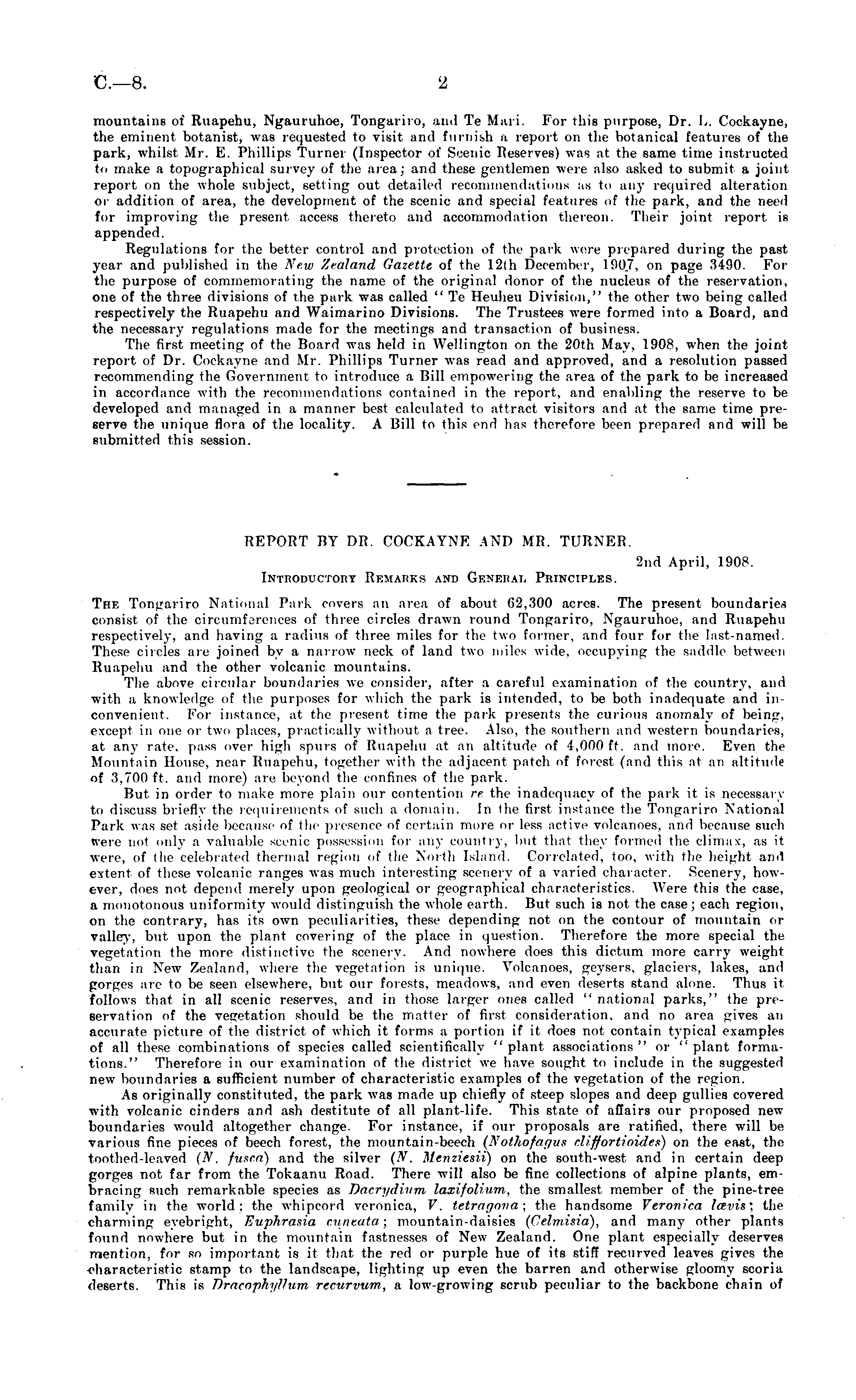 mountains of Ruapehu, Ngauruhoe, Tongariro, and Te Mari. For this purpose, Dr. L. Cockayne, the eminent botanist, was requested to visit and furnish a report on the botanical features of the park, whilst Mr. E. Phillips Turner (Inspector of Scenic Reserves) was at the same time instructed to make a topographical survey of the area; and these gentlemen were also asked to submit a joint report on the whole subject, setting out detailed recommendations us to any required alteration or addition of area, the development of the scenic and special features of the park, and the need for improving the present access thereto and accommodation thereon. Their joint report is appended. Regulations for the better control and protection of the park were prepared during the past year and published in the New Zealand Gazette of the 12(h December, 190,7, on page 3490. For the purpose of commemorating the name of the original donor of the nucleus of the reservation, one of the three divisions of the park was called " Te Heuheu Division," the other two being called respectively the Ruapehu and Waimarino Divisions. The Trustees were formed into a Board, and the necessary regulations made for the meetings and transaction of business. The first meeting of the Board was held in Wellington on the 20th May, 1908, when the joint report of Dr. Cockayne and Mr. Phillips Turner was read and approved, and a resolution passed recommending the Government to introduce a Bill empowering the area of the park to be increased in accordance with the recommendations contained in the report, and enabling the reserve to be developed and managed in a manner best calculated to attract visitors and at the same time preserve the unique flora of the locality. A Bill to this end lias therefore been prepared and will be submitted this session.