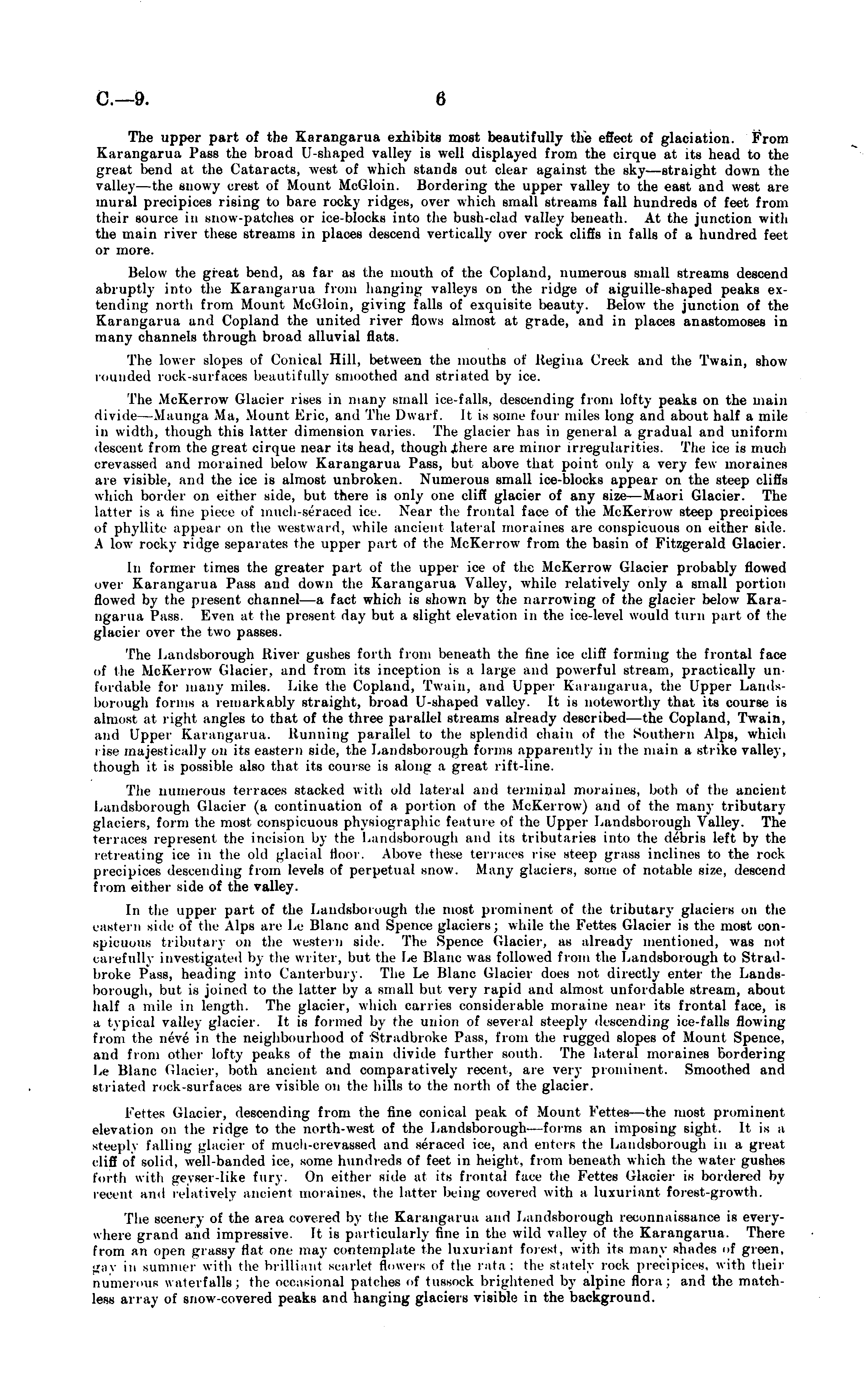 The upper part of the Karangarua exhibits most beautifully the effect of glaciation. From Karangarua Pass the broad U-shaped valley is well displayed from the cirque at its head to the great bend at the Cataracts, west of which stands out clear against the sky—straight down the valley—the snowy crest of Mount McGloin. Bordering the upper valley to the east and west are mural precipices rising to bare rocky ridges, over which small streams fall hundreds of feet from their source in snow-patches or ice-blocks into the bush-clad valley beneath. At the junction with the main river these streams in places descend vertically over rock cliffs in falls of a hundred feet or more. Below the great bend, as far as the mouth of the Copland, numerous small streams descend abruptly into the Karangarua from hanging valleys on the ridge of aiguille-shaped peaks extending north from Mount McGloin, giving falls of exquisite beauty. Below the junction of the Karangarua and Copland the united river flows almost at grade, and in places anastomoses in many channels through broad alluvial flats. The lower slopes of Conical Hill, between the mouths of Regina Creek and the Twain, show rounded rock-surfaces beautifully smoothed and striated by ice. The McKerrow Glacier rises in many small ice-falls, descending from lofty peaks on the main divide —Maunga Ma, Mount Eric, and The Dwarf. It is some four miles long and about half a mile in width, though this latter dimension varies. The glacier has in general a gradual and uniform descent from the great cirque near its head, though there are minor irregularities, The ice is much orevassed and morained below Karangarua Pass, but above that point only a very few moraines are visible, and the ice is almost unbroken. Numerous small ice-blocks appear on the steep cliffs which bonier on either side, but there is only one cliff glacier of any size Maori Glacier. The latter is a fine piece of liiucli-seraced ice. Near the frontal face of the McKerrow steep precipices of phyllite appear on the westward, while ancient lateral moraines are conspicuous on either side. A low rocky ridge separates the upper part of the McKerrow from the basin of Fitzgerald Glacier. In former times the greater part of the upper ice of the McKerrow Glacier probably flowed over Karangarua Pass and down the Karangarua Valley, while relatively only a small portion flowed by the present channel—a fact which is shown by the narrowing of the glacier below Kara ngarua Pass. Even at the present daj but a slight elevation in the ice-level would turn part of the glacier over the two passes. The Landsborough River gushes forth from beneath the fine ice cliff forming the frontal face of the McKerrow Glacier, and from its inception is a huge and powerful stream, practically unfordable for many miles. Like the Copland, Twain, and Upper Karangarua, the Upper Landsborough forms a remarkably straight, broad I'-shaped valley. It is noteworthy that its course is almost at right angles to that of the three parallel streams already described—the Copland, Twain, and Upper Karangarua. Running parallel to the splendid chain of the Southern Alps, which i ise majestically on its eastern side, the Landsborough forms apparently in the main a strike valley, though it is possible also that its course is along a great rift-line. The numerous terraces stacked with old lateral and terminal moraines, both of the ancient Landsborough Glacier (a continuation of a portion of the McKerrow) and of the many tributary glaciers, form the most conspicuous physiographic feature of the Upper Landsborough Valley. The terraces represent the incision by the Landsborough and its tributaries into the debris left by the retreating ice in the old glacial Hour. Above these terraces rise steep grass inclines to the rock precipices descending from levels of perpetual snow. Many glaciers, some of notable size, descend from either side of the valley. In the upper part of the Landsborough the most prominent of the tributary glaciers on the eastern side of the Alps are Le Blanc and Spoiico glaciers; while the Lottos Glacier is the most conspicuous tributary on the western side. The Spenee Glacier, as already mentioned, was not carefully investigated by the writer, but the Le Blanc was followed from the Landsborough to St lad broke Pass, heading into Canterbury. The Le Blanc Glacier does not directly enter the Landsborough, but is joined to the latter by a small but very rapid and almost unfordable stream, about half a mile in length. The glacier, which carries considerable moraine near its frontal face, is a typical valley glacier. It is formed by the union of several steeply descending ice-falls flowing from the neve in the neighbourhood of Stradbroke Pass, from the rugged slopes of Mount Spenee, and from other lofty peaks of the main divide further south. The lateral moraines Bordering Le Blanc Glacier, both ancient and comparatively recent, are very prominent, Smoothed and striated rock-surfaces are visible mi the hills to the north of the glacier. I'cites Glacier, descending from the fine conical peak of Mount Fettes the most prominent elevation on the ridge to the north-west of the Landsborough- forms an imposing sight. It is a steeplj falling glacier of muoh-orevassed and seraoed ice. and enters the Landsborough in a great cliff of solid, well-banded ice, some hundreds of feet in height, from beneath which the water gushes forth with oeyser-like fury. Un either side at its frontal face the Lottos Glacier is bordered by recent ami relatively ancient moraines, the latter being covered with a luxuriant forest-growth. The scenery of the area covered by the Karangarua ami Landsborough reconnaissance is everywhere grand and impressive. It is particularly fine in the wild valley of the Karangarua. There from an open grassy flat one may contemplate the luxuriant forest, with its many shades of green, gay iii summer with the brilliant scarlet flowers o