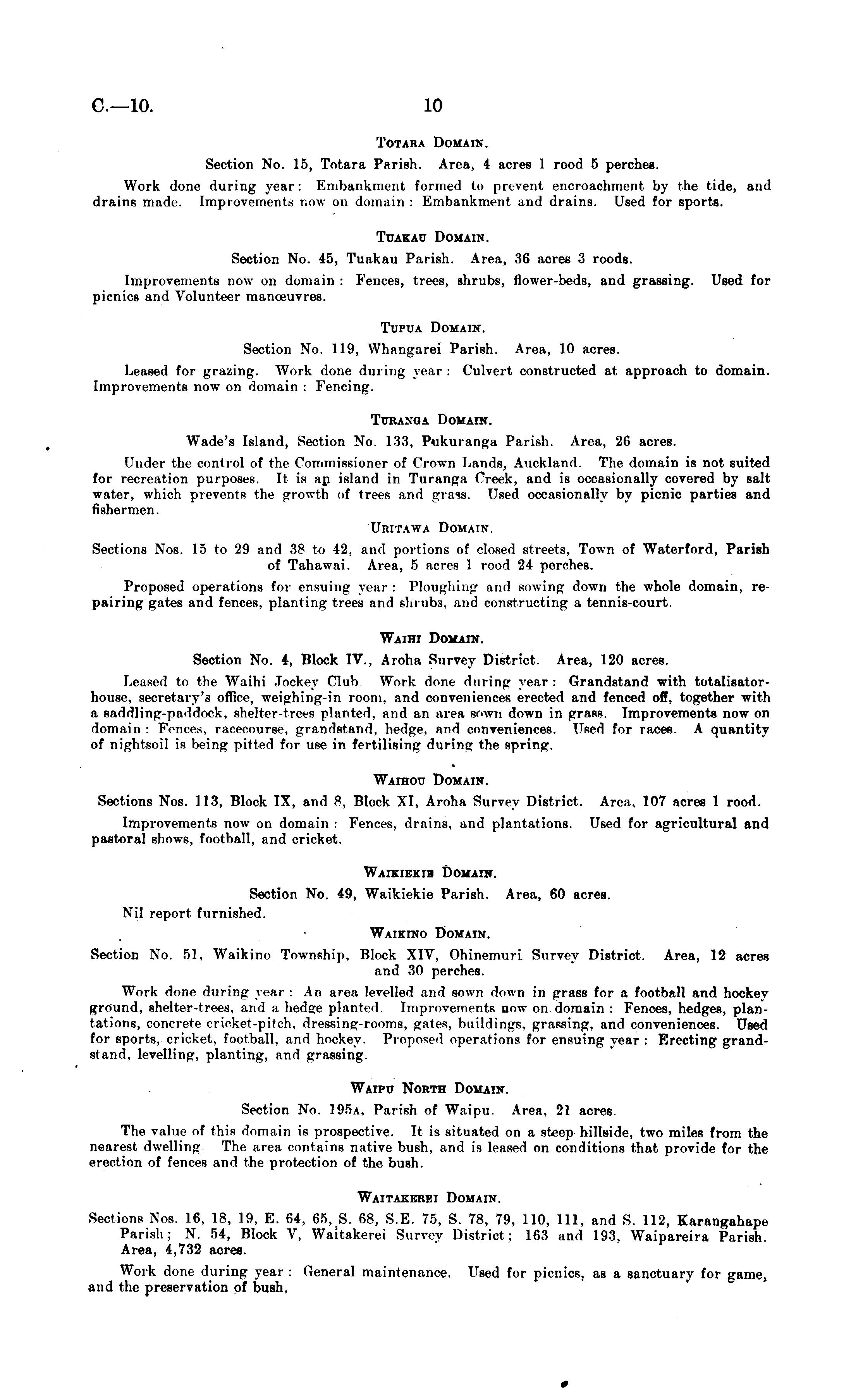 Totara Domain. Section No. 15, Totara Parish. Area, 4 acres 1 rood 5 perches. Work done during year: Embankment formed to prevent encroachment by the tide, and drains made. Improvements now on domain : Embankment and drains. Used for sports. Tuakau Domain. Section No. 45, Tuakau Parish. Area, 36 acres 3 roods. Improvements now on domain : Fences, trees, shrubs, flower-beds, and grassing. Used for picnics and Volunteer manoeuvres. Tupua Domain. Section No. 119, Whangarei Parish. Area, 10 acres. Leased for grazing. Work done during year : Culvert constructed at approach to domain. Improvements now on domain : Fencing. Turanga Domain. Wade's Island, Section No. 133, Pukuranga Parish. Area, 26 acres. Under the control of the Commissioner of Crown Lands, Auckland. The domain is not suited for recreation purposes. It is an island in Turanga ("reek, and is occasionally covered by salt water, which prevents the growth of trees and grass Used occasionally by picnic parties and fishermen. Uritawa Domain. Sections Nos. 15 to 29 and 38 to 42, and portions of closed streets, Town of Waterford, Parish of Tahawai. Area, 5 acres 1 rood 24 perches. Proposed operations for ensuing year : Ploughing and sowing down the whole domain, repairing gates and fences, planting trees and shrubs, and constructing a tennis-court. Waihi Domain. Section No. 4, Block IV., Aroha Survey District. Area, 120 acres. Leased to the AVaihi Jockey Club Work done during year : Grandstand with totalisatorhouse, secretary's office, weighing-in room, and conveniences erected and fenced off, together with a saddling-paddock, shelter-trees planted, and an area sown down in grass. Improvements now on domain : Fences, racecourse, grandstand, hedge, and conveniences. Used for races. A quantity of nightsoil is being pitted for use in fertilising during the spring. Waihou Domain. Sections Nos. 113, Block IX, and 8, Block XI, Aroha Survey District. Area, 107 acres 1 rood. Improvements now on domain : Fences, drains, and plantations. Used for agricultural and pastoral shows, football, and cricket. Waikiekie Domain. Section No. 49, Waikiekie Parish. Area, 60 acres. Nil report furnished. Waikino Domain. Section No. 51, Waikino Township. Block XIV, Ohinemuri Survey District. Area, 12 acres and 30 perches. Work done during year : An area levelled and sown down in grass for a football and hockev ground, shelter-trees, and a hedge planted. Improvements now on domain : Fences, hedges, plantations, concrete cricket-pitch, dressing-rooms, gates, buildings, grassing, and conveniences. Used for sports, cricket, football, and hockey. Proposed operations for ensuing vear : Erecting grandstand, levelling, planting, and grassing. Waipu North Domain. Section No. 195a, Parish of Waipu. Area. 21 acres. The value of this domain is prospective. It is situated on a steep hillside, two miles from the nearest dwelling The area contains native bush, and is leased on conditions that provide for the erection of fences and the protection of the bush. Waitakerei Domain. Sections Xos. 16, 18, 19, E. 64, 65, S. 68, S.E. 75, S. 78, 79, 110, 111, and S. 112, Karangahape Parish: N. 54, Block V, Waitakerei Survey District: 163 and 193, Waipareira Parish. Area, 4,732 acres. Work done during year : General maintenance. Used for picnics, as a sanctuary for game, and the preservation of bush.