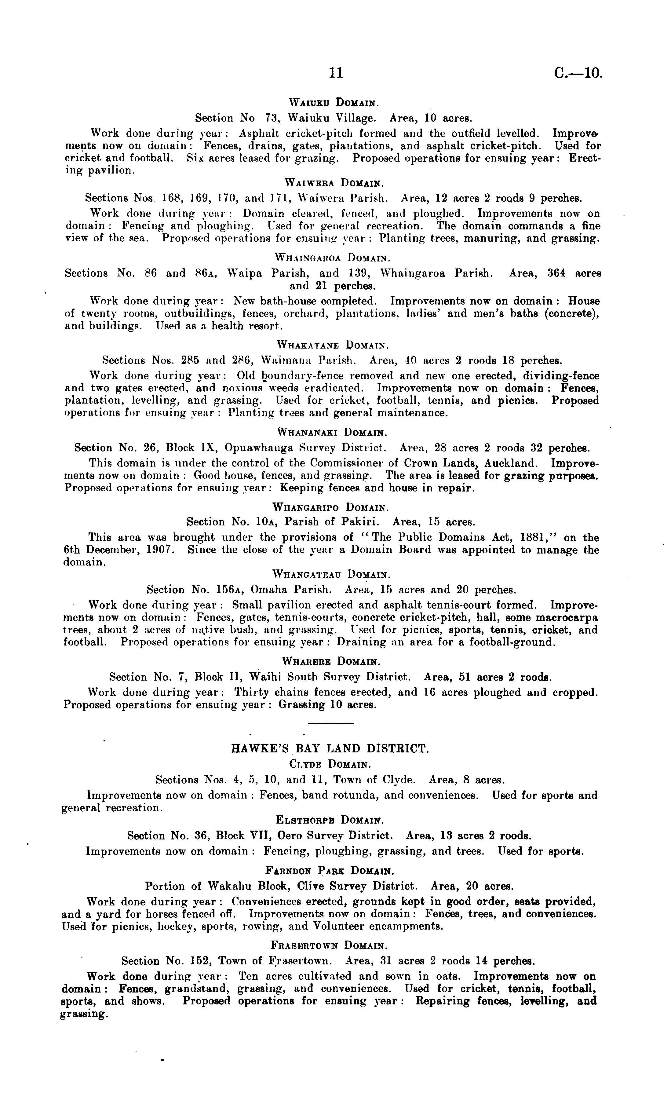 HAWKE'S BAY LAND DISTRICT. Clyde Domain. Sections Nos. 4, 5, 10, and 11, Town of Clyde. Area, 8 acres. Improvements now on domain : Fences, band rotunda, and conveniences. Used for sports and general recreation. Elsthorpe Domain. Section No. 36, Block VII, Oero Survey District. Area, 13 acres 2 roods. Improvements now on domain : Fencing, ploughing, grassing, and trees. Used for sports. Farndon Park Domain. Portion of Wakahu Block, Clive Survey District. Area, 20 acres. Work done during year : Conveniences erected, grounds kept in good order, seats provided, and a yard for horses fenced off. Improvements now on domain : Fences, trees, and conveniences. Used for picnics, hockey, sports, rowing, and Volunteer encampments. Frasertown Domain. Section No. 152, Town of Frasertown. Area, 31 acres 2 roods 14 perches. Work done during year : Ten acres cultivated and sown in oats. Improvements now on domain : Fences, grandstand, grassing, and conveniences. Used for cricket, tennis, football, sports, and shows. Proposed operations for ensuing year : Repairing fences, levelling, and grassing.