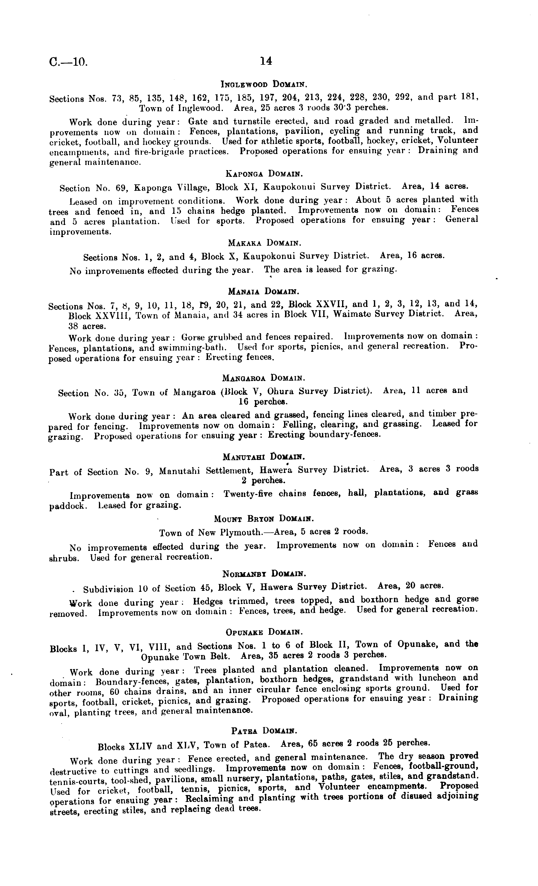 Inglewood Domain. Sections Nos. 73, 85, 135, 148, 162, 175, 185, 197, 204, 213, 224, 228, 230, 292, and part 181, Town of Inglewood. Area, 25 acres 3 mods 303 perches. Work done during year: Gate and turnstile erected, and road graded and metalled. Improvements now on domain : Fences, plantations, pavilion, cycling and running track, and cricket, football, and hockey grounds. Used for athletic sports, football, hockey, cricket, Volunteer encampments, and lire brigade practices. Proposed operations for ensuing year: Draining and general maintenance. Kaponga Domain. Section No. 69, Kaponga Village, Block XI, Kaupokouui Survey District. Area, 14 acres. Leased on improvement conditions. Work done during year: About 5 acres planted with trees and fenced in, and 15 chains hedge planted. Improvements now on domain: Fences and 5 acres plantation. Used for sports. Proposed operations for ensuing year: General improvements. Makaka Domain. Sections Nos. 1, 2, and 4, Block X, Kaupokonui Survey District. Area, 16 acres. No improvements effected during the year. The area is leased for grazing. Manaia Domain. Sections Nos. 7, 8, 9, 10, 11, 18, F9, 20, 21, and 22, Block XXVII, and 1, 2, 3, 12, 13, and 14, Block XXVIII, Town of Manaia, and 34 acres in Block VII, Waimato Survey District. Area, 38 acres. Work done during year : (hose grubbed and fences repaired. Improvements now on domain : Fences, plantations, and swimming-bath. Used for sports, picnics, and general recreation. Proposed operations for ensuing year : Erecting fences. Mangaroa Domain. Section No. 35, Town of Mangaroa (Block V, Ohura Survey District). Area, 11 acres and 16 perches. Work done during year : An area cleared and grassed, fencing lines cleared, and timber prepared for fencing. Improvements now on domain: Felling, clearing, and grassing. Leased for grazing. Proposed operations lor ensuing year : Erecting boundary-fences. Manutahi Domain. Part of Section No. 9, Manutahi Settlement, Hawera Survey District. Area, 3 acres 3 roods 2 perches. Improvements now on domain : Twenty-five chains fences, hall, plantations, and grass paddock. Leased for grazing. Mount Brton Domain. Town of New Plymouth. —Area, 5 acres 2 roods. No improvements effected during the year. Improvements now on domain : Fences and shrubs. I'sed for general recreation. Normanbt Domain. . Subdivision 10 of Section 45, Block V, Hawera Survey District. Area, 20 acres. Work done during year ; Hedges trimmed, trees topped, and boxthorn hedge and gorse removed. Improvements now on domain : Fences, trees, and hedge. Used for general recreation. Opunake Domain. Blocks I, IV, V, VI, VIII, and Sections Nos. 1 to 6 of Block 11, Town of Opunake, and the Opunake Town Belt. Area, 35 acres 2 roods 3 perches. Work done during year : Trees planted and plantation cleaned. Improvements now on domain: Boundary-fences, gates, plantation, boxthorn hedges, grandstand with luncheon and other rooms 60 chains drains, and an inner circular fence enclosing sports ground. Used for sports, football, cricket, picnics, and grazing. Proposed operations for ensuing year : Draining oval, planting trees, and general maintenance. Patea Domain. Blocks XLIV and XLV, Town of Patea. Area, 65 acres 2 roods 25 perches. Work done during year : Fence erected, and general maintenance. The dry season proved destructive to cuttings and seedlings. Improvements now on domain : Fences, football-ground, tennis-courts, tool-shed, pavilions, small nursery, plantations, paths, gates, stiles, and grandstand. Used for cricket, football, tennis, picnics, sports, and Volunteer encampments Proposed operations for ensuing year : Reclaiming and planting with trees portions of disused adjoining streets, erecting stiles, and replacing dead trees.