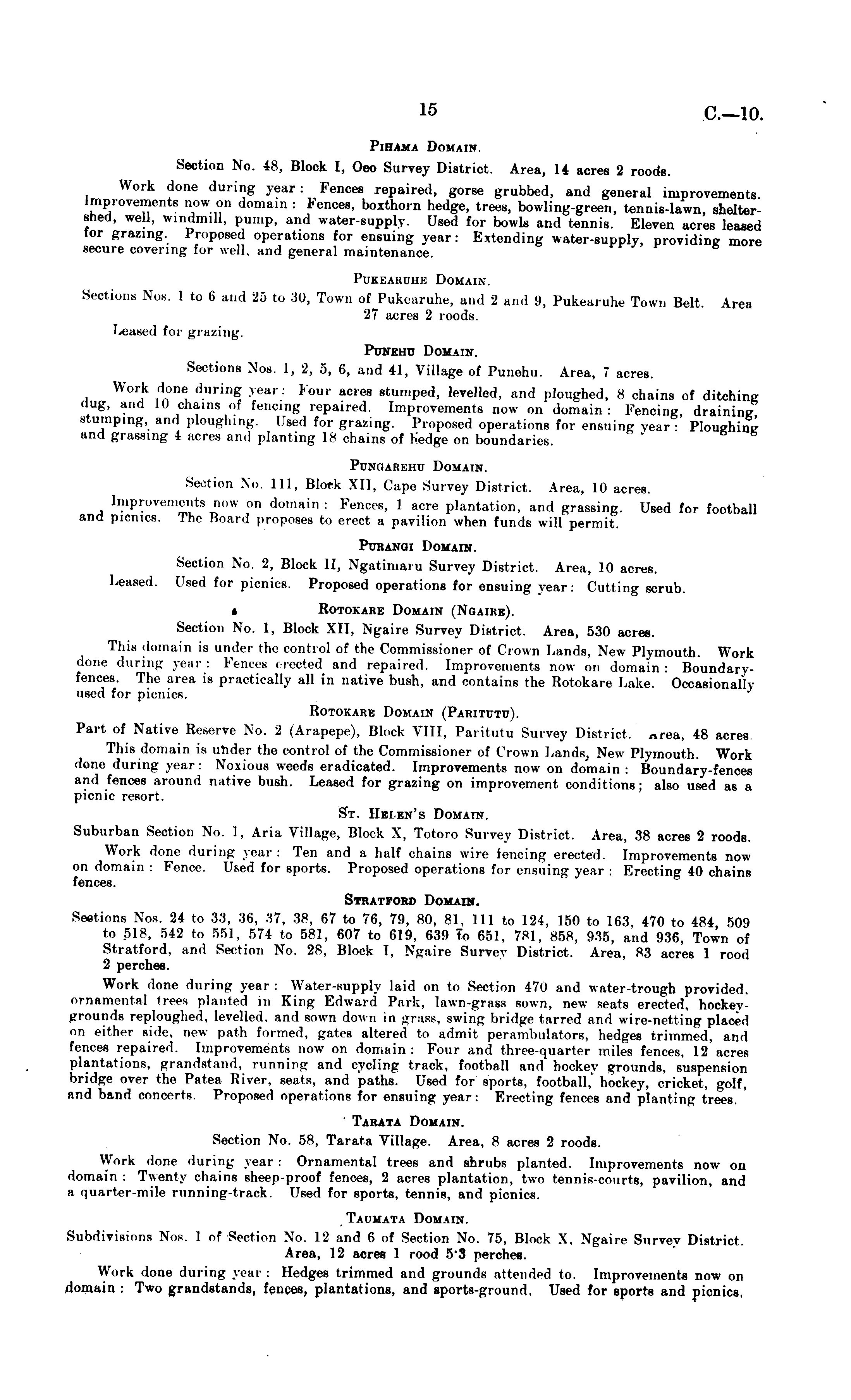 Pihama Domain. Section No. 48, Block I, Oeo Survey District. Area, 14 acres 2 roods. Work done during year: Fences repaired, gorse grubbed, and general improvements Improvements now on domain: Fences, boxthorn hedge, trees, bowling-green, tennis-lawn, sheltershed, well, wind,,,,11. p„,„ P , and water-supply. Used for bowls ami tennis. Eleven acres leased for grazing. Proposed operations for ensuing year: Extending water-supply, providing more secure covering for well, and general maintenance. PUKEARUHE DOMAIN Sections Nos. Ito 6 and 26 to 30, Town oM'ukearuhe, and 2 and 9, Pukearuhe Town Belt. Area 27 acres 2 roods. Leased for grazing. Punehu Domain. Sections Nos. 1, 2, 5, 6, and 41, Village of Punehu. Area, 7 acres. Work done during year: Four acres stumped, levelled, and ploughed, 8 chains of ditching riug, and 10 chains of fencing repaired. Improvements now on domain: Fencing, draining stumping, ami ploughing. C S ed for grazing. Proposed operations for ensuing vear : Ploughing and grassing 4 acres and planting 18 chains of Hedge on boundaries. Pungarehu Domain. Section No. 111, Blofk XII, Cape Survey District. Area, 10 acres. Improvements now on domain : Fences, 1 acre plantation, and grassing. Used for football and picnics. The Board proposes to erect a pavilion when funds will permit. PuRANGi Domain. Section No. 2, Block 11, Ngatimaru Survey District. Area, 10 acres. Leased. Used for picnics. Proposed operations for ensuing year : Cutting scrub. t Rotokare Domain (Ngaihe). Section No. 1, Block XII, Ngaire Survey District. Area, 530 acres. This domain is under the control of the Commissioner of Crown Lands. New Plymouth. Work done during year: Fences erected and repaired. Improvements now on domain: Boundaryfences. The area is practically all in native bush, and contains the Rotokare Lake. Occasionally used for picnics. Rotokare Domain (Paritutu). Part of Native Reserve No. 2 (Arapepe), Block VIII, Paritutu Survey District, 48 acres. This domain is under the control of the Commissioner of Crown Lands, New Plymouth. Work done during year: Noxious weeds eradicated. Improvements now on domain: Boundary-fences and fences around native bush. Leased for grazing on improvement conditions; also used as a picnic resort. St. Helen's Domain. Suburban Section No. 1, Aria Village, Block X, Totoro Survey District. Area, 38 acres 2 roods. Work done during year: Ten and a half chains wire fencing erected. Improvements now on domain : Fence. Used for sports. Proposed operations for ensuing year : Erecting 40 chains fences. Stratford Domain. Seetions Nos. 24 to 33, 36, 37, 38, 67 to 76, 79, 80. SI. 11l to 124, 150 to 163, 470 to 484 509 to 518, 542 to 551, 574 to 581, 607 to 619. 639 to 651, 781, 858, 935, and 936, Town of Stratford, and Section No. 28, Block I. Ngaire Survey District. Area. 83 acres 1 rood 2 perches. Work done during year : Water-supply laid on to Section 470 and water-trough provided, ornamental trees planted in King Edward Park, lawn-grass sown, new seats erected, hockeygrounds reploughed, levelled, and sown down in grass, swing bridge tarred and wire-netting placed on either side, new path formed, gates altered to admit perambulators, hedges trimmed, and fences repaired. Improvements now on domain : Four and three-quarter miles fences, 12 acres plantations, grandstand, running and cycling track, football and hockey grounds, suspension bridge over the Patea River, seats, and paths. Used for sports, football,' hockev, cricket, golf, and band concerts. Proposed operations for ensuing year: Erecting fences and planting trees. ' Tarata Domain. Section No. 58, Tarata Village. Area, 8 acres 2 roods. Work done during year : Ornamental trees and shrubs planted. Improvements now on domain : Twenty chains sheep-proof fences, 2 acres plantation, two tennis-courts, pavilion, and a quarter-mile running-track. Used for sports, tennis, and picnics. Taumata Domain. Subdivisions Nos. 1 of Section No. 12 and 6 of Section No. 75. Block X. Ngaire Survey District. Area, 12 acres 1 rood 5'3 perches. Work done during year: Hedges trimmed and grounds attended to. Improvements now on domain : Two grandstands, fences, plantations, and sports-ground. Used for sports and picnics.