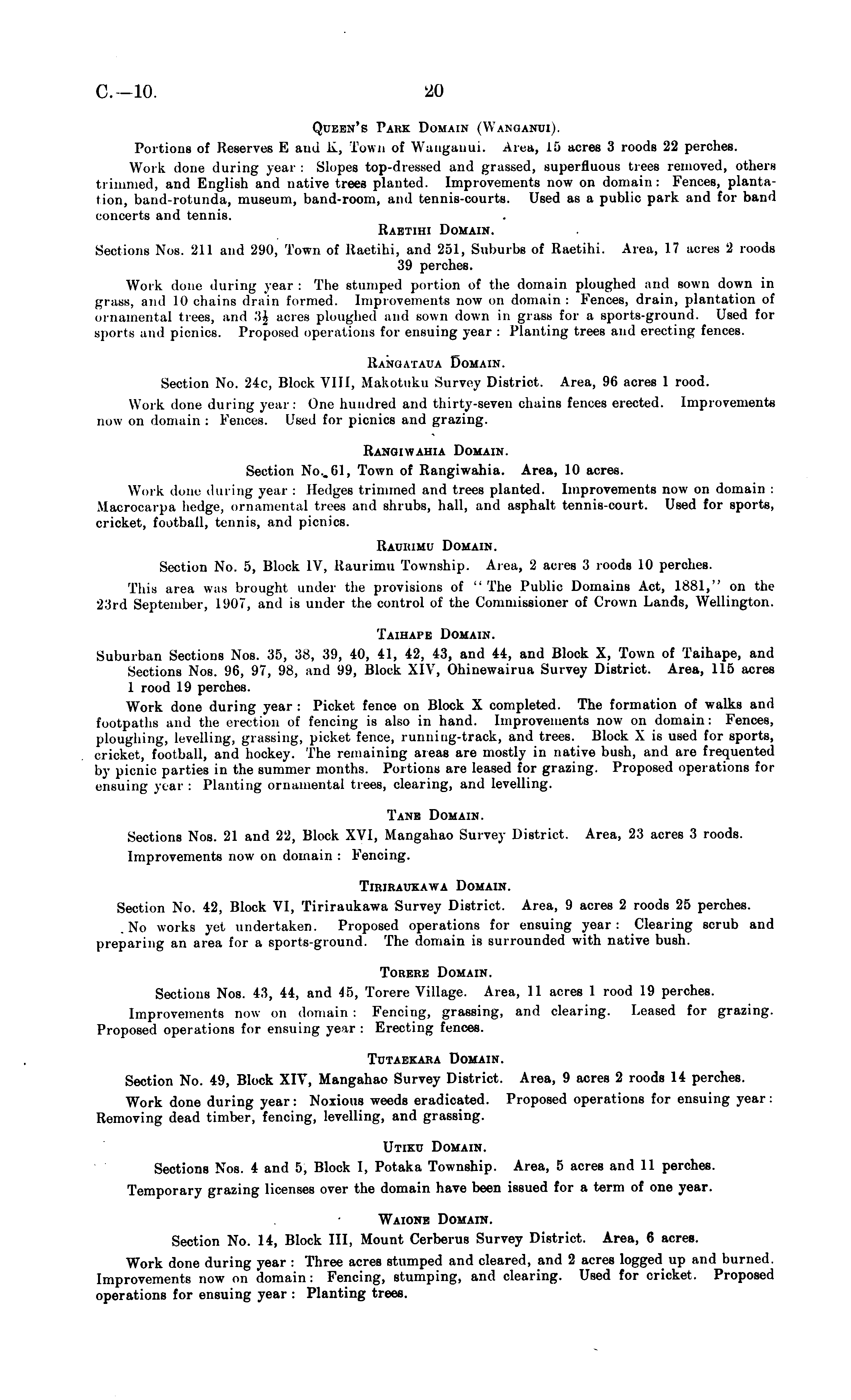 Queen's Park Domain (Wanganui). Portions of Reserves E and K, Town of Wanganui. Area, 15 acres 3 roods 22 perches. Work done during year : Slopes top-dressed and grassed, superfluous trees removed, others trimmed, and English and native trees planted. Improvements now on domain: Fences, plantation, band-rotunda, museum, band-room, and tennis-courts. Used as a public park and for band concerts and tennis. Raetihi Domain. Sections Nos. 211 and 290, Town of Raetihi, and 251, Suburbs of Raetihi. Area, 17 acres 2 roods 39 perches. Work done during year : The stumped portion of the domain ploughed and sown down in grass, and 10 chains drain formed. Improvements now mi domain : Fences, drain, plantation of ornamental trees, and 3J acres ploughed and sown down in grass for a sports-ground. Used for sports and picnics. Proposed operations for ensuing year : Planting trees and erecting fences. Rangataua Domain. Section No. 24c, Block VIII, Makotuku Survey District. Area, 96 acres 1 rood. Work done during year: One hundred and thirty-seven chains fences erected. Improvements now on domain : Fences. Used for picnics and grazing. Rangiwahia Domain. Section No.. 61, Town of Rangiwahia. Area, 10 acres. Work done during year : Hedges trimmed and trees planted. Improvements now on domain : Macrocarpa hedge, ornamental trees and shrubs, hall, and asphalt tennis-court. Used for sports, cricket, football, tennis, and picnics. Raurimu Domain. Section No. 5, Block IV, Raurimu Township. Area, 2 acres 3 roods 10 perches. This area was brought under the provisions of " The Public Domains Act, 1881," on the 23rd September, 1907, and is under the control of the Commissioner of Crown Lands, Wellington. Taihape Domain. Suburban Sections Nos. 35, 38, 39, 40, 41, 42, 43, and 44, and Block X, Town of Taihape, and Sections Nos. 96, 97, 98, and 99, Block XIV, Ohinewairua Survey District. Area, 115 acres 1 rood 19 perches. Work done during year : Picket fence on Block X completed. The formation of walks and footpaths and the erection of fencing is also in hand. Improvements now on domain: Fences, ploughing, levelling, grassing, picket fence, running-track, and trees. Block X is used for sports, cricket, football, and hockey. The remaining areas are mostly in native bush, and are frequented by picnic parties in the summer months. Portions are leased for grazing. Proposed operations for ensuing year : Planting ornamental trees, clearing, and levelling. Tane Domain. Sections Nos. 21 and 22, Block XVI, Mangahao Survey District. Area, 23 acres 3 roods. Improvements now on domain : Fencing. Tiriraukawa Domain. Section No. 42, Block VI, Tiriraukawa Survey District. Area, 9 acres 2 roods 25 perches. .No works yet undertaken. Proposed operations for ensuing year: Clearing scrub and preparing an area for a sports-ground. The domain is surrounded with native bush. Torere Domain. Sections Nos. 43, 44, and 45, Torere Village. Area, 11 acres 1 rood 19 perches. Improvements now on domain : Fencing, grassing, and clearing. Leased for grazing. Proposed operations for ensuing year : Erecting fences. TUTAEKARA DOMAIN. Section No. 49, Block XIV, Mangahao Survey District. Area, 9 acres 2 roods 14 perches. Work done during year: Noxious weeds eradicated. Proposed operations for ensuing year: Removing dead timber, fencing, levelling, and grassing. Utiku Domain. Sections Nos. 4 and 5, Block I, Potaka Township. Area, 5 acres and 11 perches. Temporary grazing licenses over the domain have been issued for a term of one year. Waione Domain. Section No. 14, Block 111, Mount Cerberus Survey District. Area, 6 acres. Work done during year : Three acres stumped and cleared, and 2 acres logged up and burned. Improvements now on domain: Fencing, stumping, and clearing. Used for cricket. Proposed operations for ensuing year : Planting trees.