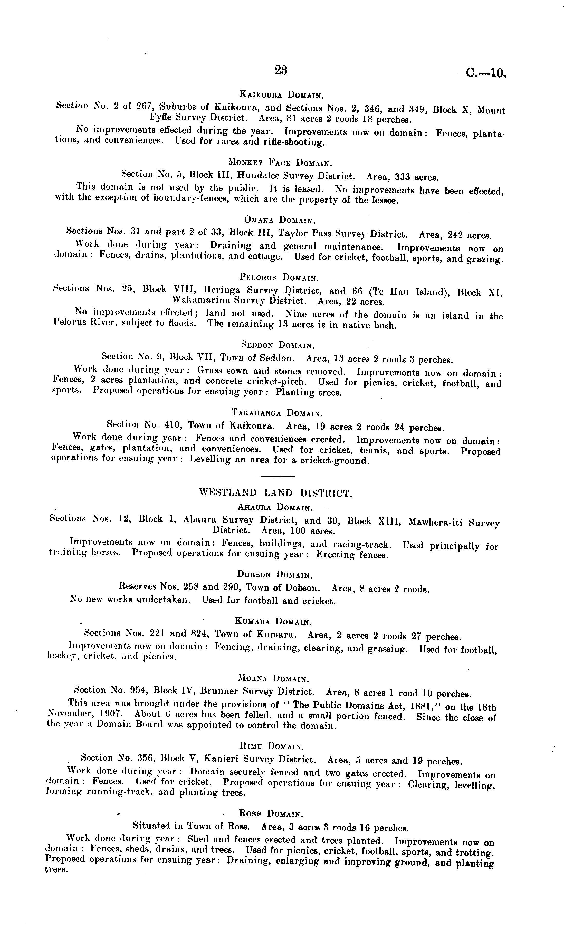 Kaikouha Domain. Section No. 2 of 267, Suburbs of Kaikotira. and Sections Nos. 2, 346, and 349, Block X, Mount Fylfe Survey District. Area, 81 acres 2 roods 18 perches. No improvements effected during the year. Improvements now on domain: Fences, plantations, and conveniences. Used for i aces and ritle-shooting. Monkey Faob Domain. Section No. 5, Block 111, Hundalee Survey District. Area, 333 acres. This domain is not used by the public. It is leased. No improvements have been effected, with the exception of boundary-fences, which are the property of the lessee. Omaka Domain. Sections Nos. 31 and part 2of 33, Block 111, Taylor Pass Survey District. Area, 242 acres. Work done during year: Draining and general maintenance. Improvements now on domain : Fences, drams, plantations, and cottage. Used for cricket, football, sports, and grazing. Pelorus Domain. Sections Nos. 26, Block VIII, Heringa Survey District, and 66 (Te Ilau Island), Block XI, Wakamarina Survey District. Area, 22 acres. No improvements effected; land not used. Nine acres of the domain is an island in the Pelorus River, subject to floods. The remaining 13 acres is in native bush. SkddON Domain. Section No. 9, Block VII, Town of Seddon. Area, 13 acres 2 roods 3 perches. Work done during year: Crass sown and stones removed. Improvements now on domainFences, 2 acres plantation, and concrete cricket-pitch. Used for picnics, cricket, football, and sports. Pi,,posed operations for ensuing year : Planting trees. Takahanga Domain. Section No. 410, Town of Kaikotira. Area, 19 acres 2 roods 24 perches. Work .hme during year: Fences and conveniences erected. Improvements now on domainFences, gates, plantation, ami conveniences. Used for cricket, tennis, and sports. Proposed operations for ensuing year : Levelling an area for a cricket-ground.