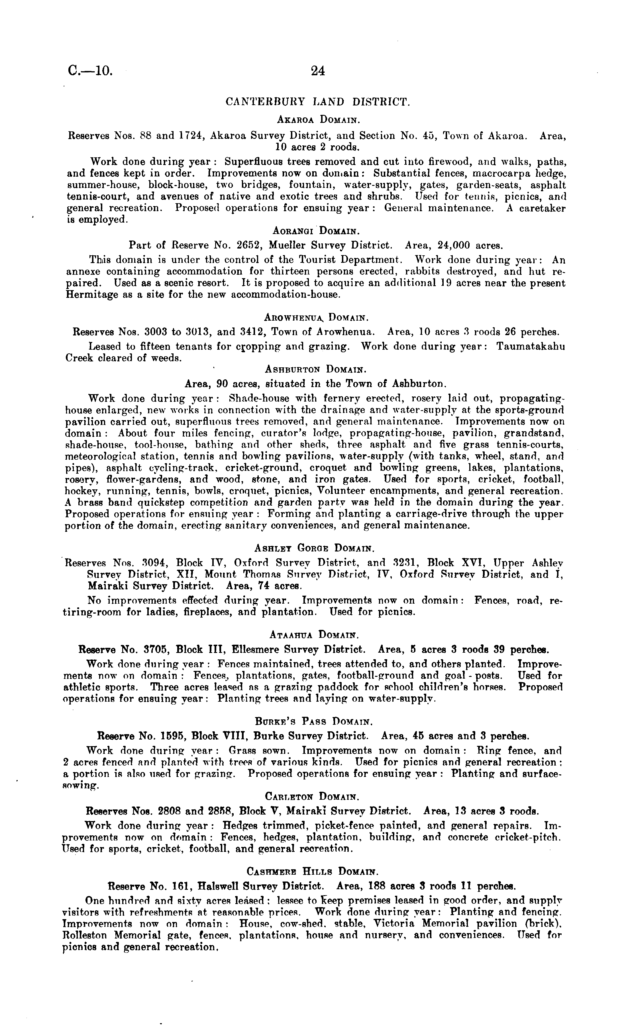 CANTERBURY LAND DISTRICT. Akaroa Domain. Reserves Xos. 88 and 1724, Akaroa Survey District, and Section No. 45, Town of Akaroa. Area, 10 acres 2 roods. Work done during year : Superfluous trees removed and cut into firewood, and walks, paths, and fences kept in order. Improvements now on domain: Substantial fences, macrocarpa hedge, summer-house, block-house, two bridges, fountain, water-supply, gates, garden-seats, asphalt tennis-court, and avenues of native and exotic trees and shrubs. Used for tennis, picnics, and general recreation. Proposed operations for ensuing year: General maintenance. A caretaker is employed. Aorangi Domain. Part of Reserve No. 2652, Mueller Survey District. Area, 24,000 acres. This domain is under the control of the Tourist Department. Work done during year: An annexe containing accommodation for thirteen persons erected, rabbits destroyed, and hut repaired. Used as a scenic resort. It is proposed to acquire an additional 19 acres near the present Hermitage as a site for the new accommodation-house. Arowhenua Domain. Reserves Nos. 3003 to 3013, and 3412, Town of Arowhenua. Area, 10 acres 3 roods 26 perches. Leased to fifteen tenants for cropping and grazing. Work done during year: Taumatakahu Creek cleared of weeds. Ashburton Domain. Area, 90 acres, situated in the Town of Ashburton. Work done during year : Shade-house with fernery erected, rosery laid out, propagatinghouse enlarged, new works in connection with the drainage and water-supply at the sports-ground pavilion carried out, superfluous trees removed, and general maintenance. Improvements now on domain : About four miles fencing, curator's lodge, propagating-house, pavilion, grandstand, shade-house, tool-house, bathing and other sheds, three asphalt and five grass tennis-courts, meteorological station, tennis and bowling pavilions, water-supply (with tanks, wheel, stand, and pipes), asphalt cycling-track, cricket-ground, croquet and bowling greens, lakes, plantations, rosery, flower-gardens, and wood, stone, and iron gates. Used for sports, cricket, football, hockey, running, tennis, bowls, croquet, picnics, Volunteer encampments, and general recreation. A brass band quickstep competition and garden party was held in the domain during the year. Proposed operations for ensuing year : Forming and planting a carriage-drive through the upper portion of the domain, erecting sanitary conveniences, and general maintenance. Ashley Gorge Domain. Reserves Nos. 3094, Block IV, Oxford Survey District, and 3231, Block XVI, Upper Ashley Survey District, XII, Mount Thomas Survey District, TV, Oxford Survey District, and I, Mairaki Survey District. Area, 74 acres. No improvements effected during year. Improvements now on domain : Fences, road, re-tiring-room for ladies, fireplaces, and plantation. Used for picnics. Ataahua Domain. Reserve No. 3705, Block 111, Ellesmere Survey District. Area, 5 acres 3 roods 39 perches. Work done during year : Fences maintained, trees attended to, and others planted. Improvements now on domain : Fences, plantations, gates, football-ground and goal - posts. Used for athletic sports. Three acres leased as a grazing paddock for school children's horses. Proposed operations for ensuing year: Planting trees and laying on water-supply. Burke's Pass Domain. Reserve No. 1595, Block VIII, Burke Survey District. Area, 45 acres and 3 perches. Work done during year : Grass sown. Improvements now on domain : Ring fence, and 2 acres fenced and planted with trees of various kinds. Used for picnics and general recreation : a portion is also used for grazing. Proposed operations for ensuing year : Planting and surfacesowing. Cart.eton Domain. Reserves Nos. 2808 and 2858, Block V, Mairaki Survey District. Area, 13 acres 3 roods. Work done during year : Hedges trimmed, picket-fence painted, and general repairs. Improvements now on domain : Fences, hedges, plantation, building, and concrete cricket-pitch. Used for sports, cricket, football, and general recreation. Cashmere Hills Domain. Reserve No. 161, Halswell Survey District. Area, 188 acres 3 roods 11 perches. One hundred and sixty acres leased : lessee to keep premises leased in good order, and supply visitors with refreshments at reasonable prices. Work done during year: Planting and fencing. Improvements now on domain : House, cow-shed, "stable, Victoria Memorial pavilion (brick). Rolleston Memorial gate, fences, plantations, house and nursery, and conveniences. Used for picnics and general recreation.