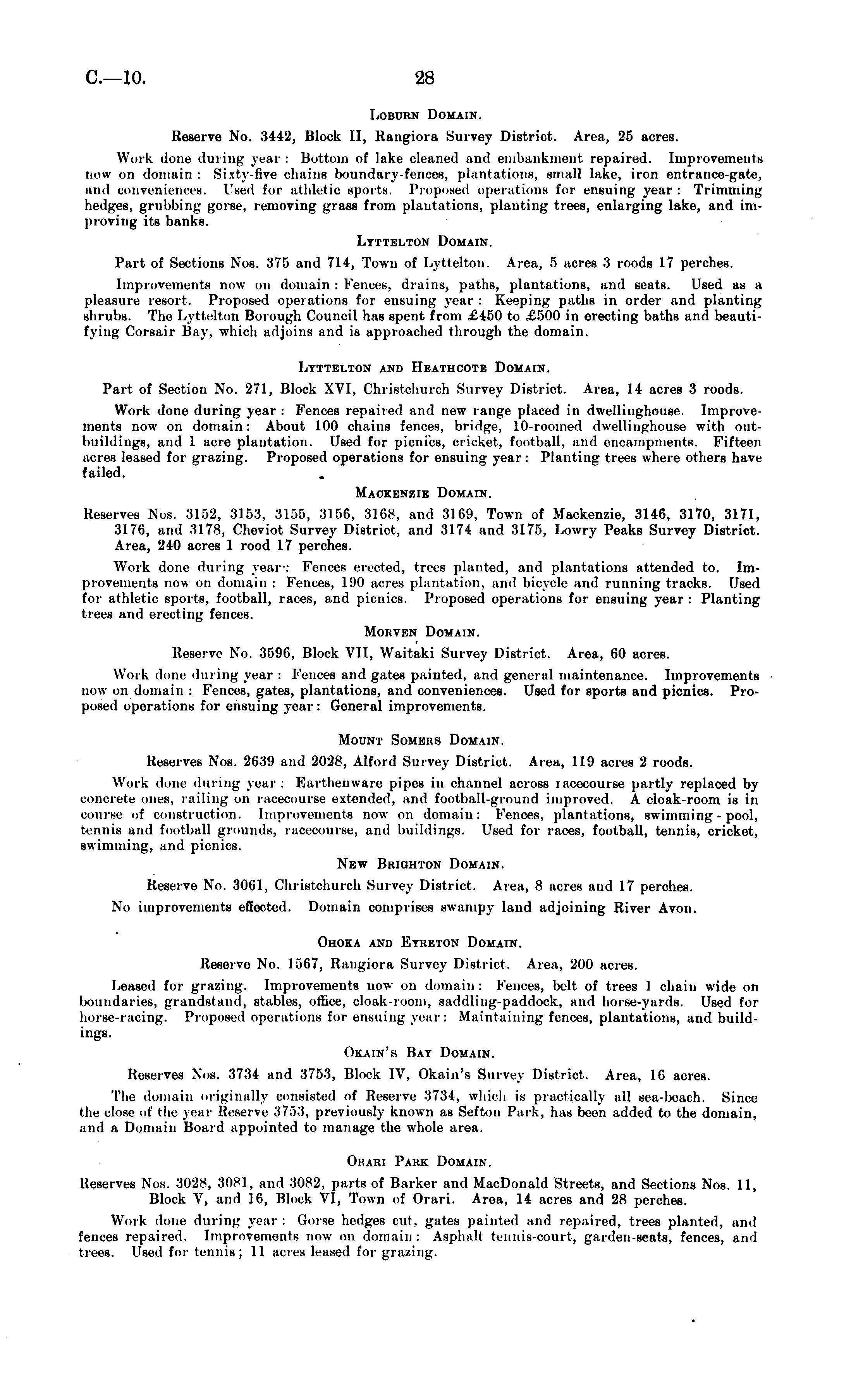 Loburn Domain. Reserve No. 3442, Block 11, Rangiora Survey District. Area, 25 acres. Work done during year : Bottom of lake cleaned and embankment repaired. Improvements now on domain: Sixty-live chains boundary-fences, plantations, small lake, iron entrance-gate, and conveniences. I'sed for athletic sports. Proposed operations for ensuing year: Trimming hedges, grubbing gorse, removing grass from plantations, planting trees, enlarging lake, and improving its banks. Lyttelton Domain. Part of Sections Nos. 375 and 714, Town of Lyttelton. Area, 5 acres 3 roods 17 perches. Improvements now on domain : Fences, drains, paths, plantations, and seats. Used as a pleasure resort. Proposed operations for ensuing year: Keeping paths in order and planting shrubs. The Lyttelton Borough Council has spent from £450 to £500 in erecting baths and beautifying Corsair Bay, which adjoins and is approached through the domain. Lyttelton and Heathcote Domain. Part of Section No. 271, Block XVI, Christchurch Survey District. Area, 14 acres 3 roods. Work done during year : Fences repaired and new range placed in dwellinghouse. Improvements now on domain: About 100 chains fences, bridge, 10-roomed dwellinghouse with outbuildings, and 1 acre plantation. Used for picnics, cricket, football, and encampments. Fifteen acres leased for grazing. Proposed operations for ensuing year: Planting trees where others have failed. Mackenzie Domain. Reserves Nos. 3152, 3153, 3165, 3156, 3168, and 3169, Town of Mackenzie, 3146, 3170, 3171, 3176, and 3178, Cheviot Survey District, and 3174 and 3175, Lowry Peaks Survey District. Area, 240 acres 1 rood 17 perches. Work done during year: Fences erected, trees planted, and plantations attended to. Improvements now on domain : Fences, 190 acres plantation, and bicycle and running tracks. Used for athletic sports, football, races, and picnics. Proposed operations for ensuing year : Planting trees and erecting fences. Morven Domain. Reserve No. 3596, Block VII, Waitaki Survey District. Area, 60 acres. Work done during year : Fences and gates painted, and general maintenance. Improvements now on domain : Fences, gates, plantations, and conveniences. Used for sports and picnics. Proposed operations for ensuing year: General improvements. Mount Somers Domain. Reserves Nos. 2639 and 2028, Alford Survey District. Area, 119 acres 2 roods. Work done during year : Earthenware pipes in channel across racecourse partly replaced by concrete ones, railing on racecourse extended, and football-ground improved. A cloak-room is in course of construction. Improvements now on domain: Fences, plantations, swimming-pool, tennis and football grounds, racecourse, and buildings. Used for races, football, tennis, cricket, swimming, and picnics. New Brighton Domain. Reserve No. 3061, Christchurch Survey District. Area, 8 acres and 17 perches. No improvements effected. Domain comprises swampy land adjoining River Avon. Ohoka and Eyreton Domain. Reserve No. 1567, Rangiora Survey District. Area, 200 acres. Leased for grazing. Improvements now on domain: Fences, belt of trees 1 chain wide on boundaries, grandsland, stables, office, cloak-room, saddling-paddock, and horse-yards. Used for horse-racing. Proposed operations for ensuing year: Maintaining fences, plantations, and buildings. Chain's Bay Domain. Reserves Nos. 3734 and 3753, Block IV, Okain's Survey District. Area, 16 acres. The domain originally consisted of Reserve 3734, which is practically all sea-beach. Since the close of the year Reserve 3753, previously known as Sefton Park, has been added to the domain, and a Domain Board appointed to manage the whole area. Ohari Park Domain. Reserves Nos. 3098, 3081, and 3082, parts of Barker and MaeDnnald Streets, and Sections Nos. 11, Block V, and 16, Block VI, Town of Orari. Area, 14 acres and 28 perches. Work done during year: Gone hedges cut. gates painted and repaired, trees planted, and fences repaired. Improvements now on domain : Asphalt tennis-court, garden-seats, fences, and trees. Used for tennis; 11 acres leased for grazing.
