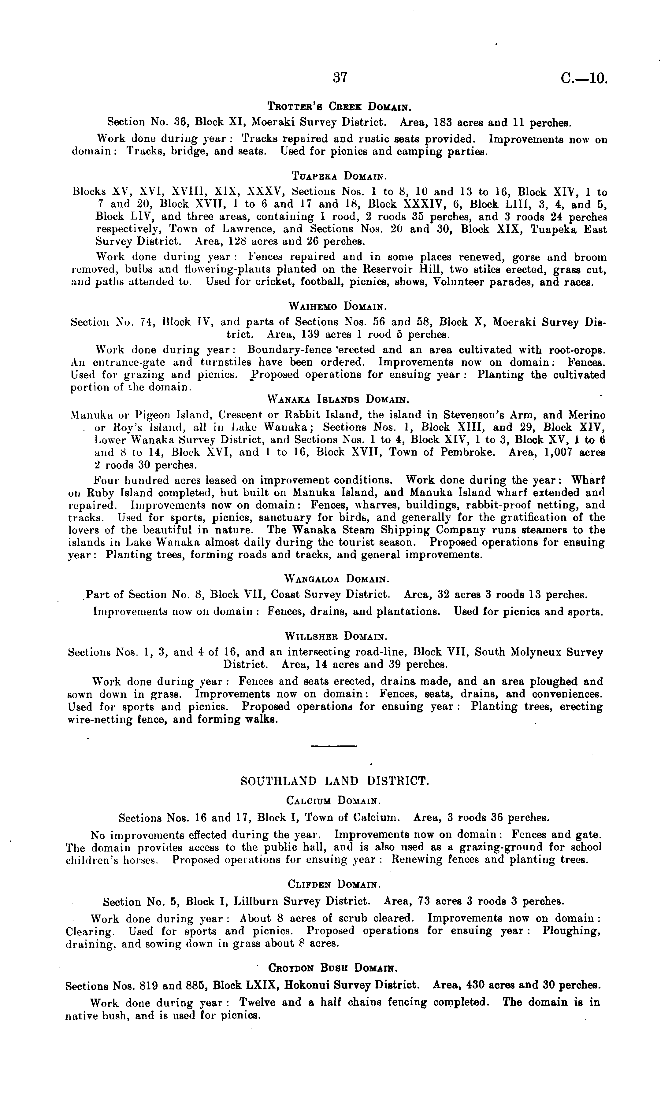 Trotter's Creek Domain. Section No. 36, Block XI, Moeraki Survey District. Area, 183 acres and 11 perches. Work done during year : Tracks repaired and rustic seats provided. Improvements now on domain: Tracks, bridge, and seats. Used for picnics and camping parties. Tuapeka Domain. Blocks XV, XVI, XVIII, XIX, XXXV, Sections Nos. 1 to 8, 10 and 13 to 16, Block XIV, 1 to 7 and 20, Block XVII, 1 to 6 and 17 and 18, Block XXXIV, 6, Block LIII, 3, 4, and 5, Block LIV, and three areas, containing 1 rood, 2 roods 35 perches, and 3 roods 24 perches respectively, Town of Lawrence, and Sections Nos. 20 and 30, Block XIX, Tuapeka East Survey District. Area, 128 acres and 26 perches. Work done during year : Fences repaired and in some places renewed, gorse and broom removed, bulbs and flowering-plants planted on the Reservoir Hill, two stiles erected, grass cut, and paths attended to. Used for cricket, football, picnics, shows, Volunteer parades, and races. Waihemo Domain. Section No. 74, Block IV, and parts of Sections Nos. 56 and 58, Block X, Moeraki Survey District. Area, 139 acres 1 rood 5 perches. Work done during year: Boundary-fence "erected and an area cultivated with root-crops. An entrance-gate and turnstiles have been ordered. Improvements now on domain: Fences. Used for grazing and picnics. Proposed operations for ensuing year : Planting the cultivated portion of the domain. Wanaka Islands Domain. Manuka or Pigeon Island, Crescent or Rabbit Island, the island in Stevenson's Arm, and Merino or Roy's Island, all in Lake Wanaka; Sections Nos. 1, Block XIII, and 29, Block XIV, Lower Wanaka Survey District, and Sections Nos. 1 to 4, Block XIV, 1 to 3, Block XV, 1 to 6 and 8 to 14, Block XVI, and 1 to 16, Block XVII, Town of Pembroke. Area, 1,007 acres 2 roods 30 perches. Four hundred acres leased on improvement conditions. Work done during the year: Wharf on Ruby Island completed, hut built on Manuka Island, and Manuka Island wharf extended and repaired. Improvements now on domain: Fences, wharves, buildings, rabbit-proof netting, and tracks. Used for sports, picnics, sanctuary for birds, and generally for the gratification of the lovers of the beautiful in nature. The Wanaka Steam Shipping Company runs steamers to the islands in Lake Wanaka almost daily during the tourist season. Proposed operations for ensuing year: Planting trees, forming roads and tracks, and general improvements. Wangaloa Domain. Part of Section No. 8, Block VII, Coast Survey District. Area, 32 acres 3 roods 13 perches. Improvements now on domain : Fences, drains, and plantations. Used for picnics and sports. Willsher Domain. Sections Nos. 1, 3, and 4 of 16, and an intersecting road-line, Block VII, South Molyneux Survey District. Area, 14 acres and 39 perches. Work done during year : Fences and seats erected, drains made, and an area ploughed and sown down in grass. Improvements now on domain: Fences, seats, drains, and conveniences. Used for sports and picnics. Proposed operations for ensuing year : Planting trees, erecting wire-netting fence, and forming walks.