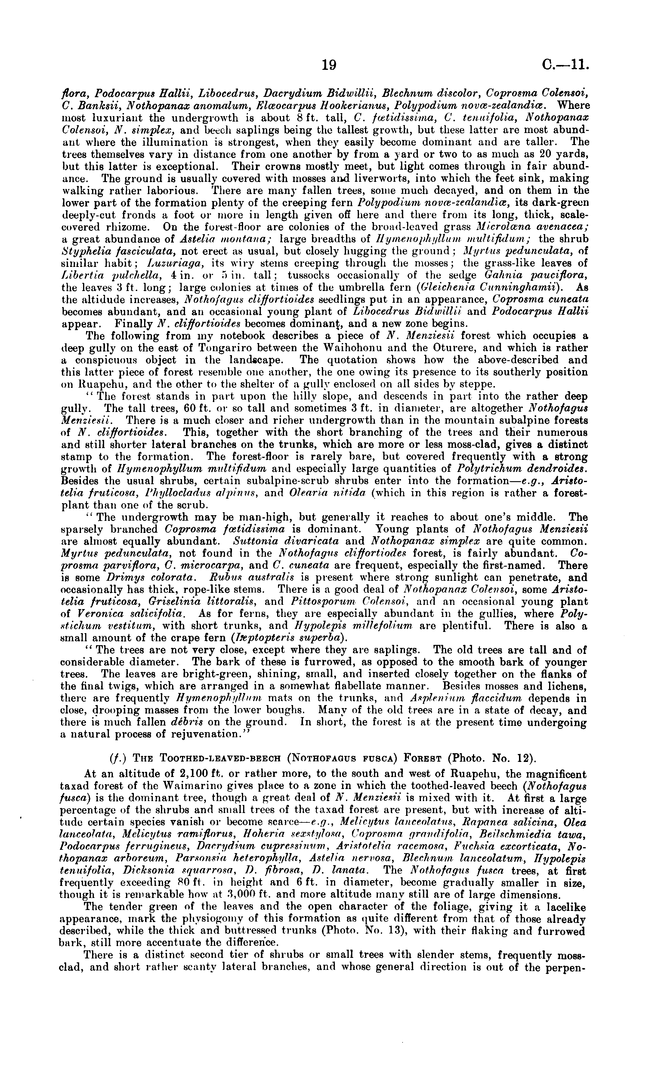 flora, Podocarpus Hallii, Libocedrus, Dacrydium Bidwillii, Blechnum discolor, Coprosina Colensoi, C. Banksii, Nothopanax anomalum, Elceocarpus Hoolterianus, Polypodium novce-zealandice. Where most luxuriant the undergrowth is about 8 ft. tall, C. ftetidissima, C. tin id folia, Nothopanax Colensoi, N. simplex, and beech saplings being the tallest growth, but these latter are most abundant where the illumination is strongest, when they easily become dominant and are taller. The trees themselves vary in distance from one another by from a yard or two to as much as 20 yards, but this latter is exceptional. Their crowns mostly meet, but light conies through in fair abundance. The ground is usually covered witli mosses and liverworts, into which the feet sink, making walking rather laborious. There are many fallen trees, some much decayed, and on them in the lower part of the formation plenty of the creeping fern Polypodium novce-zealandice, its dark-greun deeply-out fronds a foot or more in length given off here and there from its long, thick, scalecovered rhizome. On the forest-floor are colonies of the broad-leaved grass Microlcena avenacea; a great abundance of Astelia montana; large breadths of Hymenophyllum mull i fill inn ; the shrub Styphelia fasciculata, not erect as usual, but closely hugging the ground ; Myrtus pedunculata, of similar habit; Luiv/riaga, its wiry stems creeping through the mosses; the grass-like leaves of Libertia puh-liella, 4 in. or ."tin. tall; tussocks occasionally of the sedge Gahnia piniri flora, the leaves 3 ft. long; large colonies at times of the umbrella fern (Gleichenia Cunningham/it). As the altidude increases, Nothofagiu cliffortioidet seedlings put in an appearance, Coprosina cuneata becomes abundant, and an occasional young plant of Libocedrus Bidwillii and I'oi/ocarpus Hallii appear. Finally N. cliffortioides becomes dominant, and a new zone begins. The following from my notebook describes a piece of N'. Menziesii forest which occupies a deep gully on the east of Tongariro between the Waihohonu and the Oturere, and which is rather a conspicuous object in the landscape. The quotation shows how the above-described and this latter piece of forest resemble one another, the one owing its presence to its southerly position on Ruapehu, and the other to the shelter of a gully enclosed on all sides by steppe. " The forest stands in part upon the hilly slope, and descends in part into the rather deep gully. The tall trees, 60 ft. or so tall and sometimes 3 ft. in diameter, are altogether Nothofagus Menziesii. There is a much oloser and richer undergrowth than in the mountain subalpine forests of N. cliffortioides. This, together with the short branching of the tires and their numerous and still shorter lateral branches on the trunks, which are more or less moss-clad, gives a distinct stamp to the formation. The forest-floor is rarely bare, but covered frequently with a strong growth of HymenophyUum multifidum and especially large quantities of Polytrichum dtndroides. Besides the usual shrubs, certain subalpine-scrub shrubs enter into the formation— e.g., Aristotilin fruticota, PhyUocladus alpinus, and Olearia mtida (which in this region is rather a forestplant than one of the scrub. " The undergrowth may be man-high, but generally it reaches to about one's middle. The sparsely branched Coprosma fatidissima is dominant. Young plants of Nothofagus Menziesii are almost equally abundant. Suttonia divaricate and Nothopanax simplex are quite common. Myrtus pedunculata, not found in the Nothofagus cliffortiodes forest, is fairly abundant. Coprosma parviflora, C. microcarpa, and C. cuneata are frequent, especially the first-named. There is some Drimys colorata. Hub us austral is is present where strong sunlight can penetrate, and occasionally has thick, rope-like stems. There is a good deal of Nothopanax Colensoi, some Aristotelia fruticosa, Griselinia littoralis, and Pittosporum Colensoi, and an occasional young plant of Veronica salicifolia. As for ferns, they are especially abundant in the gullies, where Polygtichum vestitum, with short trunks, and Hypolepis millefolium are plentiful. There is also a small amount of the crape fern (freptopteris superba). "The trees are not very close, except where they are saplings. The old trees are tall and of considerable diameter. The bark of these is furrowed, as opposed to the smooth bark of younger trees. The leaves are bright-green, shining, small, and inserted closely together on the flanks of the final twigs, which are arranged in a somewhat flabellate manner. Besides mosses and lichens, there are frequently HymenophyUum mats on the trunks, and Asplenium flaccidum depends in close, drooping masses from the lower boughs. Many of the old trees are in a state of decay, and there is much fallen debris on the ground. In short, the forest is at the present time undergoing a natural process of rejuvenation." (/.) The Toothed-leaved-beech (Nothofagus pusca) Forest (Photo. No. 12). At an altitude of 2,100 ft. or rather more, to the south and west of Ruapehu, the magnificent taxad forest of the Waimarino gives place to a zone in which the toothed-leaved beech (Nothofagus fvxca) is the dominant tree, though a great deal of N. Menziesii is mixed with it. At first a large percentage of the shrubs and small trees of the taxad forest are present, but with increase of altitude certain species vanish or become scarce — e.g., Melieytus lanceolatus, Rapanea salicina, Olea lanceolata, Melieytus ramiflorus, Boheria sexstylosa, Coprosina grandifolia, Beilschmiedia tawa, I'ndararpux ftmuji'neiix, Dacrydiiirn eupressinum, Aristotclia raccmosa, Fuchsia excorticata, Nothopanax arboreum, Parsonsia heterophytta, Astelia nervosa, lilt rim urn lanceolatum, Hypolepis tenuifolia, Dieksonia tquarrosa, I), fibrosa, I), lanata. The Nothofagus fusea trees, at first frequently exceeding 80 ft. in height and 6 ft. in diameter, become gradually smaller in s