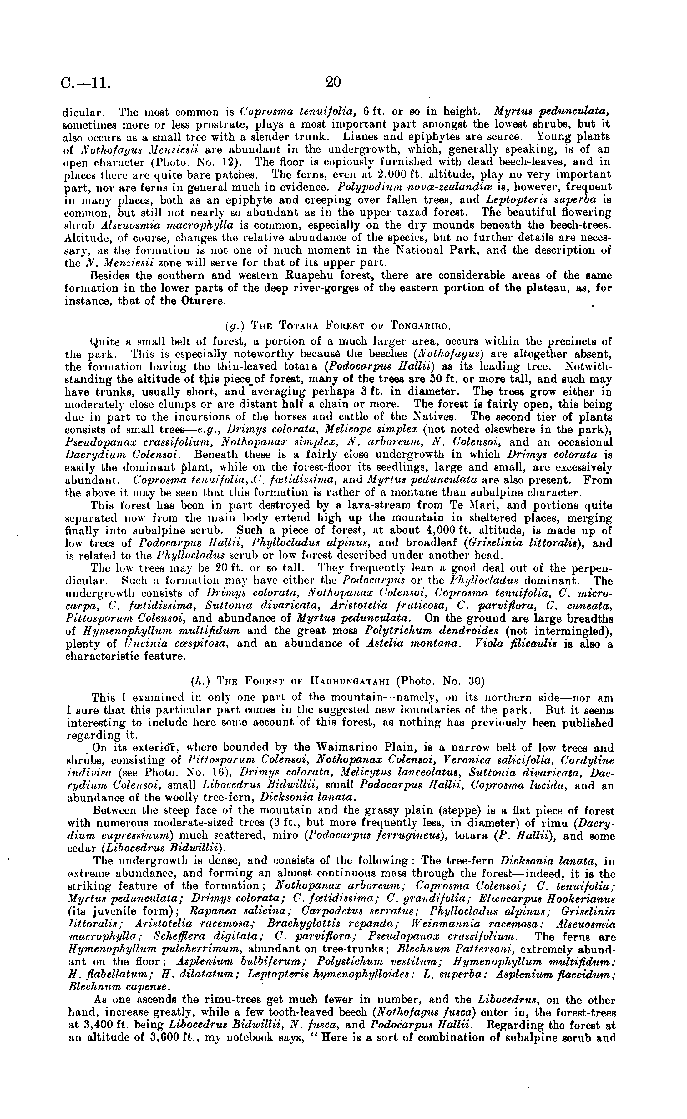 dicular. The most common is Coprosma tenuifolia, 6 ft. or so in height. Myrtus pedunculata, sometimes more or less prostrate, plays a most important part amongst the lowest shrubs, but it also occurs as a .small tree with a slender trunk. Lianes and epiphytes are scarce. Young plants of Not ho fay us Menziesii arc abundant in the undergrowth, which, generally speaking, is of an open character (Photo. No. 12). The floor is copiously furnished with dead beecb-leaves, and in places there are quite bare patches. The ferns, even at 2,000ft. altitude, play no very important part, nor are ferns in general much in evidence. Polypodiuin nova-zcalandict is, however, frequent in many places, both as an epiphyte and creeping over fallen trees, and Lepto pterin superba is common, but still not nearly so abundant as in the upper taxad forest. The beautiful flowering shrub Alseuosmia macrophylla is common, especially on the dry mounds beneath the beech-trees. Altitude, of course, changes the relative abundance of the species, but no further details are necessary, as the formation is not one of much moment in the National Park, and the description of the N. Menzietii zone will serve for that of its upper part. Besides the southern and western Ruapehu forest, there are considerable areas of the same formation in the lower parts of the deep river-gorges of the eastern portion of the plateau, as, for instance, that of the Oturere. (g.) The Totara Forest of Tongariro. Quite a small belt of forest, a portion of a much larger area, occurs within the precincts of the park. This is especially noteworthy because the beeches (Nothofagus) are altogether absent, the formation having the thin-leaved totaia (Podocarpus Hallii) as its leading tree. Notwithstanding the altitude of this forest, many of the trees are 50 ft. or more tall, and such may have trunks, usually short, and averaging perhaps 3 ft. in diameter. The trees grow either in moderately close clumps or are distant half a chain or more. The forest is fairly open, this being due in part to the incursions of the horses and cattle of the Natives. The second tier of plants consists of small trees — e.g., /Jrimys colorata, Melicope simplex (not noted elsewhere in the park), Pseudopanax erassifolium, Nothopanax simplex, N. arboreum, N. Colensoi, and an occasional Dacrydium Colensoi. Beneath these is a fairly close undergrowth in which Drimys colorata is easily the dominant plant, while on the forest-floor its seedlings, large and small, are excessively abundant. Coprosma tenuifolia,,C. fcetidissima, and Myrtus pedunculata are also present. From the above it may be seen that this formation is rather of a montane than subalpine character. This forest has been in part destroyed by a lava-stream from Te Mari, and portions quite separated now from the main body extend high up the mountain in sheltered places, merging finally into subalpine scrub. Such a piece of forest, at about 4,000 ft. altitude, is made up of low trees of Podocarpus Hallii, Phyllocladus alpinus, and broadleaf (Grisdinia littoralis), and is related to the Phyllocladus scrub or low forest described under another head. The low trees may be 20 ft. or so tall. They frequently lean a good deal out of the perpendicular. Such a formation may have either the Podocarput or the Phyllocladiii dominant. The undergrowth consists of Drimys colorata, Nothopanax Colensoi, Coprosma tenuifolia, C. microcarpa, C. fcetidisnima, Suttonia divaricata, Aristotelia fniticosa, C. parviflora, C. cuneata, Pittoiporum Colensoi, and abundance of Myrtus pedunculata. On the ground are large breadths of // ymenophyllum multifidum and the great moss Polytrichum dendroides (not intermingled), plenty of Uncinia caspitosa, and an abundance of Astelia montana. Viola filicaidis is also a characteristic feature. (h.) The Foiikst ov Hadhunoatahi (Photo. No. 30). This I examined in only one part of the mountain—-namely, on its northern side—nor am I sure that this particular part comes in the suggested new boundaries of the park. But it seems interesting to include here some account of this forest, as nothing has previously been published regarding it. On its exterioT, where bounded by the Waimarino Plain, is a narrow belt of low trees and shrubs, consisting of Pittosporum ('olensoi, Nothopanax Colensoi, Veronica salicifolia, Cordyline ii/r/icixa (see I'hoto. No. 16), /Jrnin/s colorata, Melicytus lanceolatut, Suttonia divaricata, Dacrydium Colensoi, small Libocedrus Bidwillii, small Podocarpus Hallii, Coprosma lucida, and an abundance of the woolly tree-fern, Dicksonia lanata. Between the steep face of the mountain and the grassy plain (steppe) is a flat piece of forest with numerous moderate-sized trees (3 ft., but more frequently less, in diameter) of rimu (Dacrydium cupressinum) much scattered, miro (Podocarpus ferrugineus), totara (P. Hallii), and some cedar (Libocedrus Bidwillii). The undergrowth is dense, and consists of the following : The tree-fern Dicksonia lanata, in extreme abundance, and forming an almost continuous mass through the forest —indeed, it is the striking feature of the formation; Nothopanax arboreum; Coprosma Colensoi; C. tenuifolia; Myrtus pedunculata; Drimys colorata; C. fcetidissima; C. grandifolia ; Elceocarpus Hookerianus (its juvenile form); Bapanea salicina; Carpodetus serratus; Phyllocladus alpinus; Griselinia littoralis; Aristotelia racemosa-; Brachyglottis repanda; Weinmannia racemosa; Alseuosmia macrophylla; Schefflera dif/itata: C. parviflora; Pseudopanax erassifolium. The ferns are II ymenophyllum pulcherrimum, abundant on tree-trunks; Blechnum Pattersoni, extremely abundant on the floor; Asplenium bulbiferum; Polystichum vestitum; Hymenophyllum multifidum; H, flabellatwn; H. dilatatum,; Leptopteris hymen ophylloi ties: L. superba; Asplenium flaccidum; Blechnum capense. As one ascends the rimu-trees get much fewer in number, and the Libocedrus, on the other hand, increase greatly, while a few 