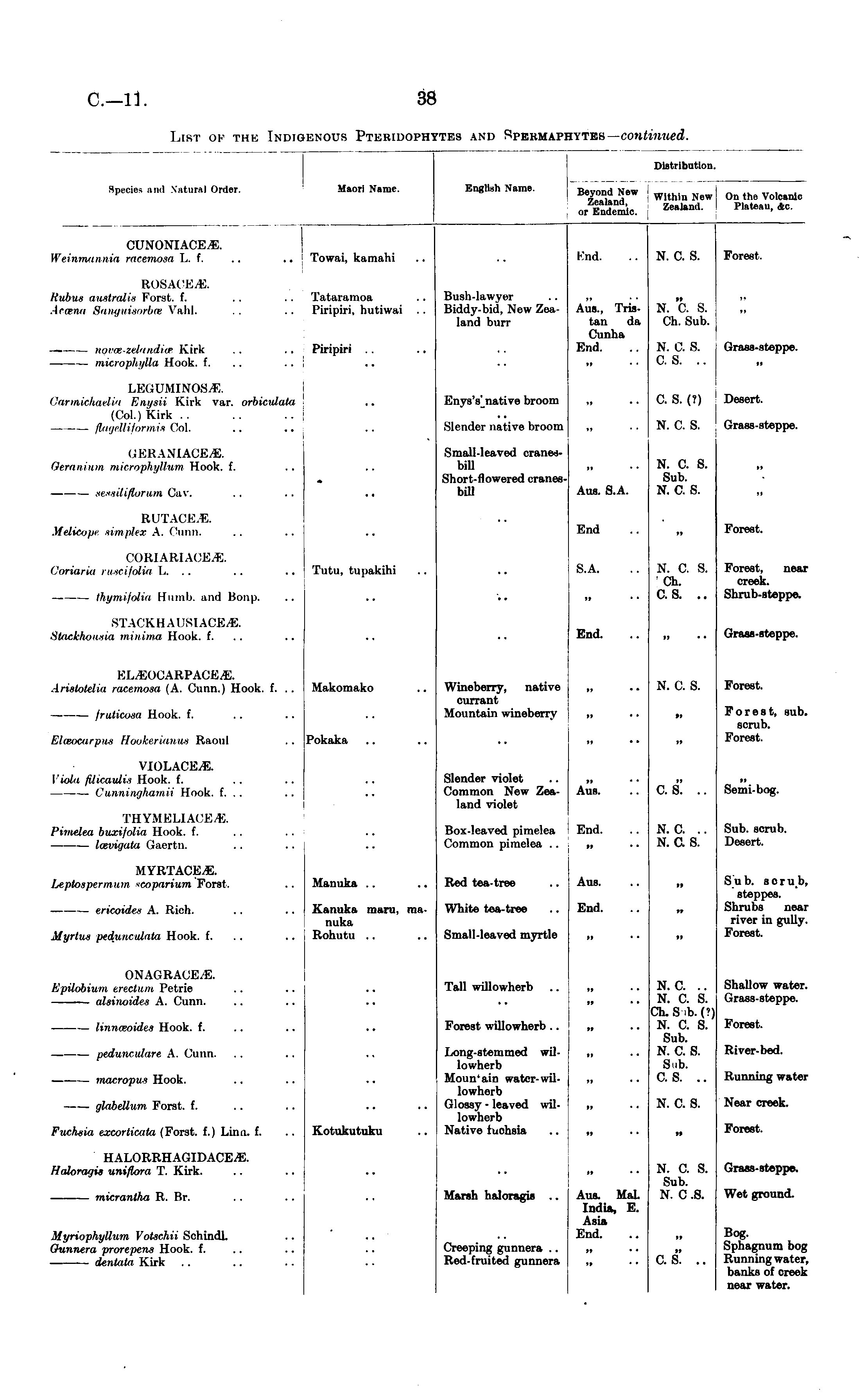 ion. sprcir- an,I Nat,u,i Order. .Maori Nana'. English Value. Beyond New Zealand, or Endemic. Within New | On the Volcanic Zealand. Plateau, 4c. CUNONIACE.E. Weinmunnia racemosa L. f. .. .. Towai, kamahi Knd. N. C. S. Forest. ROSACEA Rub as austraiis Font f. .. .. Tataramoa Aeii-na Banguieorba Vahl. .. Piripiri, hutiwai Bush-lawyer Biddy-bid, Xew Zealand burr Aus., Tristan da Cunha End. N. C. 8. Ch. Sub. j norie-zeliuriia- Ixirk .. .. Piripiri niierophijlla Hook. f. .. N. C. S. c. s. Grass-steppe. »» LEGUMTNOS^;. t'arimcliailin Eni/sii Kirk var. orbiculata (Col.) Kirk .. flagdliformis Col. EnysV native broom C. S. (?) Desert. Slender native broom N. C. S. Grass-steppe. GKKAXIACK/E. Geranium mieropht///lint Hook. f. Small-leaved cranesbill Short-flowered cranesbill N. C. S. Sub. N. C. S. sissili/loritm Ca\. Aus. S.A. Rb'TACK B. Mdicopi simplex A. Cunn. End Forest. CORIARIACK.K. Coriaria ruscifdia L .. .. .. Tutu, tupakihi S.A. N. C. S. Ch. C. S. Forest, near creek. Shrub-steppe. Ihymifo/ia Hiimb. and Bonp. »» • • STACKHA1 siack.K. Stachhoueia minima Hook, f. .. End. Grass-steppe. KL.-EOGARPACE.iE. Aristotdia racemosa (A. Cunn.) Hook. f. .. Makomako Wineberry, native currant Mountain wineberry »» • • N. C. S. Forest. — fruticosa Hook. f. Eloocarpus Hookeriamu Raoul .. Pokaka H Forest, sub. scrub. Forest. H VIOLACE.-E. Viola filicauli i Hook. f. Cmininiihumii Hook. f. . . Slender violet Common New Zealand violet »» • * Aus. C. S. Semi-bog. THYMEIIACEiB. /'limit a h,t ri/'ih'o Hook. f. laevigata Gaertn. Box-leaved pimelea Common pimelea .. End. N. C. .. N. C. S. Sub. scrub. Desert. », ■ • MYRTACE.E. Lephspermiun teoparium Font .. Manuka .. ericoides A. Rich. .. .. Kanuka tnaru. manuka Myrlus pcdunculata Hook. f. .. .. Rohutu .. Red tea-tree White tea-tree Aus. End. n »» Sub. scrub, steppes. Shrubs near river in gully. Forest. Small-leaved myrtle tt ONAGRACE^E. Epilohiuin trcctiuu Petrie alsinoides A. Cunn. Tall willowherb N. C. .. N. C. S. Ch. S,b.(?) N. C. S. Sub. N. C. 8. Sub. C. s. .. Shallow water. Grass-steppe. ,» •. linnceoides Hook. f. Forest willowherb .. ,, • • Forest. peduncidare A. Cunn. Long-stemmed willowherb Moun'ain water-wil- | lowherb Glossy - leaved willowherb Native fuchsia River-bed. macropus Hook. »» *. Running water glabdlum Forst. f. N. C. S. Near creek. Fuchsia excorlicala (Forst. f.) Linn. f. .. Kotukutuku ■ • Forest. HALORRHAGIDACE.E. Haloragis unifhra T. Kirk. N. C. S. Sub. N. C .S. Grass-steppe. micrantha R. Br. Marsh haloragis .. Aus. Mai. India, E. Asia End. Wet ground. Mynopht/llum Votschii SchindL Gunnera prorepens Hook, f. .. denUita Kirk Creeping gunnera .. Red-fruited gunnera >» • • »» c. s" Bog. Sphagnum bog Running water, banks of creek near water. »• • *