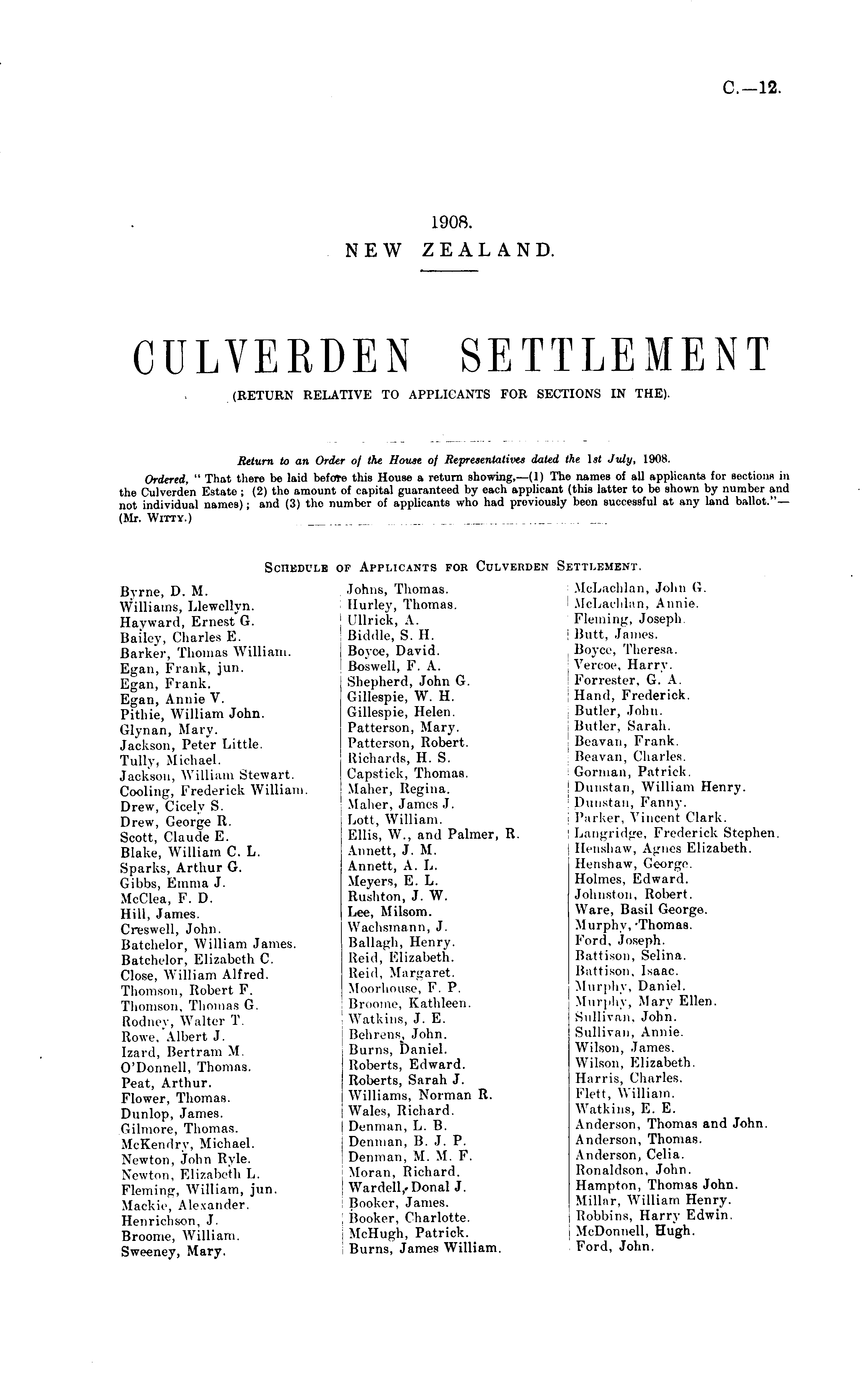 Return to an Order of the House of Representatives dated the Ist July, 1908. Ordered, " That there be laid before this House a return showing,—(l) The names of all applicants for sections in the Culverden Estate ; (2) the amount of capital guaranteed by each applicant (this latter to be shown by number and not individual names); and (3) the number of applicants who had previously been successful at any land ballot."— (Mr. Witty.)