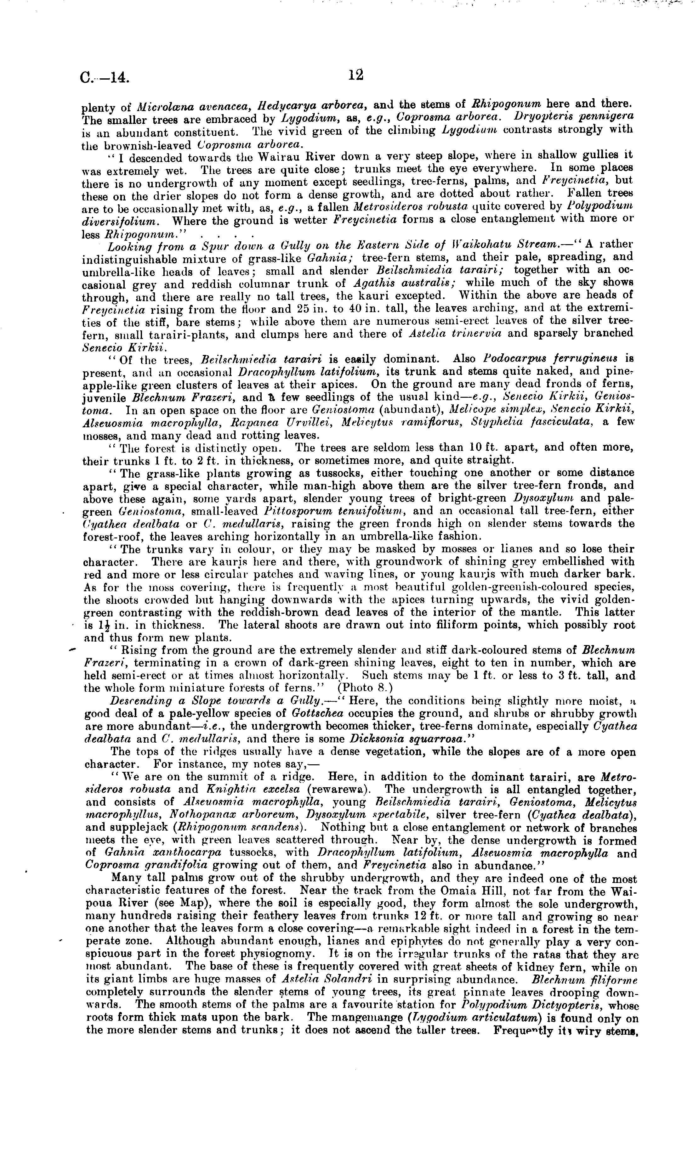 plenty of Microkena avenacea, Hcdycarya arborea, and the stems of Rhipogonum here and there. The smaller trees are embraced by Lygodium, as, e.g., Coprosma arborea. Dryopieris pennigera is an abundant constituent. The vivid green of the climbing Lygodium contrasts strongly with the brownish-leaved Coprosma arborea. " 1 descended towards the Wairau River down a very steep slope, where in shallow gullies it was extremely wet. The trees are quite close; trunks meet the eye everywhere. In some places there is no undergrowth of any moment except seedlings, tree-ferns, palms, and Freycinetia, but these on the drier slopes do not form a dense growth, and arc dotted about rather. Fallen trees are to be occasionally met with, as, e.g., a fallen Metrosideros robusta quite covered by Polypodium diversifolium. Where the ground is wetter Freycinetia forms a close entanglement with more or less Rhipogonum." .... Looking from a Spur down a Cully on the Eastern Side of Waikohatu Stream. —"A rather indistinguishable mixture of grass-like Gahnia; tree-fern stems, and their pale, spreading, and umbrella-like heads of leaves; small and slender Beilschmiedia tarairi; together with an occasional grey and reddish columnar trunk of Agathis australis; xvhile much of the sky shows through, and there are really no tall trees, the kauri excepted. Within the above are heads of Freycinetia rising from the floor and 25 in. to 40 in. tall, the leaves arching, and at the extremities of the stiff, bare stems: while above them are numerous semi-erect leaves of the silver treefern, small tarairi-plants, and clumps here and there of Astelia trinervia and sparsely branched Si necio Kirkii. "Of the trees, Beilschmiedia tarairi is easily dominant. Also Podocarpus ferrUgineus is present, and an occasional DracophyUum latifolium, its trunk and stems quite naked, and apple-like green clusters of leaves at their apices. On the ground are many dead fronds of ferns, juvenile Blechnum Frazeri, and a few seedlings of the usual kind — e.g., Senecio Kirkii, Geniostoma. In an open space on the floor are Geniostoma (abundant), Melicope simplex, Senecio Kirkii, Alseuosmia macrophylla, Bapanea Urvillei, Melicytus ramiflorus, Styphelia fasciculata. a fexv mosses, and many dead and rotting leaves. " The forest is distinctly open. The trees are seldom less than 10 ft. apart, and often more, their trunks 1 ft. to 2 ft. in thickness, or sometimes more, and quite straight. " The grass like plants growing as tussocks, either touching one another or some distance apart, give a special character, while man-high above them are the silver free-fern fronds, and above these again, some yards apart, slender young trees of bright-green Dysoxylum and palegreen Geniostoma, small-leaved I'iltosporum tenuifolium, and an occasional tall tree-fern, either Cyathea dealbata or C. meduUaris, raising the green fronds high on slender steins towards the forest-roof, the leaves arching horizontally in an umbrella-like fashion. "The trunks vary in colour, or they may be masked by mosses or lianes and so lose their character. There are kauris here and there, xvith groundwork of shining grey embellished with red and more or less circular patches and waving lines, or young kauris with much darker bark. As for the moss covering, there is frequently a most beautiful golden-green ish-coloured species. the shoots crowded but hanging downwards with the apices turning upwards, the vivid goldengreen contrasting with the reddish-brown dead leaves of the interior of the mantle. This latter is H in. in thickness. The lateral shoots are drawn out into filiform points, which possibly root and thus form nexv plants. " Rising from the ground are the extremely slender and stiff dark-coloured stems of Blechnum Frazeri, terminating in a crown of dark-green shining leaves, eight to ten in number, which are held semi-erect or at times almost horizontally. Such stems may be 1 ft. or less to 3ft. tall, and the whole form miniature forests of ferns." (Photo 8.) Descending a Slope towards a Cully. —"Here, the conditions being slightly more moist, a good deal of a pale-yellow species of Gottschea occupies the ground, and shrubs or shrubby' growth are more abundant— i.e., the undergrowth becomes thicker, tree-ferns dominate, especially Cyathea dealbata and C. medullaris, and there is some Dicksonia squarrosa." The tops of the ridges usually have a dense vegetation, while the slopes are of a more open character. For instance, my notes say,— "We are on the summit of a ridge. Here, in addition to the dominant tarairi, are Metrosideros robusta and Knightia excelsa (rewarewa). The undergrowth is all entangled together, and consists of Alseuosmia macrophylla, young Beilschmiedia tarairi, Geniostoma, Melicytus maerophyllus, Nothopanax arboreum. Dysoxylum spectabile, silver tree-fern (Cyathea dealbata), and supplejack (Rhipogonum scandens). Nothing but a close entanglement or network of branches meets the eye. with green leaves scattered through. Near by, the dense undergrowth is formed of Gahnia xanthocarpa tussocks, xvith Dracophyll urn latifolium, Alseuosmia macrophylla and Coprosma grandifolia growing out of them, and Freycinetia also in abundance." Many tall palms grow out of the shrubby undergroxvth, and they arc indeed one of the most characteristic features of the forest. Near the track from Ihe Omaia Hill, not far from the Waipoua diver (see Map), xvhere the soil is especially good, they form almost the sole undergroxvth, many hundreds raising their feathery leaves from trunks 12 ft. or more tall and growing so neatone another that the leaves form a close covering—a remarkable sigh! indeed in a forest in the temperate zone. Although abundant enough, lianes ami epiphytes do not generally play a very conspicuous part in the forest physiognomy. Tt is on the irregular trunks of the ratas that they arc most abundant. The base of these is frequently covered xvith great sheets of kidney fer