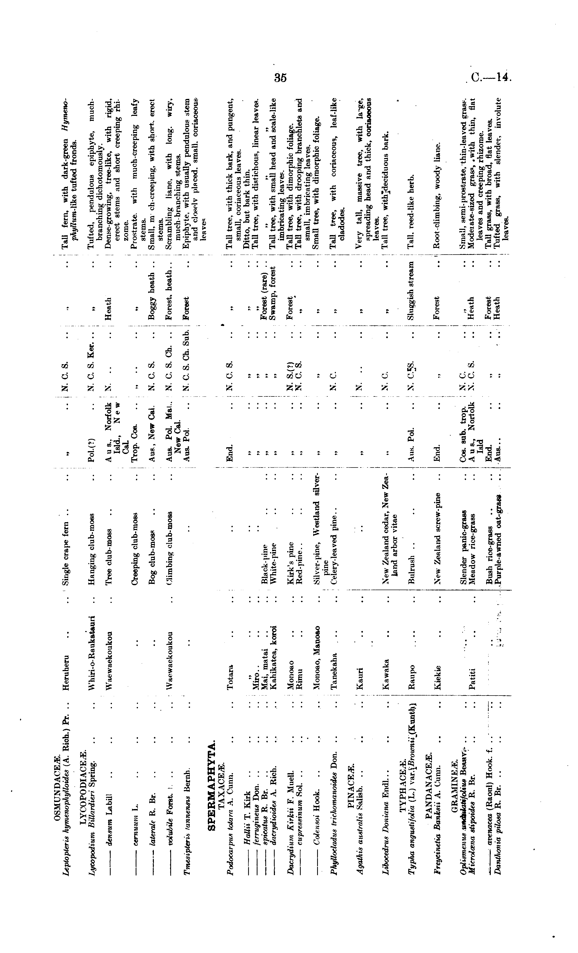 OSMUNDACEiE. Leptopteris hymenopla/lloides (A. Rich.) Pr. .. Hcruheru .. .. Single crape fern .. „ .. N. C. S. .. „ .. Tall fern, with dark-green Ityineiw-plq/llum-like tufted fronds. LYCOPODIACE K. Lycopodium BUlardieri Spring. .. .. Whiri-o-Raukatauri .. Hanging club-moss .. Pol.(?) .. X. C. S. Ker. .. „ .. Tufted, pendulous epiphyte, muchbranching dichotomously. densum Labill .. .. .. Waewaekoukou .. Tree club-moss .. .. Aus., Norfolk X. .. .. Heath .. Dense-growing, tree-like, with rigid. Isld., New erect stems and short creeping rhiCaL zome. cemuum . L. .. .. .. .. Creeping club-moss .. Trop. Cos. „ .. „ .. Prostrate with much-creeping leafy stems. laterale R. Br. .. .. .. Bog club-moss .. .. Aus, Xew Cal. X. C. S. .. Boggy heath .. Small, m ch-creeping, with short, erect stems. volubile Forst. I. .. .. .. i Waewaekoukou .. Climbing club-moss Aus. Pol. Ma!.. X. C. S. Ch. .. j Forest, heath.. Scrambling liane, with long, wiry. New Cal. much-branching stems. Tmesipteris lannensis Bernh. .. .. .. .. Aus. Pol. .. N. C. S. Ch. Sub. Forest .. Epiphyte, with usually pendulous stem and closelv placed, small, coriaceous leaves SPERMAPHYTA. . Podocarpus totara A. Cunn. .. .. Totara .. .. .. End. . . X. C. S. .. „ .. Tall tree, with thick bark, and pungent, small, coriaceous leaves. liallii T. Kirk .. .. .. „ .. .. .. „ .. „ „ •. Ditto, but bark thin. jerrugineus Don. .. .. .. Miro.. .. .. .. ,, .. „ .. „ .. Tall tree, with distichous, linear leaves. spiattus R. Br. .. .. Mai. matai .. .. Black-pine .. .. „ .. „ .. Forest (rare) .. „ „ „ dacrydioides A. Rich. .. .. Kahikatea, koroi .. White-pine .. .. „ .. „ .. Swamp, forest Tall tree, with small head and scale-like imbricating leaves. Dacrydium Kirkii F. Muell. .. .. Monoao .. .. Kirk's pine .. .. „ .. N. S.(?) .. Forest .. Tall tree, with dimorphic foliage. cupressinum Sol. .. .. .. Rimu .. .. Red-pine.. .. .. „ .. N. C. S. .. „ .. Tall tree, with drooping branchlets and small, imbricating leaves. Coleusoi Hook. .. .. .. Monoao, Manoao .. Silver-pine, Westland silver- „ .. „ .. „ .. Small tree, with dimorphic foliage. pine Phyllocladus trichomanoides Don. .. .. Tanekaha .. .. Celery-lea ved pine.. .. ,, .. | N. C. .. ,. .. Tall tree, with coriaceous, leaf-like cladodes. PINACK.K. Agathis australis SaMsb. .. .. .. Kauri .. .. .. „ .. X T . .. „ .. Very tall, massive tree, with la-ge, spreading head and thick, coriaoeous leaves. Liboridius bimiiiiiii F.ndl... .. .. Kawaka .. .. New Zealand cedar, New Zea- „ X. C. .. „ .. Tall tree, with'deciduous bark. land arbor vitae TYPHACE.K. Typhi, angustifolia (L.) var./>'jw«j7_(Kunth) Raupo .. .. Bulrush .. .. .. Aus. Pol. .. N. C.JjS. .. Sluggish stream Tall, reed-like herb. PAXDANACE3E. freycinetia Banksii A. Cunn. .. .. Kiekie .. .. Xew Zealand screw-pine .. End. .. „ .. 1 Forest .. Root-climbing, woody liane. GRAMINE^E. Oplisnieiius vndstlatifolius Beaar* .. .. .. Slender panic-grass .. Cos. sub. trop. X. C. .. , .. Small, semi- prostrate.'thin-leaved grass. Microlcena stipoides R. Br. .. .. Patiti .. .. Meadow rice-grass .. Aus., Norfolk X. C. S. .. Heath .. Modeiate-sized grass, .with thin, flat Isld leaves and creeping rhizome. arenacea (Raoul) Hook. f. -.-. . . .. Bush rice-grass .. .. End. .. „ .. Forest .. Tall grass, with broad, flat leaves. Damthonia pilostt R. Br. .. .. .. ... Purplc-awned oat-grass .. Aus... .. ., .. Heath .. Tufted grass, with slender, involute leaves.