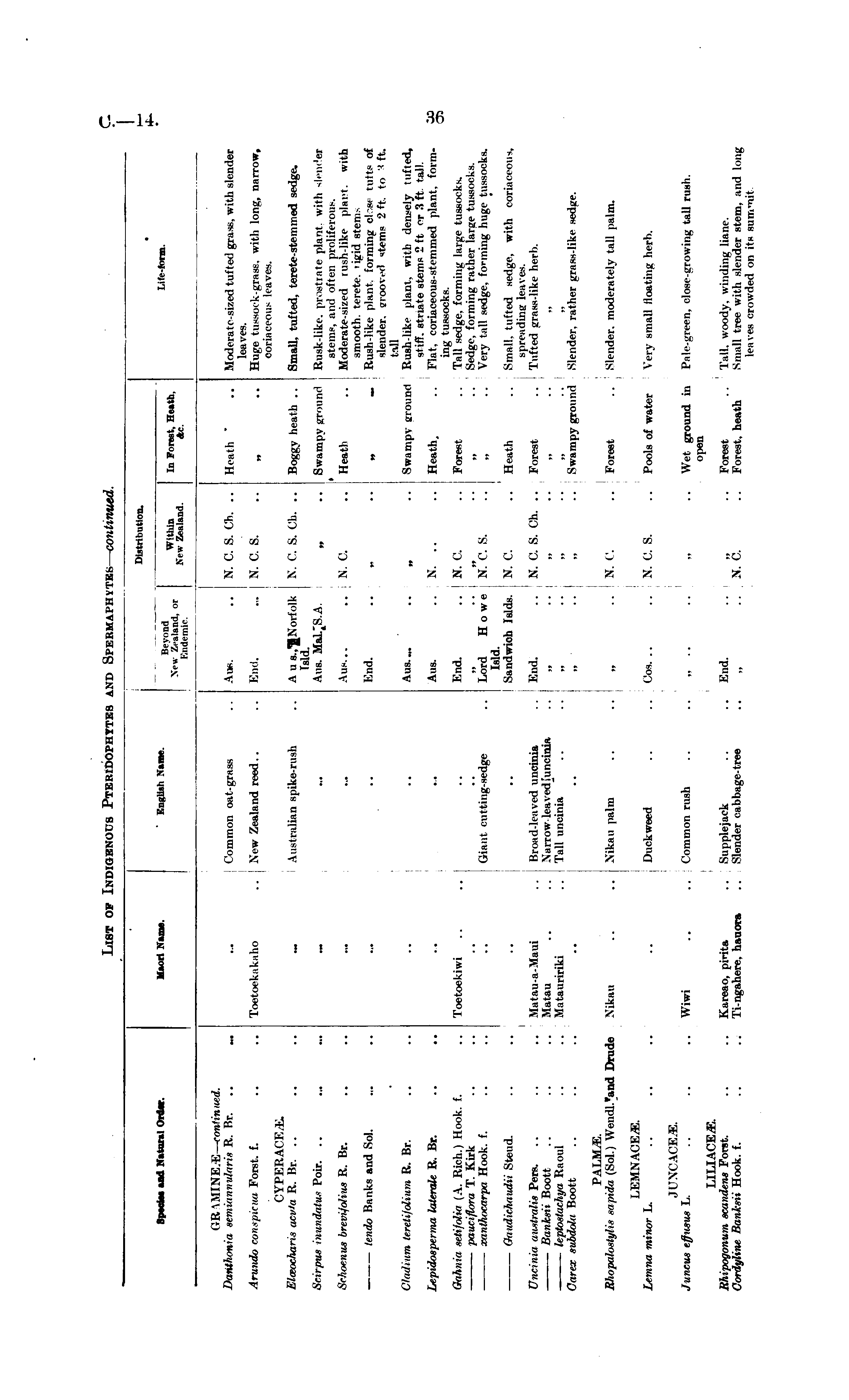 Species and Natural Order. Maori Name. English Name. Beyond New Zealand, or Endemic. Distribution. Within New Zealand. Distribution. « Life-form. In Forest, Heath, Ac. GR \MIXE.E— continued. Danthonia semitiiiiiniuiis R. Br. .. «. Arundo conspicua Forst. f. .. .. Toetoekakaho Elceocharis acv'a R. Br. .. Scirpus in initial us Poir. .. ... ... Schoenus brevi/olius R. Br. .. .. ... tendo Banks and Sol. j Common oat-grass _ . . New Zealand reed.. Australian spike-rush Aus. .. N. C. S. Ch. .. Heath " .. Moderate-sized tufted grass, with slender leaves. End. ... N. C. S. .. „ .. Huge tussock-grass, with long, narrow, coriaceous leaves. A u N. C. S. Ch. .. Boggy heath .. Small, tufted, terete-stemmed sedge. Isld. Aus. „ .. Swampy ground Rusk-like, prostrate plant with slender » steins, and often proliferous. Aus... ... X. C. .. Heath .. Moderate-sized rush-like plant, with smooth terete, ugid steniEnd. „ „ _ Rush-like plant, forming cl -si tufts of slender, arooved stems 2 ft. to 3 ft. tall Aus..,. .. „ .. Swampv around Rush-like plant, with densely tufted, stiff, striate stems 2 ft or 3 ft tall. Aus. ..IN. .. .. Heath .. Flat, coriaceous-stemmed plant, forming tussocks. End. .. N. C. .. Forest .. Tall sedge, forming large tussocks. ,, .. „ .. „ .. Sedge, forming rather large tussocks. Lord Howe N. C. S. .. „ .. Verv tall sedge, forming huge tussocks. Isld. Sandwich Islds. N. C. .. Heath .. Small, tufted sedge, with coriaceous, spreadinc leaves. End. .. N. C. S. Ch. .. Forest .. Tufted grass-like herb. ClaiJtum leretifolium R. Br. Lepidosperma Uiterale R. Br. Gahnia setifolia (A. Rich.) Hook. f. .. Toetoekiwi pauciflora T. Kirk xanthocarpa Hook. f. Giant cutting-sedge I Giiudichaudii Steud. Uncinia australis Pen. .. .. .. Matau-a-Maui — ■ Banksii Boott .. .. .. Matau leptostacltya Raoul .. . . Matauririki Carex subdola Boott Broad-leaved uncinia Narrow leaved'uncinia Tall uncinia „ .. I ,, .. Swampy ground Slender, rather grass-like sedge. PALM^E. Rhopalostylis sapida (Sol.) Wendl.'and Drude Xikau Xika ii palm „ .. X. C. .. Forest .. Slender, moderately tall palm. LEMNACE.E. Lemna minor L. .. .. .. Duckweed Cos. .. .. N. C. S. .. Pools of water Very small Moating herb. J uncus efinsus L. .. .. .. Wiwi Common rush „ .. .. .. .. Wet ground in Pale-green, dose-growing tall rush. open LILIACEiE. Rhipogonum scandens Forst. .. .. Kareao, pirita Cordyline Banksii Hook. f. .. .. Ti-ngahere, hauora Supplejack Slender cabbage-tree ., . _ End. .. ,, .. Forest Tall, woody, winding liane. „ ..X. C. .. Forest, heath Small tree with slender stem, and long le;i eps Crovi-Hpd r»ri it« Kiirr.*nif