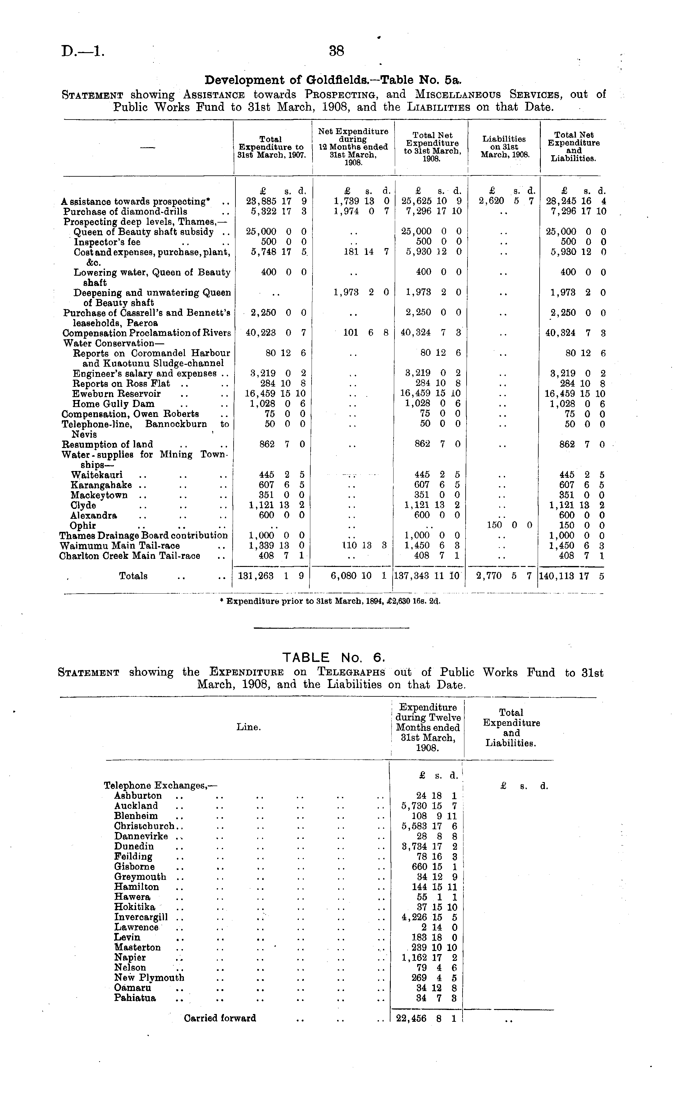 Development of Goldfields.—Table No. 5a. Statement showing Assistance towards Prospecting, and Miscellaneous Services, out of Public Works Fund to 31st March, 1908, and the Liabilities on that Date.