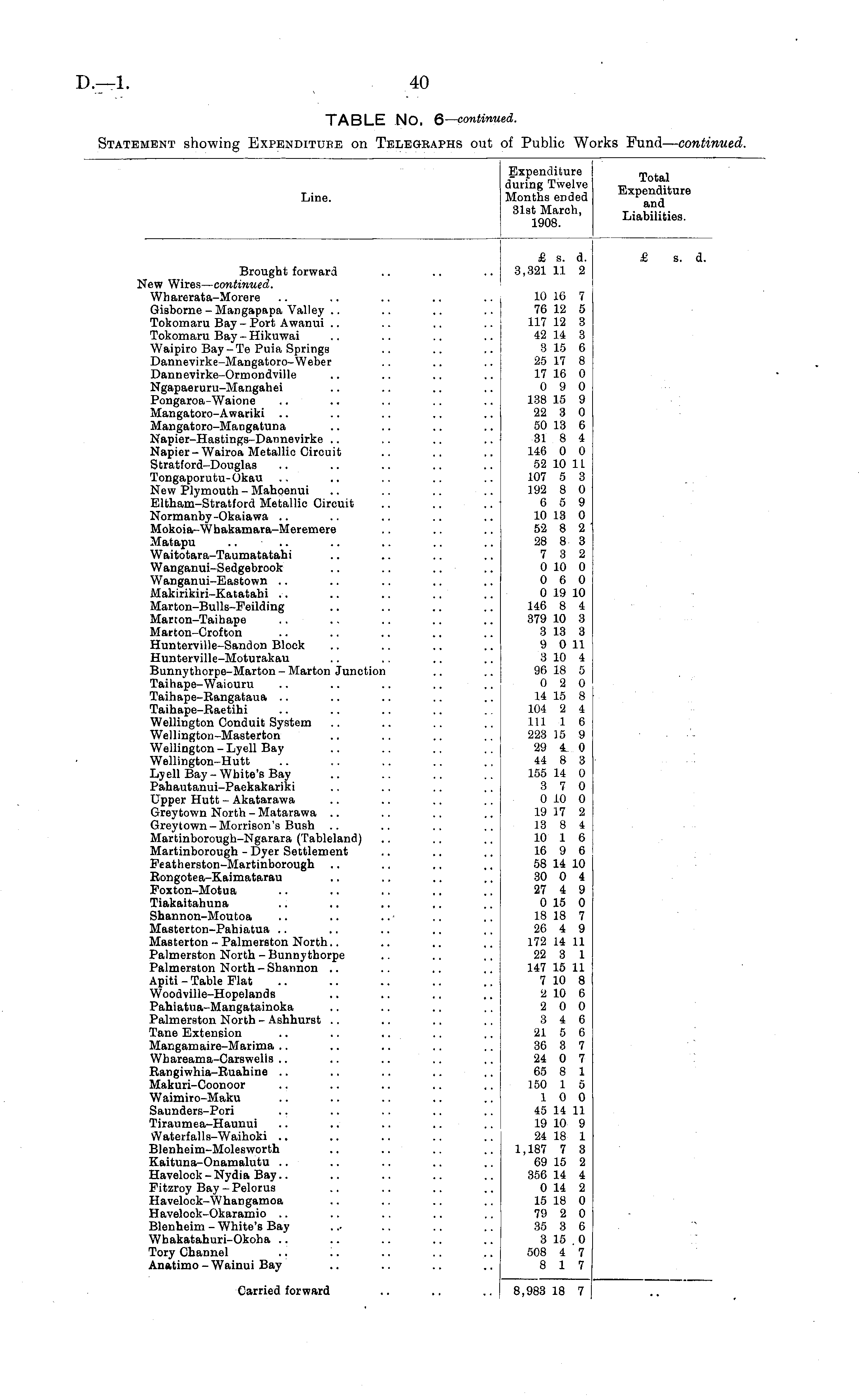 Line. Expenditure during Twelve Months ended 31st March, 1908. Total Expenditure and Liabilities. Brought forward New Wires — continued. Wharerata-Morere Gisborne - Mangapapa Valley Tokomaru Bay - Port Awanui Tokomaru Bay - Hikuwai Waipiro Bay-Te Puia Springs Dannevirke-Mangatoro-Weber Dannevirke-Ormondville Ngapaeruru-Mangahei Pongaroa-Waione Mangatoro-Awariki Mangatoro-Mangatuna Napier-Hastings-Dannevirke Napier-Wairoa Metallic Circuit Stratford-Douglas Tongaporutu-Okau New Plymouth - Mahoenui Eltham-Stratford Metallic Circuit Normanby-Okaiawa .. Mokoia-Whakamara-Meremere Matapu .. Waitotara-Taumatatahi Wanganui-Sedgebrook Wanganui-Eastown Makirikiri-Katatahi Marton-Bulls-Feilding Marton-Taihape Marton-Crofton Hunterville-Sandon Block Hunterville-Moturakau Bunnythorpe-Marton - Marton Junction Taihape-Waiouru Taihape-Rangataua Taihape-Raetihi Wellington Conduit System Wellington-Masterton Wellington - Lyell Bay Wellington-Hutt Lyell Bay - White's Bay Pahautanui-Paekakariki Upper Hutt - Akatarawa Greytown North - Matarawa Greytown-Morrison's Bush Martinborough-Ngarara (Tableland) Martinborough - Dyer Settlement Featherston-Martinborough Rongotea-Kaimatarau Foxton-Motua Tiakaitahuna Shannon-Moutoa Masterton-Pahiatua Masterton - Palmerston North Palmerston North - Bunnythorpe Palmerston North - Shannon Apiti - Table Flat Woodville-Hopelands Pahiatua-Mangatainoka Palmerston North - Ashhurst Tane Extension .. .. .. Maiigamaire-Marima Whareama-Carswells Rangiwhia-Ruahine Makuri-Coonoor Waimiro-Maku Saunders-Pori Tiraumea-Haunui Waterfalls-Waihoki Blenheim-Molesworth Kaituna-Onamalutu Havelock - Nydia Bay Fitzroy Bay - Pelorus Havelock-Whangamoa Havelock-Okaramio Blenheim - White's Bay Whakatahuri-Okoha Tory Channel Anatimo-Wainui Bay £ s. d. 3,321 11 2 £ s. d. 10 16 7 76 12 5 117 12 3 42 14 3 3 15 6 25 17 8 17 16 0 0 9 0 138 15 9 22 3 0 50 13 6 31 8 4 146 0 0 52 10 11 107 5 3 192 8 0 6 5 9 10 13 0 52 8 2 28 8 3 7 3 2 0 10 0 0 6 0 0 19 10 146 8 4 379 10 3 3 13 3 9 0 11 3 10 4 96 18 5 0 2 0 14 15 8 104 2 4 111 1 6 223 15 9 29 4 0 44 8 3 155 14 0 3 7 0 0 10 0 19 17 2 13 8 4 10 1 6 16 9 6 58 14 10 30 0 4 27 4 9 0 15 0 18 18 7 26 4 9 172 14 11 22 3 1 147 15 11 7 10 8 2 10 6 2 0 0 3 4 6 21 5 6 36 3 7 24 0 7 65 8 1 150 1 5 1 0 0 45 14 11 19 10 9 24 18 1 1,187 7 3 69 15 2 356 14 4 0 14 2 15 18 0 79 2 0 35 3 6 3 15 0 508 4 7 8 17 Carried forward 8,983 18 7