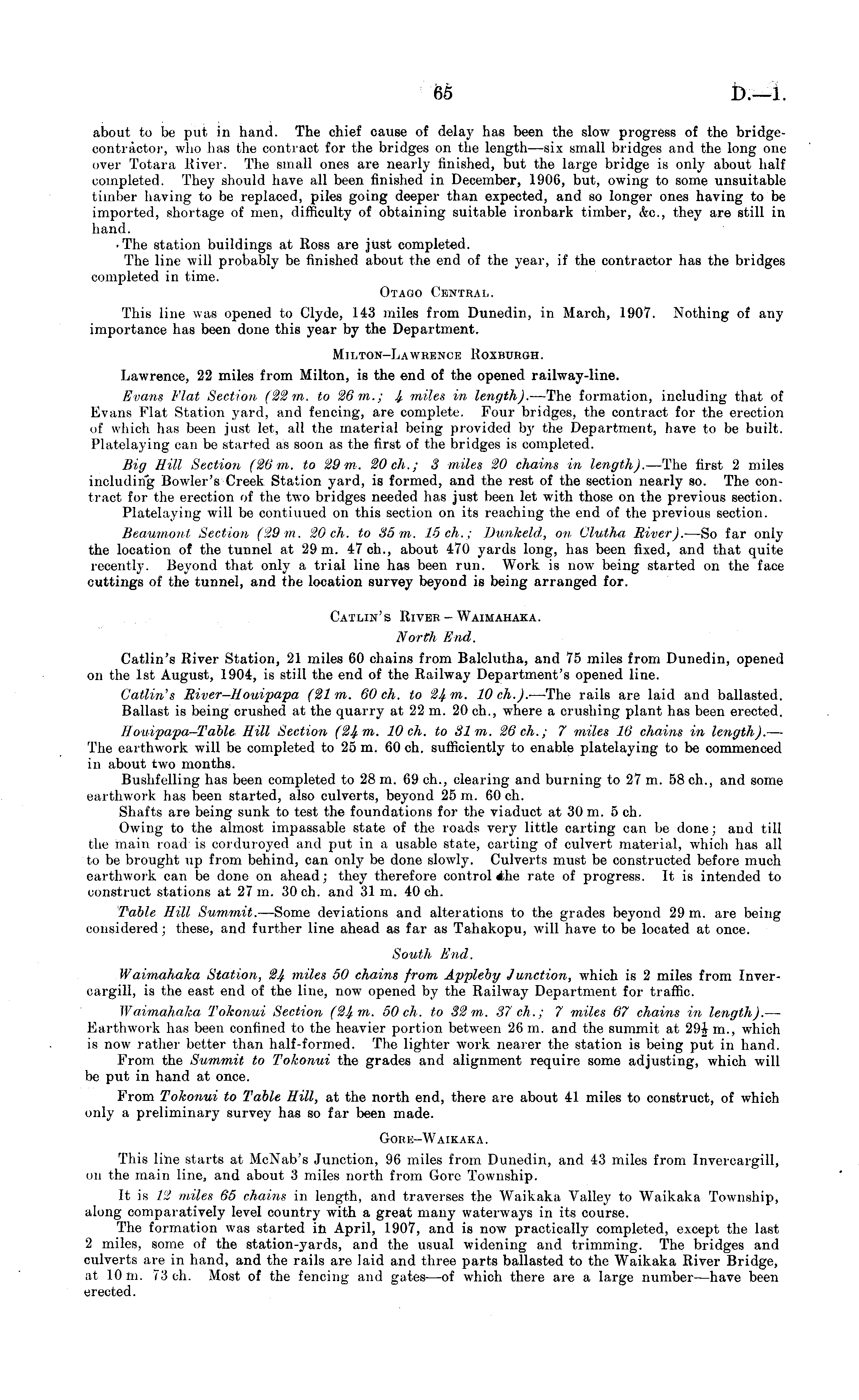 about to be put in hand. The chief cause of delay has been the slow progress of the bridgecontractor, who has the contract for the bridges on the length—six small bridges and the long one over Totara River. The small ones are nearly finished, but the large bridge is only about half completed. They should have all been finished in December, 1906, but, owing to some unsuitable timber having to be replaced, piles going deeper than expected, and so longer ones having to be imported, shortage of men, difficulty of obtaining suitable ironbark timber, &c, they are still in hand. ■ The station buildings at Ross are just completed. The line will probably be finished about the end of the year, if the contractor has the bridges completed in time. Otago Central. This line was opened to Clyde, 143 miles from Dunedin, in March, 1907. Nothing of any importance has been done this year by the Department. Milton-Lawrence Roxburgh. Lawrence, 22 miles from Milton, is the end of the opened railway-line. Evans Flat Section (22 m. to 26 m.; 4 miles in length). —The formation, including that of Evans Flat Station yard, and fencing, are complete. Four bridges, the contract for the erection of which has been just let, all the material being provided by the Department, have to be built. Platelaying can be started as soon as the first of the bridges is completed. Big Hill Section (26 m. to 29 m. 20 eh.; 3 miles 20 chains in length). —The first 2 miles including Bowler's Creek Station yard, is formed, and the rest of the section nearly so. The contract for the erection of the two bridges needed has just been let with those on the previous section. Platelaying will be continued on this section on its reaching the end of the previous section. Beaumont Section (29 m. 20 eh. to 35 m. 15 eh.; Dunkeld, on Clutha River). —So far only the location of the tunnel at 29 m. 47 eh., about 470 yards long, has been fixed, and that quite recently. Beyond that only a trial line has been run. Work is now being started on the face cuttings of the tunnel, and the location survey beyond is being arranged for. Catlin's River - Waimahaka. North End. Catlin's River Station, 21 miles 60 chains from Balclutha, and 75 miles from Dunedin, opened on the Ist August, 1904, is still the end of the Railway Department's opened line. Catlin's River-Houipapa (21 m. 60 eh. to 24 m. 10 eh.). —The rails are laid and ballasted. Ballast is being crushed at the quarry at 22 m. 20 eh., where a crushing plant has been erected. Houipapa—Table Hill Section (24 m. 10 eh. to 81m. 26 eh.; 7 miles 16 chains in length). — The earthwork will be completed to 25 m. 60 eh. sufficiently to enable platelaying to be commenced in about two months. Bushfclling has been completed to 28 m. 69 eh., clearing and burning to 27 m. 58 eh., and some earthwork has been started, also culverts, beyond 25 m. 60 eh. Shafts are being sunk to test the foundations for the viaduct at 30 m. 5 eh. Owing to the almost impassable state of the roads very little carting can be done; and till the main road is corduroyed and put in a usable state, carting of culvert material, which has all to be brought up from behind, can only be done slowly. Culverts must be constructed before much earthwork can be done on ahead; they therefore control Ahe rate of progress. It is intended to construct stations at 27 m. 30 eh. and 31 m. 40 eh. Table Hill Summit. —Some deviations and alterations to the grades beyond 29 m. are being considered; these, and further line ahead as far as Tahakopu, will have to be located at once. South End. Waimahaka Station, 24 miles 50 chains from Appleby Junction, which is 2 miles from Invercargill, is the east end of the line, now opened by the Railway Department for traffic. Waimahaka Tokonui Section (24 m. 50 eh. to 32 m. 37 eh.; 7 miles 67 chains in length). — Earthwork has been confined to the heavier portion between 26 m. and the summit at 294 m., which is now rather better than half-formed. The lighter work nearer the station is being put in hand. From the Summit to Tokonui the grades and alignment require some adjusting, which will be put in hand at once. From Tokonui to Table Hill, at the north end, there are about 41 miles to construct, of which only a preliminary survey has so far been made. Gore-Waikaka . This line starts at McNab's Junction, 96 miles from Dunedin, and 43 miles from Invercargill, on the main line, and about 3 miles north from Gore Township. It is 12 miles 65 chains in length, and traverses the Waikaka Valley to Waikaka Township, along comparatively level country with a great many waterways in its course. The formation was started in April, 1907, and is now practically completed, except the last 2 miles, some of the station-yards, and the usual widening and trimming. The bridges and culverts are in hand, and the rails are laid and three parts ballasted to the Waikaka River Bridge, at 10 m. 73 eh. Most of the fencing and gates—of which there are a large number —have been erected.