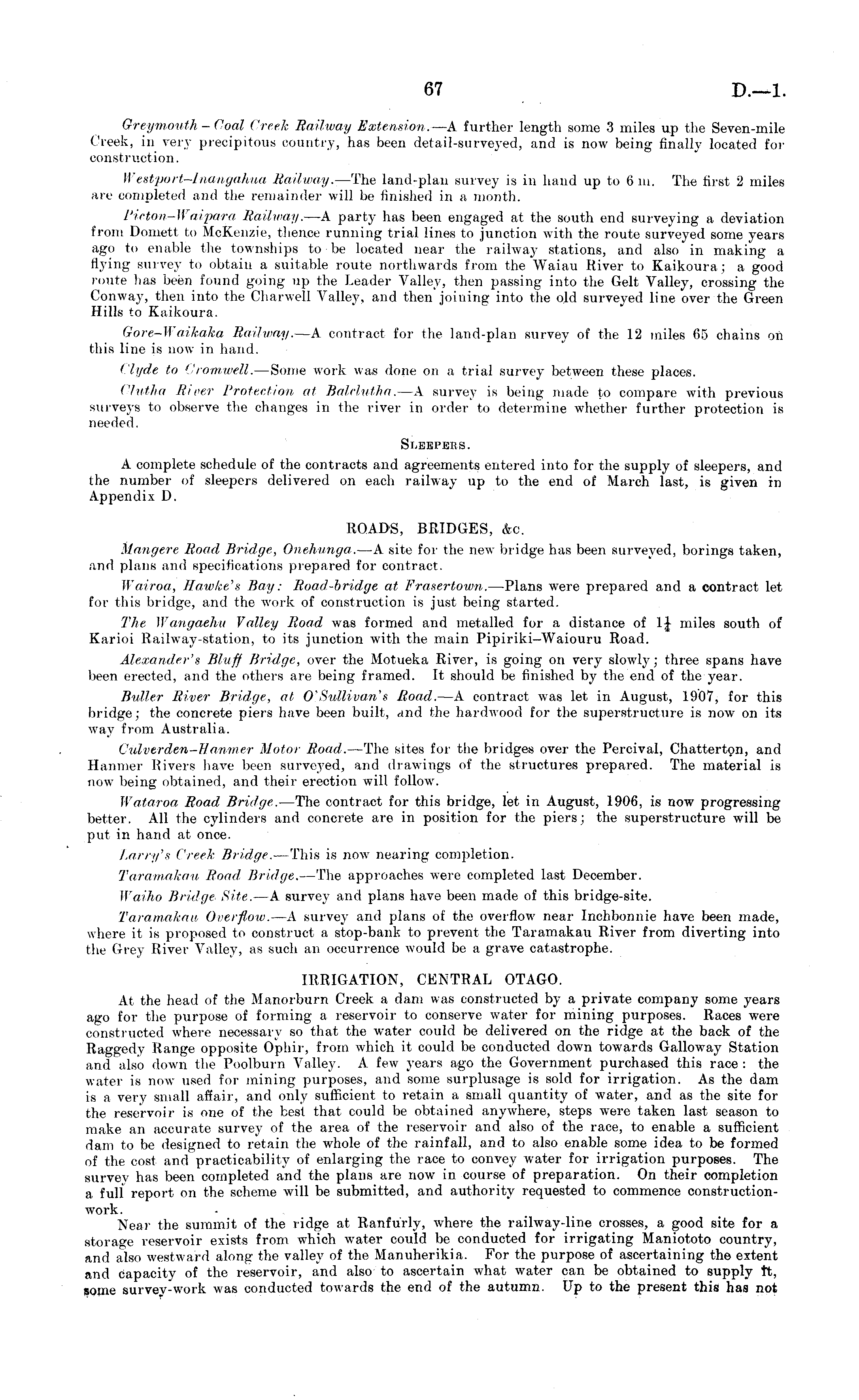 Greymouth -Coal Creek Railway Extension. —A further length some 3 miles up the Seven-mile Creek, in very precipitous country, has been detail-surveyed, and is now being finally located for const ruction. Westpart-Inangahua Railway. —The land-plan survey is in hand up to 6 in. The first 2 miles are completed and the remainder will be finished in ;i month. Picton-W aipara Railway. —A party has been engaged at the south end surveying a deviation from Domett to McKen/ie, thence running trial lines to junction with the route surveyed some years ago to enable the townships to be located near the railway stations, and also in making a Hying survey to obtain a suitable route northwards from the Waiau River to Kaikoura; a good route has been found going up the Leader Valley, then passing into the Gelt Valley, crossing the Conway, then into the Charwell Valley, and then joining into the old surveyed line over the Green Hills to Kaikoura. Gore-Waikaka Railway. —A contract for the land-plan survey of the 12 miles 65 chains on this line is now in hand. Clyde to Cromwell. —Some work was done on a trial survey between these places. Clutha River Protection at Balclutha.—A survey is being made to compare with previous surveys to observe the changes in the river in order to determine whether further protection is needed. Sleepers. A complete schedule of the contracts and agreements entered into for the supply of sleepers, and the number of sleepers delivered on each railway up to the end of March last, is given in Appendix D. ROADS, BRIDGES, &c. Mangere Rood Bridge, Onehunga. —A site for the new bridge has been surveyed, borings taken, and plans and specifications prepared for contract. Wairoa, Hawke's Bay: Road-bridge at Frasertown. —Plans prepared and a contract let for this bridge, and the work of construction is just being started. The Waugaehu Valley Road was formed and metalled for a distance of 1J miles south of Karioi Railway-station, to its junction with the main Pipiriki-Waiouru Road. Alexander's Bluff Bridge, over the Motueka River, is going on very slowly; three spans have been erected, and the others are being framed. It should be finished by the end of the year. Buller River Bridge, at O'Sullivan's Road. —A contract was let in August, 1907, for this bridge; the concrete piers have been built, and the hardwood for the superstructure is now on its way from Australia. Culverden-llainner Motor Road. —The sites for the bridges over the Percival, Chattertpn, and Hanmer Rivers have been surveyed, and drawings of the structures prepared. The material is now being obtained, and their erection will follow. Wataroa Road Bridge. —The contract for this bridge, let in August, 1906, is now progressing better. All the cylinders and concrete are in position for the piers; the superstructure will be put in hand at once. Harry's Creek Bridge. —This is now Hearing completion. Taramakau Road Bridge. —The approaches were completed last December. Waiho Bridge Site. — A survey and plans have been made of this bridge-site. Taramakau Overflow. —A survey and plans of the overflow near Inchbonnie have been made, where it is proposed to construct a stop-bank to prevent the Taramakau River from diverting into the Grey River Valley, its such an occurrence would be a grave catastrophe. IRRIGATION, CENTRAL OTAGO. At the head of the Manorburn Creek a dam was constructed by a private company some years ago for the purpose of forming a reservoir to conserve water for mining purposes. Races were constructed where necessary so that the water could be delivered on the ridge at the back of the Raggedy Range opposite Ophir, from which it could be conducted down towards Galloway Station and also down the Poolburn Valley. A few years ago the Government purchased this race: the water is now used for mining purposes, and some surplusage is sold for irrigation. As the dam is a very small affair, and only sufficient to retain a small quantity of water, and as the site for the reservoir is one of the best that could be obtained anywhere, steps were taken last season to make an accurate survey of the area of the reservoir and also of the race, to enable a sufficient dam to be designed to retain the whole of the rainfall, and to also enable some idea to be formed of the cost and practicability of enlarging the race to convey water for irrigation purposes. The survey has been completed and the plans are now in course of preparation. On their completion a full report on the scheme will be submitted, and authority requested to commence constructionwork. Near the summit of the ridge at Ranfurly, where the railway-line crosses, a good site for a storage reservoir exists from which water could be conducted for irrigating Maniototo country, and also westward along the valley of the Manuherikia. For the purpose of ascertaining the extent and Capacity of the reservoir, and also to ascertain what water can be obtained to supply tt, some survey-work was conducted towards the end of the autumn. Up to the present this has not