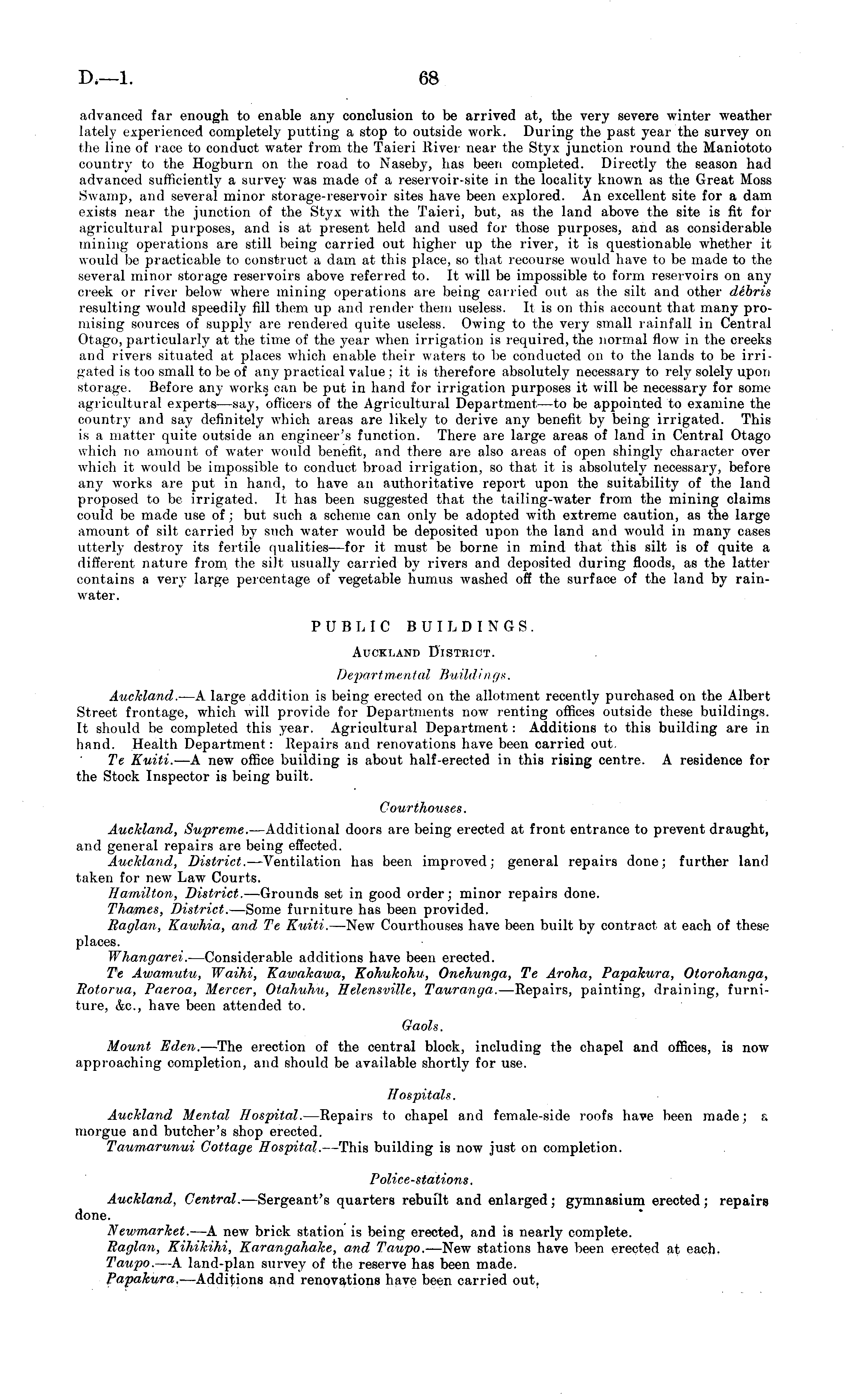 advanced far enough to enable any conclusion to be arrived at, the very severe winter weather lately experienced completely putting a stop to outside work. During the past year the survey on the line of race to conduct water from the Taieri River near the Styx junction round the Maniototo country to the Hogburn on the road to Naseby, has been completed. Directly the season had advanced sufficiently a survey was made of a reservoir-site in the locality known as the Great Moss Swamp, and several minor storage-reservoir sites have been explored. An excellent site for a dam exists near the junction of the Styx with the Taieri, but, as the land above the site is fit for agricultural purposes, and is at present held and used for those purposes, and as considerable mining operations are still being carried out higher up the river, it is questionable whether it would be practicable to construct a dam at this place, so that recourse would have to be made to the several minor storage reservoirs above referred to. It will be impossible to form reservoirs on any creek or river below where mining operations are being carried out sis the silt and other debris resulting would speedily fill them up and render them useless. It is on this account that many promising sources of supply are rendered quite useless. Owing to the very small rainfall in Central Otago, particularly at the time of the year when irrigation is required, the normal flow in the creeks and rivers situated at places which enable their waters to be conducted on to the lands to be irrigated is too small to be of any practical value ; it is therefore absolutely necessary to rely solely upon storage. Before any works can be put in hand for irrigation purposes it will be necessary for some agricultural experts —say, officers of the Agricultural Department—to be appointed to examine the country and say definitely which areas are likely to derive any benefit by being irrigated. This is a matter quite outside an engineer's function. There are large areas of land in Central Otago which no amount of water would benefit, and there are also areas of open shingly character over which it would be impossible to conduct broad irrigation, so that it is absolutely necessary, before any works are put in hand, to have an authoritative report upon the suitability of the land proposed to be irrigated. It has been suggested that the tailing-water from the mining claims could be made use of; but such a scheme can only be adopted with extreme caution, as the large amount of silt carried by such water would be deposited upon the land and would in many cases utterly destroy its fertile qualities—for it must be borne in mind that this silt is of quite a different nature from, the silt usually carried by rivers and deposited during floods, as the latter contains a very large percentage of vegetable humus washed off the surface of the land by rainwater. PUBLIC BUILDINGS. Auckland District. Depart men tal Bu ildin gs. Auckland. —A large addition is being erected on the allotment recently purchased on the Albert Street frontage, which will provide for Departments now renting offices outside these buildings. It should be completed this year. Agricultural Department: Additions to this building are in hand. Health Department: Repairs and renovations have been carried out. Te Kuiti. —A new office building is about half-erected in this rising centre. A residence for the Stock Inspector is being built. Courthouses. Auckland, Supreme. —Additional doors are being erected at front entrance to prevent draught, and general repairs are being effected. Auckland, District. —Ventilation has been improved; general repairs done; further land taken for new Law Courts. Hamilton, District. —Grounds set in good order; minor repairs done. Thames, District. —Some furniture has been provided. Raglan, Kawhia, and Te Kuiti. —New Courthouses have been built by contract at each of these places. Whangarei. —Considerable additions have been erected. Te Awamutu, Waihi, Kawakawa, Kohukohu, Onehunga, Te Aroha, Papakura, Otorohanga, Rotorua, Paeroa, Mercer, Otahuhu, HelensviUe, Tauranga. —Repairs, painting, draining, furniture, &c, have been attended to. Gaols. Mount Eden. —The erection of the central block, including the chapel and offices, is now approaching completion, and should be available shortly for use. Hospitals. Auckland Mental Hospital. —Repairs to chapel and female-side roofs have been made; a morgue and butcher's shop erected. Taumarunui Cottage Hospital. —This building is now just on completion. Police-stations. Auckland, Central. —Sergeant's quarters rebuilt and enlarged; gymnasium erected; repairs done. Newmarket. —A new brick station is being erected, and is nearly complete. Raglan, Kihikihi, Karangahake, and Taupo. —New stations have been erected at each, Taupo. —A land-plan survey of the reserve has been made. Papakura. —Additions and renovations have been carried out.