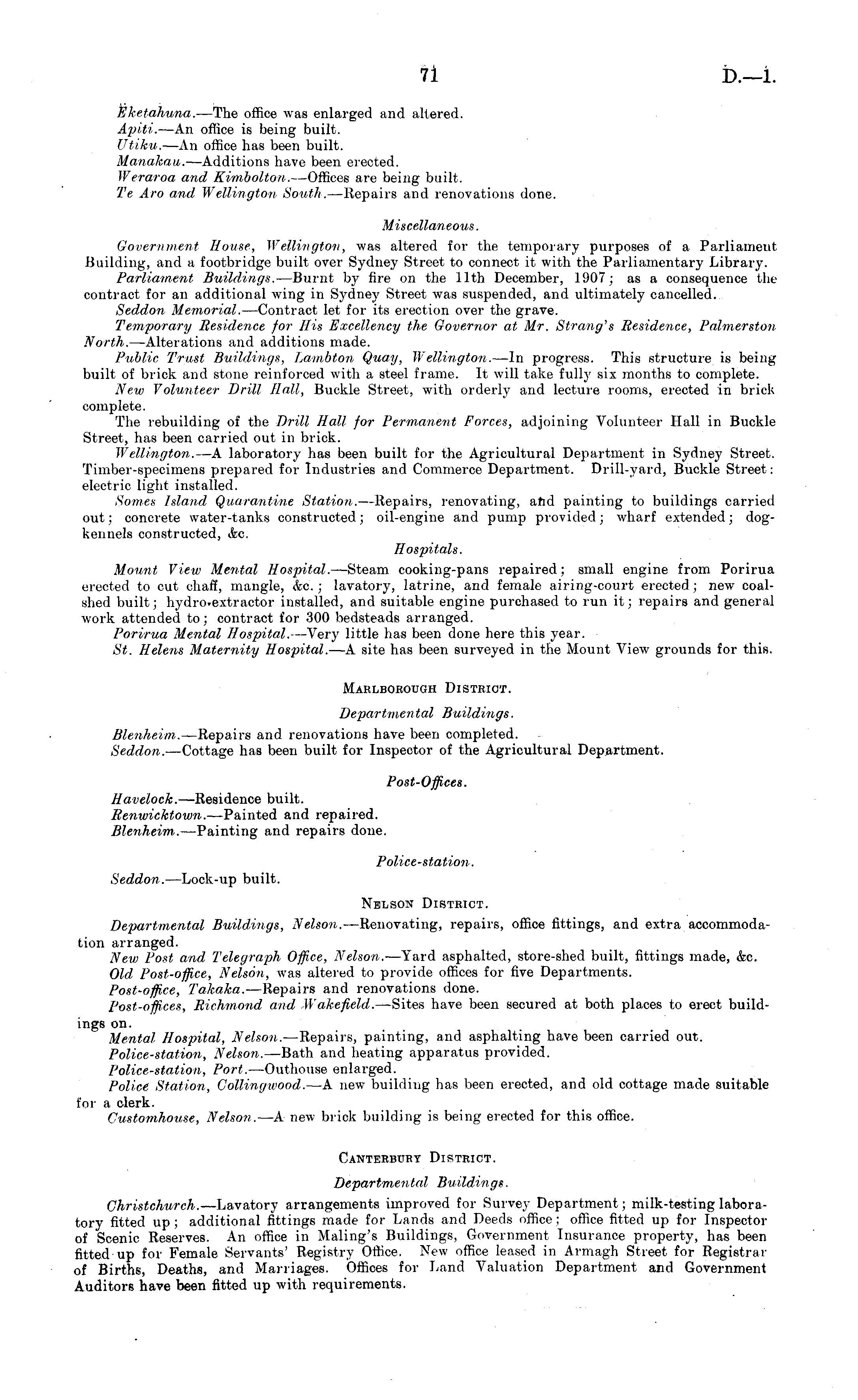Eketahuna. —The office was enlarged and altered. Apiti. —An office is being built. Utiku. —An office has been built. Manakau. —Additions have been erected. Weraroa and Kimbolton. —Offices are being built. Te Aro and Wellington South. —Repairs and renovations done. Miscellaneous. Government House, Wellington , was altered for the temporary purposes of a Parliament Building, and it footbridge built over Sydney Street to connect it with the Parliamentary Library. Parliament Buildings. —Burnt by fire on the 11th December, 1907; as a consequence the contract for an additional wing in Sydney Street was suspended, and ultimately cancelled. Seddon Memorial. —Contract let for its erection over the grave. Temporary Residence for His Excellency the Governor at Mr. Strang's Residence, Palmerston North. —Alterations and additions made. Public Trust Buildings, Ijimbton Quay, Wellington. —ln progress. This structure is being built of brick and stone reinforced with a steel frame. It will take fully six months to complete. New Volunteer Drill Hall, Buckle Street, with orderly and lecture rooms, erected in brick complete. The rebuilding of the Drill Hall for Permanent Forces, adjoining Volunteer Hall in Buckle Street, has been carried out in brick. Wellington. —A laboratory has been built for the Agricultural Department in Sydney Street. Timber-specimens prepared for Industries and Commerce Department. Drill-yard, Buckle Street: electric light installed. Somes Island Quarantine Station. —Repairs, renovating, arid painting to buildings carried out; concrete water-tanks constructed; oil-engine and pump provided; wharf extended; dogkennels constructed, ifec. Hospitals. Mount View Mental Hospital. —Steam cooking-pans repaired; small engine from Porirua erected to cut chaff, mangle, &c. ; lavatory, latrine, and female airing-court erected; new- coalshed built; hydro.extractor installed, and suitable engine purchased to run it; repairs and general work attended to; contract for 300 bedsteads arranged. Porirua Mental Hospital.-— Very little has been done here this year. St. Helens Maternity Hospital. —A site has been surveyed in the Mount View grounds for this. Marlborough District. Departmental Buildings. Blenheim. —Repairs and renovations have been completed. Seddon. —Cottage has been built for Inspector of the Agricultural Department. Post-Offices. Havelock. —Residence built. Renwicktown. —Painted and repaired. Blenheim. —Painting and repairs done. Police-station. Seddon. —Lock-up built. Nelson District. Departmental Buildings, Nelson. —Renovating, repairs, office fittings, and extra accommodation arranged. New Post and Telegraph Office, Nelson. —Yard asphalted, store-shed built, fittings made, &c. Old Post-office, Nelson, was altered to provide offices for five Departments. Post-office, Takaka. —Repairs and renovations done. Post-offices, Richmond and Wakefield. —Sites have been secured at both places to erect buildings on. Mental Hospital, Nelson. —Repairs, painting, and asphalting have been carried out. I'ol ice-station, Nelson. —Bath and heating apparatus provided. Police-station, Port. —Outhouse enlarged. Police Station, Collingwood. —A new building has been erected, and old cottage made suitable for a clerk. Customhouse, Nelson. —A new brick building is being erected for this office. Canterbury District. Departmental Buildings. Christchurch. —Lavatory arrangements improved for Survey Department; milk-testing laboratory fitted up ; additional fittings made for Lands and Deeds office ; office fitted up for Inspector of Scenic Reserves. An office in Maling's Buildings, Government Insurance property, has been fitted up for Female Servants' Registry Office. New office leased in Armagh Street for Registrar of Births, Deaths, and Marriages. Offices for Land A 7 aluation Department and Government Auditors have been fitted up with requirements.