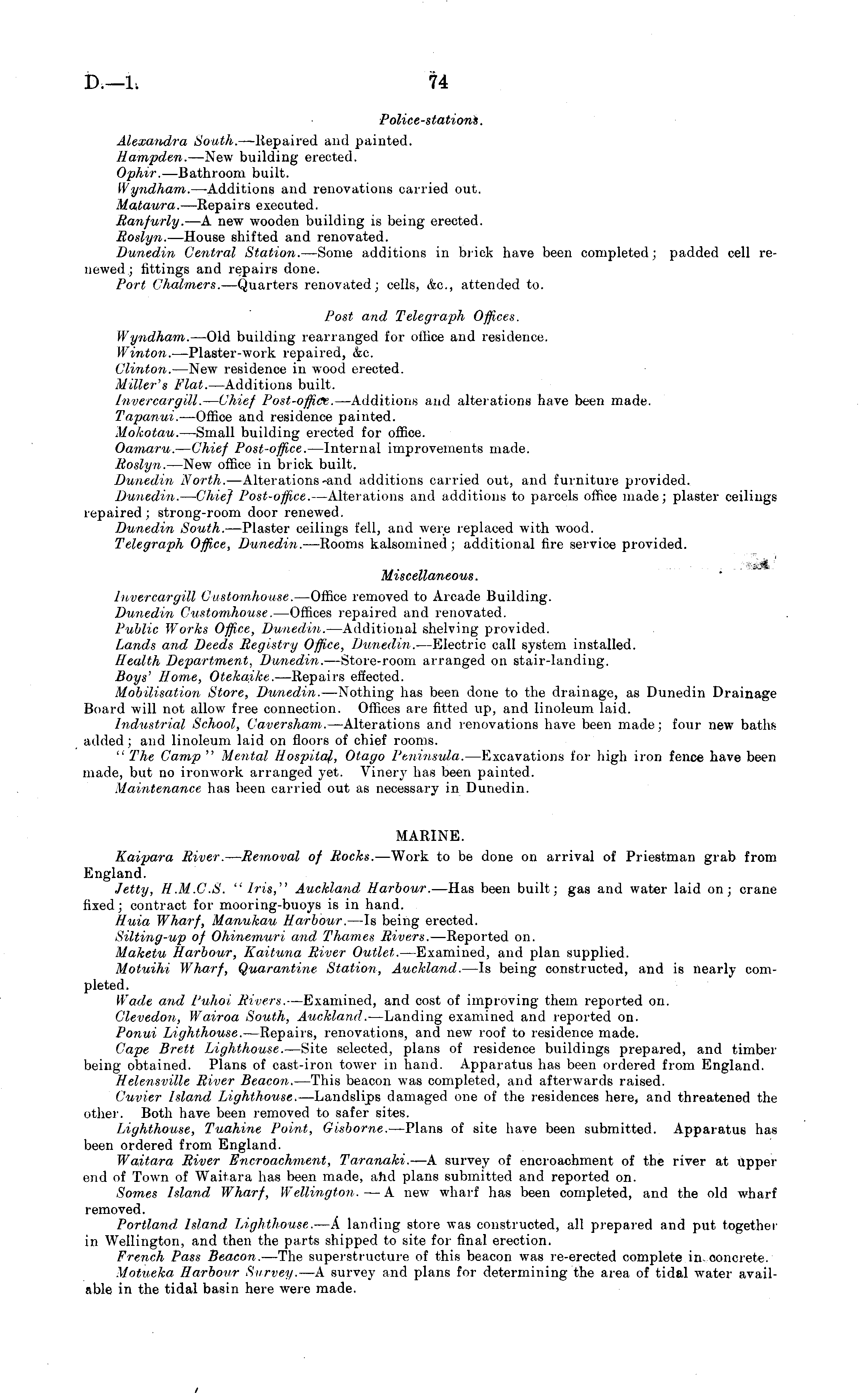 Police-stations. Alexandra South. —Repaired and painted. Hampden. —New building erected. Ophir. —Bathroom built. Wyndham. —Additions and renovations carried out. Mataura. —Repairs executed. Ranfurly. —A new wooden building is being erected. Roslyn. —House shifted and renovated. Dunedin Central Station. —Some additions in brick have been completed; padded cell renewed; fittings and repairs done. Port Chalmers. —Quarters renovated; cells, &c, attended to. Post and Telegraph Offices. Wyndham. —Old building rearranged for office and residence. Winton. —Plaster-work repaired, &c. Clinton. —New residence in wood erected. Miller's Flat. —Additions built. Invercargill. — Chief Post-office. —Additions and alterations have been made. Tapanui. —Office and residence painted. Mokotau. —Small building erected for office. Oamaru. — Chief Post-office. —Internal improvements made. Roslyn. —New office in brick built. Dunedin North. —Alterations-and additions carried out, and furniture provided. Dunedin. — Cliief Post-office. —Alterations and additions to parcels office made; plaster ceilings repaired; strong-room door renewed. Dunedin South. —Plaster ceilings fell, and were replaced with wood. Telegraph Office, Dunedin. —Rooms kalsomined ; additional fire service provided. Miscellaneous. Invercargill Customhouse. —Office removed to Arcade Building. Dunedin Customhouse. —Offices repaired and renovated. Public Works Office, Dunedin. —Additional shelving provided. Lands and Deeds Registry Office, Dunedin. —Electric call system installed. Health Department. Dunedin. —Store-room arranged on stair-landing. Boys' Home, Otekaike. —Repairs effected. Mobilisation Store, Dunedin. —Nothing has been done to the drainage, as Dunedin Drainage Board will not allow free connection. Offices are fitted up, and linoleum laid. Industrial School, Caversham. —Alterations and renovations have been made; four new baths added ; and linoleum laid on floors of chief rooms. " The Camp " Mental Hospital, Otago Peninsula. —Excavations for high iron fence have been made, but no ironwork arranged yet. Vinery has been painted. Maintenance has been carried out as necessary in Dunedin. MARINE. Kaipara River. — Removal of Rocks. —Work to be done on arrival of Priestman grab from England. Jetty, H.M.C.S. "Iris," Auckland, Harbour. —Has been built; gas and water laid on; crane fixed; contract for mooring-buoys is in hand. Huia Wharf, Manukau Harbour. —Is being erected. Silting-up of Ohinemuri and Thames Rivers. —Reported on. Maketu Harbour, Kaituna River Outlet. —Examined, and plan supplied. Motuihi Wharf, Quarantine Station, Auckland. —Is being constructed, and is nearly completed. Wade and Puhoi, Rivers. —Examined, and cost of improving them reported on. Clevedon, Wairoa South, Auckland. —Landing examined and reported on. Ponui Lighthouse. —Repairs, renovations, and new roof to residence made. Cape Brett Lighthouse. —Site selected, plans of residence buildings prepared, and timber being obtained. Plans of cast-iron tower in hand. Apparatus has been ordered from England. HelensviUe River Beacon. —This beacon was completed, and afterwards raised. Cuvier Island Lighthouse. —Landslips damaged one of the residences here, and threatened the other. Both have been removed to safer sites. Lighthouse, Tuahine Point, Gisborne. —Plans of site have been submitted. Apparatus has been ordered from England. Waitara River Encroachment, Taranaki. —A survey of encroachment of the river at upper end of Town of Waitara has been made, and plans submitted and reported on. Somes Island Wharf, Wellington. —A new wharf has been completed, and the old wharf removed. Portland Island Lighthouse. —A landing store was constructed, all prepared and put together in Wellington, and then the parts shipped to site for final erection. French Pass Beacon. —The superstructure of this beacon was re-erected complete in ooncrete. Motueka Harbour Survey. —A survey and plans for determining the area of tidal water available in the tidal basin here were made.