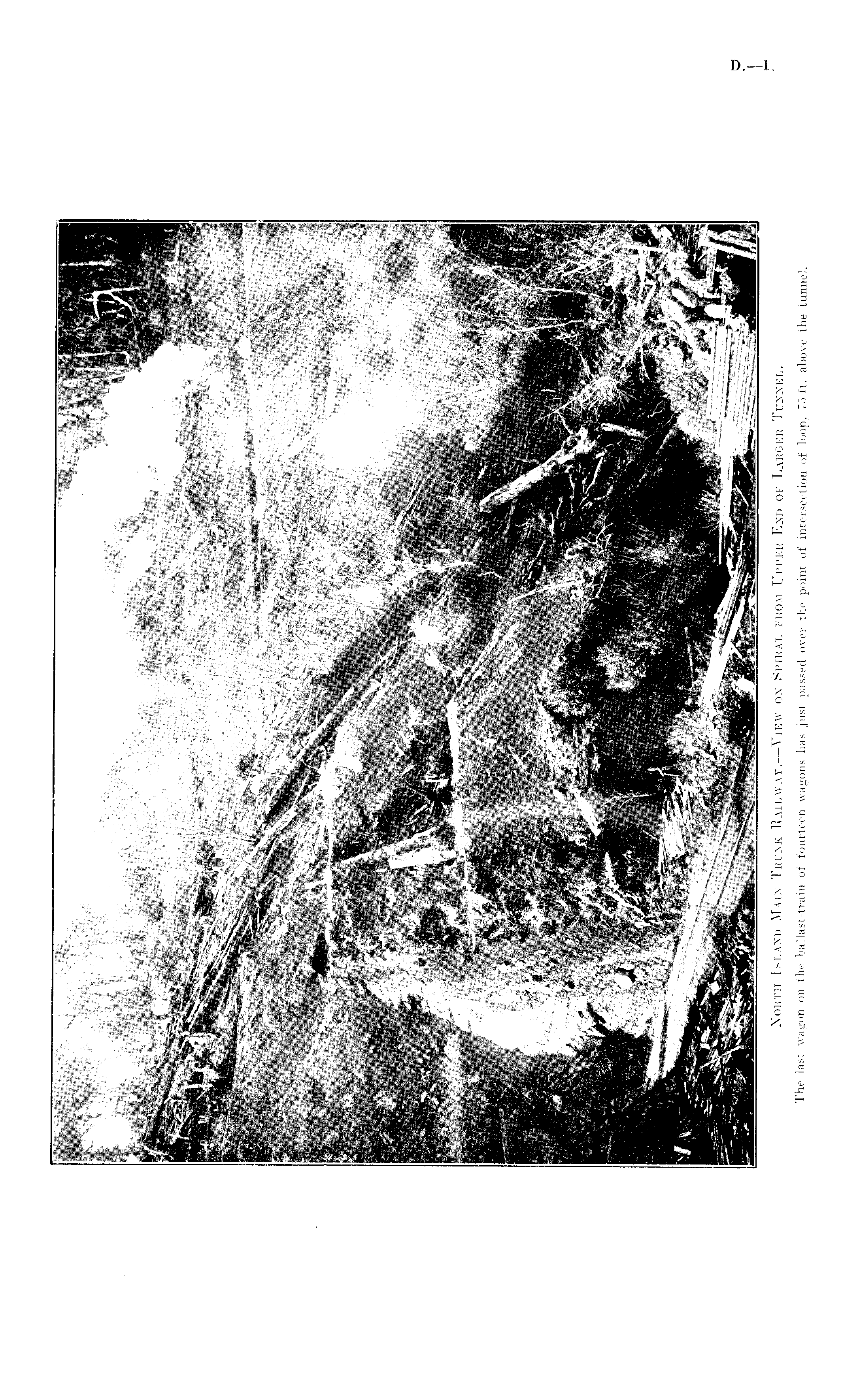 North Island Main Trunk Railway.—View on Spiral from Upper End of Larger Tunnel. The last wagon on the ballast-train of fourteen wagons has just passed over the point of intersection of loop, 75 ft. above the tunnel.