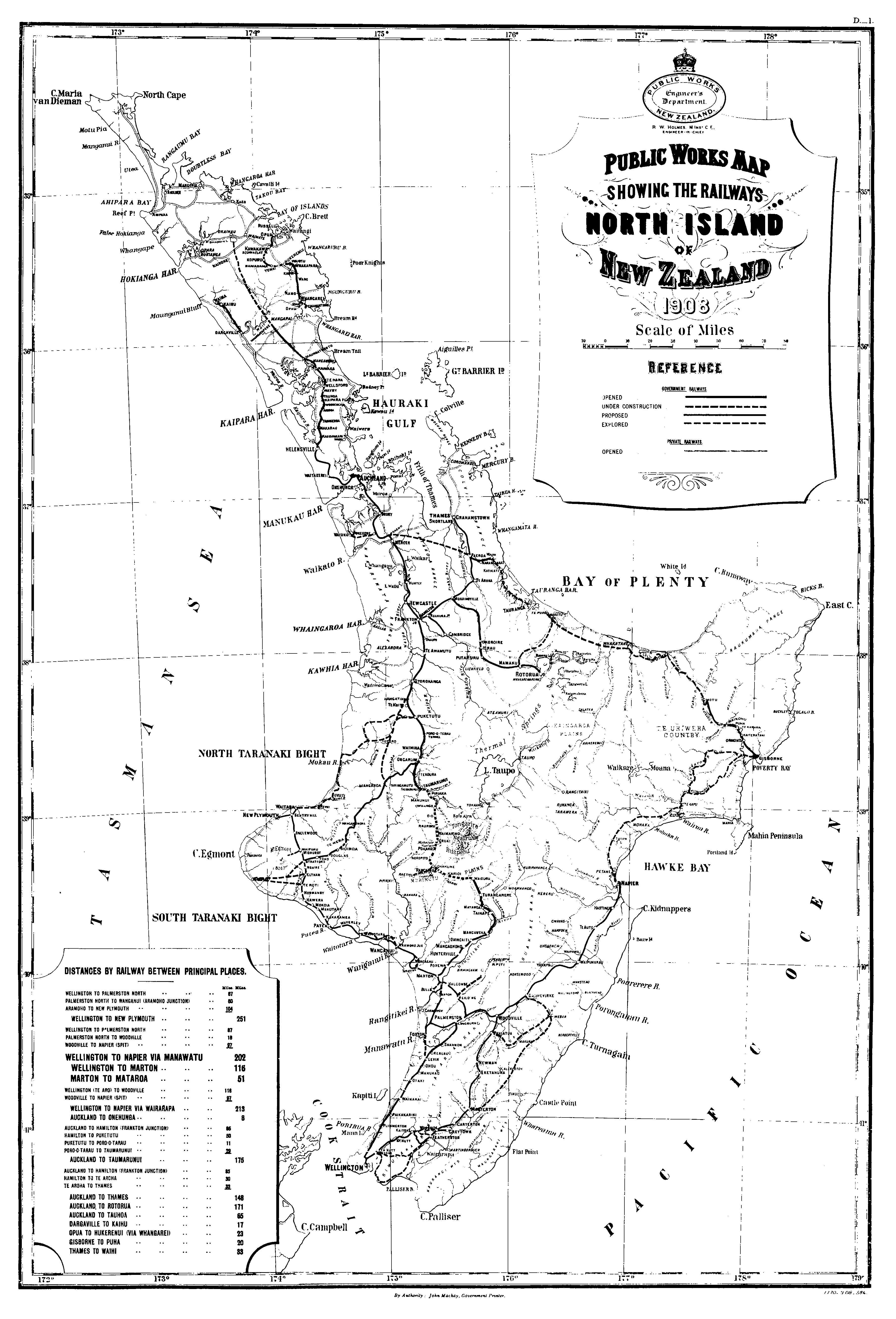 PUBLIC WORKS MAP SHOWING THE RAILWAYS NORTH ISLAND OF NEW ZEALAND 1908