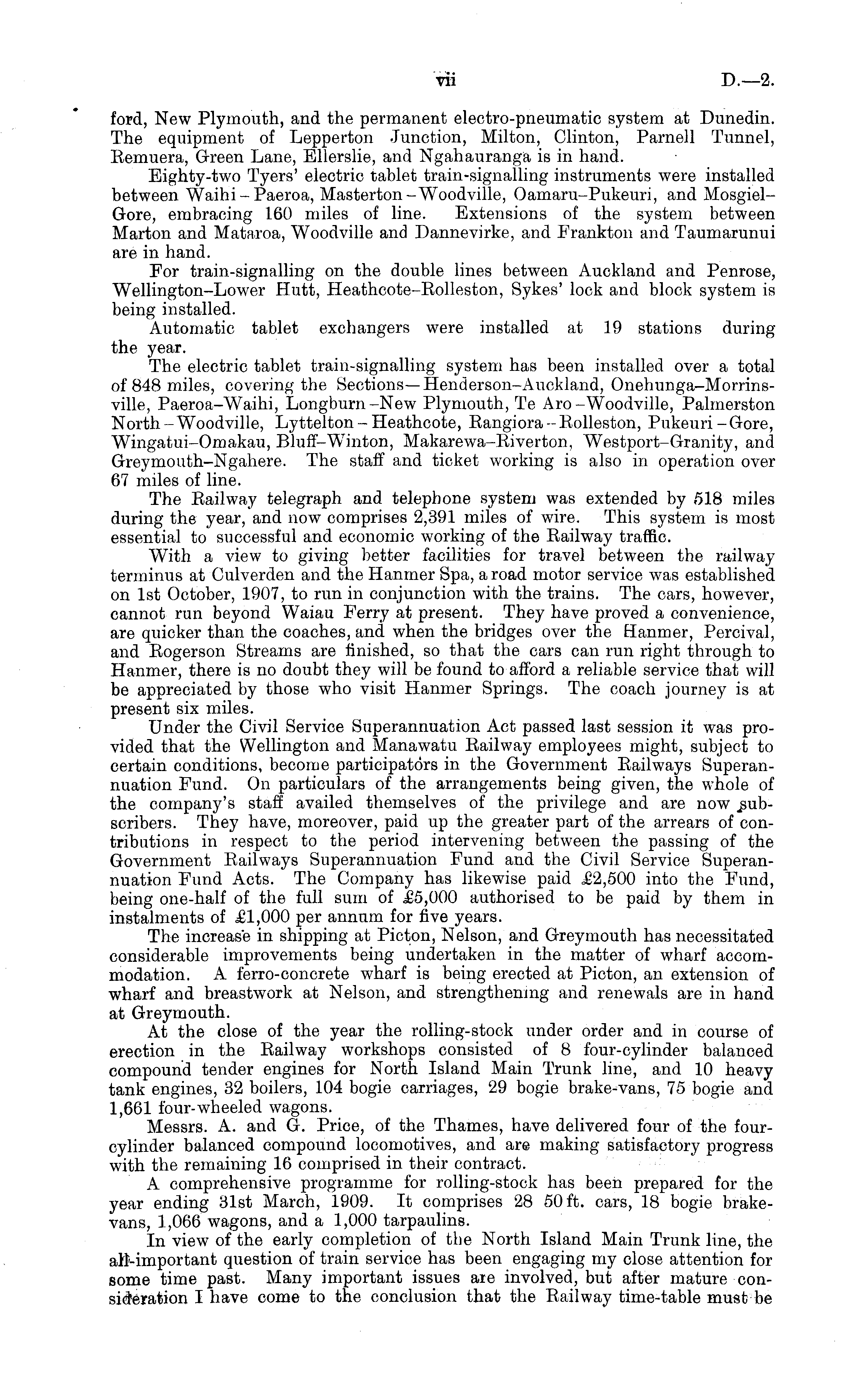 ford, New Plymouth, and the permanent electro-pneumatic system at Dunedin. The equipment of Lepperton Junction, Milton, Clinton, Parnell Tunnel, Eemuera, Green Lane, Ellerslie, and Ngahauranga is in hand. Eighty-two Tyers' electric tahlet train-signalling instruments were installed between Waihi-Paeroa, Masterton-Woodville, Oamaru-Pukeuri, and MosgielGore, embracing 160 miles of line. Extensions of the system between Marton and Mataroa, Woodville and Dannevirke, and Frankton and Taumarunui are in hand. For train-signalling on the double lines between Auckland and Penrose, Wellington-Lower Hutt, Heathcote-Kolleston, Sykes' lock and block system is being installed. Automatic tablet exchangers were installed at 19 stations during the year. The electric tablet train-signalling system has been installed over a total of 848 miles, covering the Sections—Henderson-Auckland, Onehunga—Morrinsville, Paeroa-Waihi, Longburn-New Plymouth, Te Aro-Woodville, Palmerston North-Woodville, Lyttelton - Heathcote, Eangiora-Eolleston, Pukeuri-Gore, Wingatui-Omakau, Bluff-Winton, Makarewa-Kiverton, Westport-Granity, and Greymouth-Ngahere. The staff and ticket working is also in operation over 67 miles of line. The Eailway telegraph and telephone system was extended by 518 miles during the year, and now comprises 2,391 miles of wire. This system is most essential to successful and economic working of the Eailway traffic. With a view to giving better facilities for travel between the railway terminus at Culverden and the Hanmer Spa, a road motor service was established on Ist October, 1907, to run in conjunction with the trains. The cars, however, cannot run beyond Waiau Ferry at present. They have proved a convenience, are quicker than the coaches, and when the bridges over the Banmer, Percival, and Eogerson Streams are finished, so that the cars can run right through to Hanmer, there is no doubt they will be found to afford a reliable service that will be appreciated by those who visit Hanmer Springs. The coach journey is at present six miles. Under the Civil Service Superannuation Act passed last session it was provided that the Wellington and Manawatu Eailway employees might, subject to certain conditions, become participators in the Government Eailways Superannuation Fund. On particulars of the arrangements being given, the whole of the company's staff availed themselves of the privilege and are now subscribers. They have, moreover, paid up the greater part of the arrears of contributions in respect to the period intervening between the passing of the Government Eailways Superannuation Fund and the Civil Service Superannuation Fund Acts. The Company has likewise paid £2,500 into the Fund, being one-half of the full sum of £5,000 authorised to be paid by them in instalments of £1,000 per annum for five years. The increase in shipping at Picton, Nelson, and Greymouth has necessitated considerable improvements being undertaken in the matter of wharf accommodation. A ferro-concrete wharf is being erected at Picton, an extension of wharf and breastwork at Nelson, and strengthening and renewals are in hand at Greymouth. At the close of the year the rolling-stock under order and in course of erection in the Eailway workshops consisted of 8 four-cylinder balanced compound tender engines for North Island Main Trunk line, and 10 heavy tank engines, 32 boilers, 104 bogie carriages, 29 bogie brake-vans, 75 bogie and 1,661 four-wheeled wagons. Messrs. A. and G. Price, of the Thames, have delivered four of the fourcylinder balanced compound locomotives, and are making satisfactory progress with the remaining 16 comprised in their contract. A comprehensive programme for rolling-stock has been prepared for the year ending 31st March, 1909. It comprises 28 50 ft. cars, 18 bogie brakevans, 1,066 wagons, and a 1,000 tarpaulins. In view of the early completion of the North Island Main Trunk line, the all-important question of train service has been engaging my close attention for some time past. Many important issues are involved, but after mature consideration I have come to the conclusion that the Eailway time-table must be