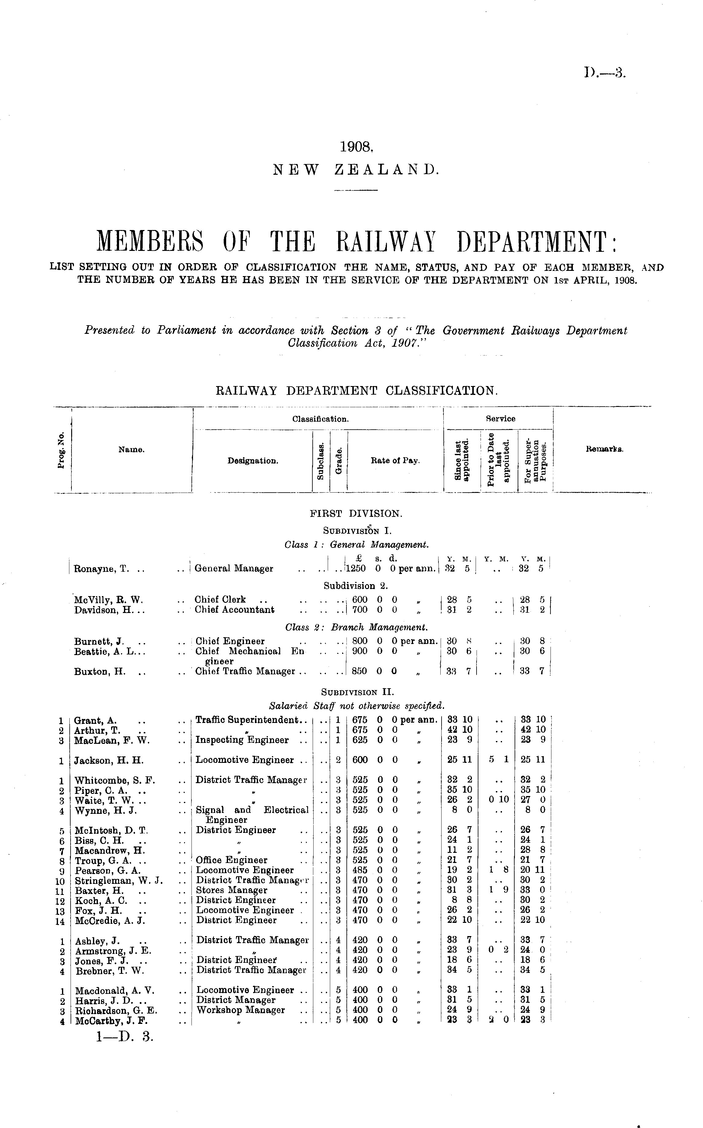 MEMBERS OF THE RAILWAY DEPARTMENT: LIST SETTING OUT IN ORDER OF CLASSIFICATION THE NAME, STATUS, AND PAY OF EACH MEMBER, AND THE NUMBER OF YEARS HE HAS BEEN IN THE SERVICE OF THE DEPARTMENT ON 1st APRIL, 1908.