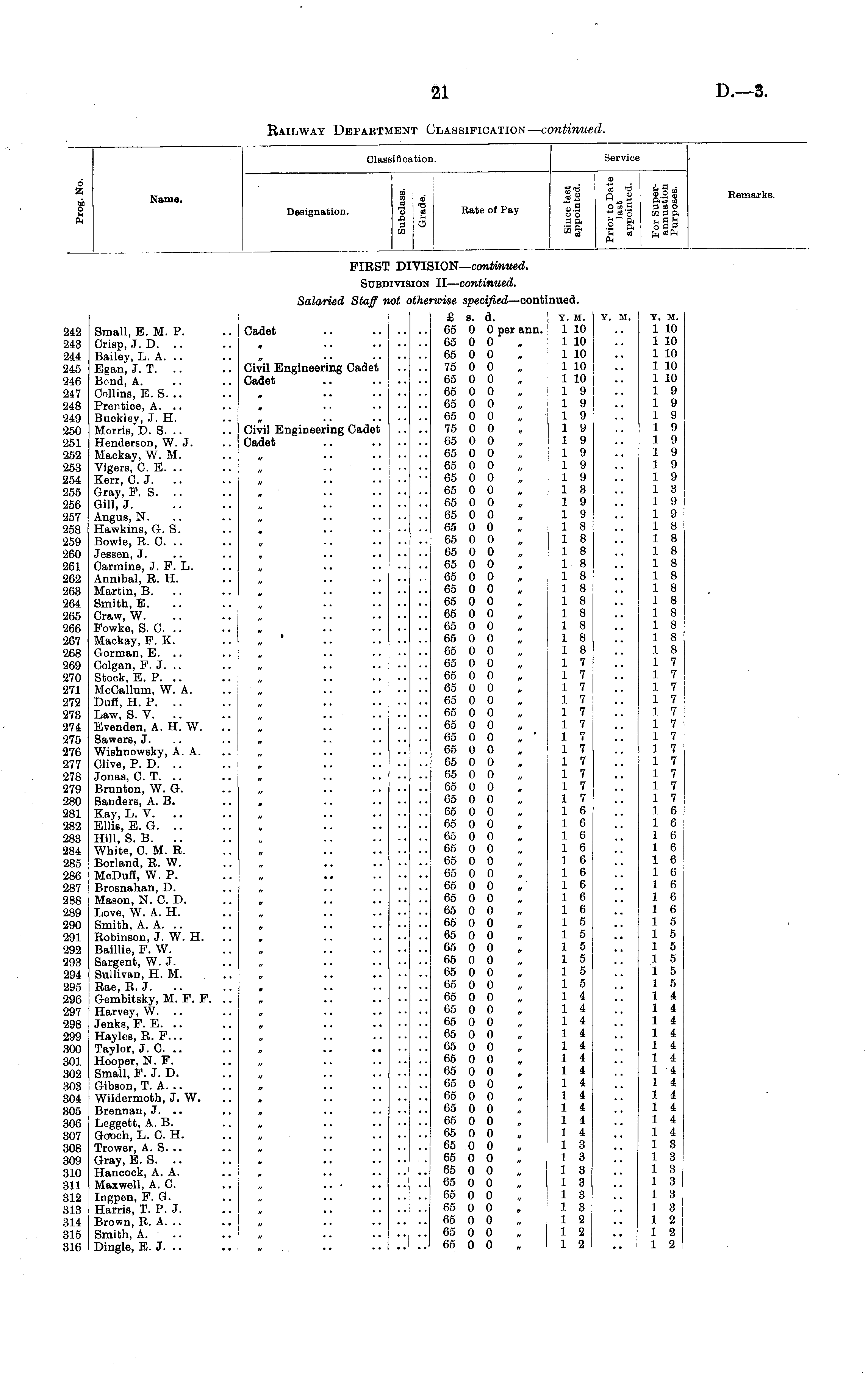 Classification. Service 6 A s Name. Designation. to ■° t p O to Kate of Pay it o o a & ij Hi O <r. ~ D * O in Cβ fa *Pi Kemarks. FIRS' ! D: [VIE SION— continued. SUB] IIVI! SION II— continued. Ma !48 Hi i45 146 !48 149 M50 !51 153 !S8 !64 use 166 157 !68 169 160 Sβ] !63 168 164 168 166 167 168 169 170 171 172 178 !74 !75 176 !77 !7S 179 !80 181 182 S88 !84 S86 186 !87 !88 189 190 !9l 193 198 I'M 196 !97 m I'M soo (01 S02 108 S04 (Oβ (06 107 (08 (08 110 ill iia 118 114 (18 116 Small, E. M. P. Crisp, J. D. .. Bailey, L. A. .. Egan, J. T. .. Bend, A. Collins, E. S. .. Prentice, A. .. Buckley, J. H. Morris, D. S. .. Henderson, W. J. Mackay, W. M. Vigers, C. E. .. Kerr, C. J. Gray, F. S. .. Gill, J. Angus, N. Hawkins, G. S. Bowie, R. C. .. Jessen, J. Carmine, J. F. L. Annibal, E. H. Martin, B. Smith, E. Craw, W. Fowke, S. C. .. Mackay, F. K. Gorman, E. .. Colgan, F. J. .. Stock, E. P. .. McCallum, W. A. Duff, H. P. .. Law, S. V. .. Evenden, A. H. W. Sawers, J. Wishnowsky, A. A. Clive, P. D. .. Jonas, C. T. .. Brunton, W. G. Sanders, A. B. Kay, L. V. .. Ellis, E. G. .. Hill, S. B. .. White, C. M. B. Borland, R. W. McDuff, W. P. Brosnahan, D. Mason, N. C. D. Love, W. A. H. Smith, A. A. .. Robinson, J. W. H. Baillie, F. W. Sargent, W. J. Sullivan, H. M. . .. Rae, R. J. Gembitsky, M. F. F. Harvey, W. Jenks, F. E. .. Hayles, R. F... Taylor, J. C. .. Hooper, N. F. Small, F. J. D. Gibson, T. A. .. Wildermoth, J. W. Brennau, J. .. Leggett, A. B. Gcroch, L. C. H. Trower, A. S. .. Gray, E. S. .. Hancock, A. A. Maxwell, A. C. Ingpen, F. G. Harris, T. P.J. Brown, R. A. .. Smith, A. .. Dingle, E. J. .. Salaried Staff Cadet Civil Engineering Cadet Cadet Civil Engineering Cadet Cadet • • • * • „ . . • • lOt i ithet ■wise specified —cont: £ s. d. 65 0 0 per ann. 65 0 0 65 0 0 75 0 0 65 0 0 65 0 0 65 0 0 65 0 0 75 0 0 65 0 0 65 0 0 65 0 0 65 0 0 65 0 0 65 0 0 65 0 0 65 0 0 65 0 0 65 0 0 65 0 0 65 0 0 65 0 0 65 0 0 65 0 0 65 0 0 65 0 0 65 0 0 65 0 0 65 0 0 65 0 0 65 0 0 65 0 0 65 0 0 65 0 0 65 0 0 65 0 0 65 0 0 65 0 0 65 0 0 65 0 0 65 0 0 65 0 0 65 0 0 65 0 0 65 0 0 65 0 0 65 0 0 65 0 0 65 0 0 65 0 0 65 0 0 65 0 0 65 0 0 65 0 0 65 0 0 65 0 0 65 0 0 65 0 0 65 0 0 65 0 0 65 0 0 65 0 0 65 0 0 65 0 0 65 0 0 65 0 0 65 0 0 65 0 0 65 0 0 65 0 0 65 0 0 65 0 0 65 0 0 65 0 0 65 0 0 inued. Y. M. 1 10 1 10 1 10 1 10 1 10 1 9 1 9 1 9 1 9 1 9 1 9 1 9 1 9 1 3 1 9 1 9 1 8 1 8 1 8 1 8 1 8 1 8 1 8 1 8 1 8 1 8 1 8 1 7 1 7 1 7 1 7 1 7 1 7 1 7 1 7 1 7 1 7 1 7 1 7 1 6 1 6 1 6 1 6 1 6 1 6 1 6 1 6 1 6 1 5 1 5 1 5 1 5 1 5 1 5 1 4 1 4 1 4 1 4 1 4 1 4 1 4 1 4 1 4 1 4 1 4 1 4 1 3 1 3 1 3 1 3 1 3 1 3 1 2 1 2 1 2 Y. M. Y. M. 1 10 1 10 1 10 1 10 1 10 1 9 1 9 1 9 1 9 1 9 1 9 1 9 1 9 1 3 1 9 1 9 1 8 1 8 1 8 1 8 1 8 1 8 1 8 1 8 1 8 1 8 1 8 1 7 1 7 1 7 1 7 1 7 1 7 1 7 1 7 1 7 1 7 1 7 1 7 1 6 1 6 1 6 1 6 1 6 1 6 1 6 1 6 1 6 1 5 1 5 1 5 1 5 1 5 1 5 1 4 1 4 1 4 1 4 1 4 1 4 1 i 1 4 1 4 1 4 1 4 1 4 1 3 1 3 1 3 1 3 1 3 1 3 1 2 i a 1 2